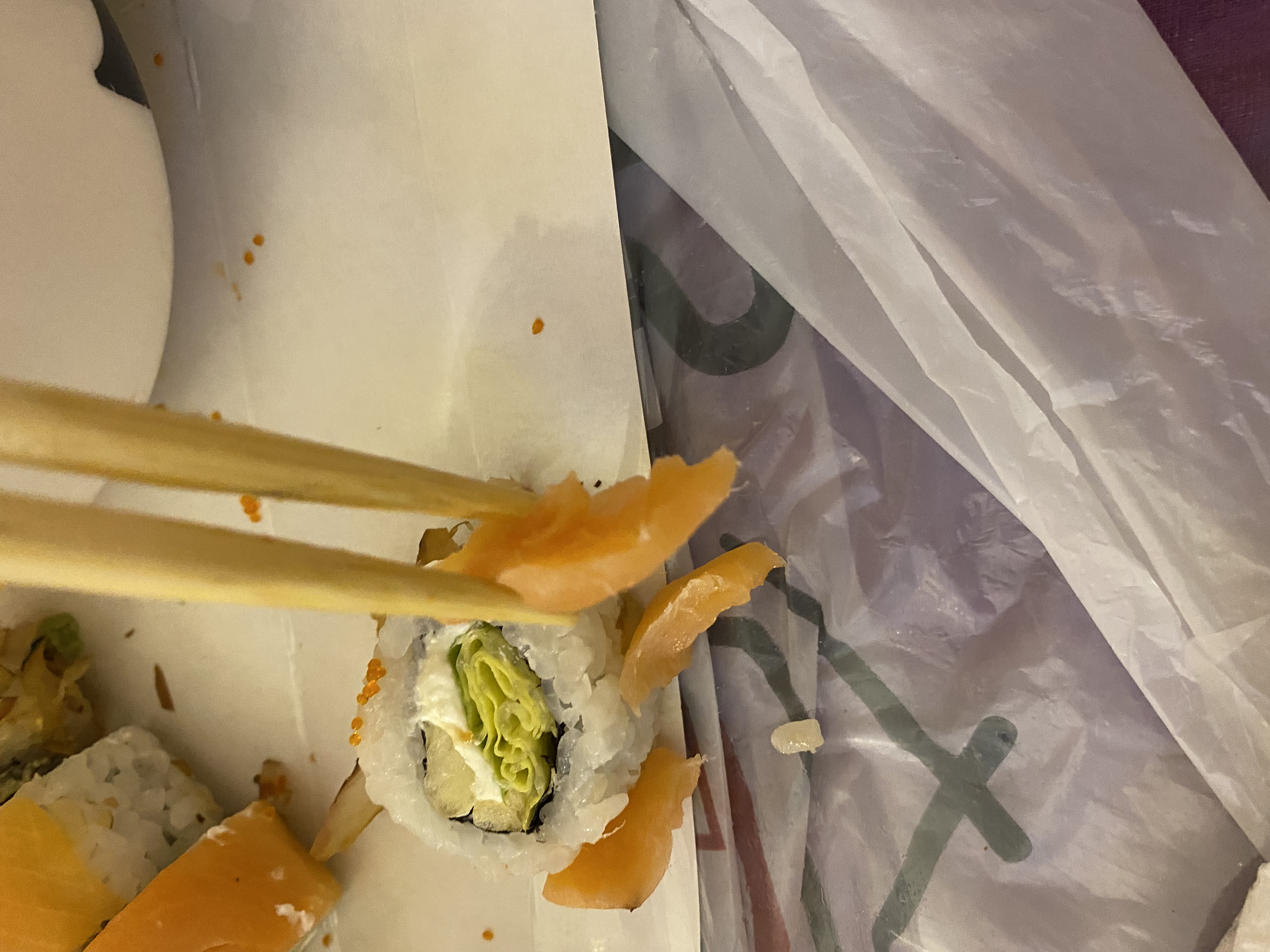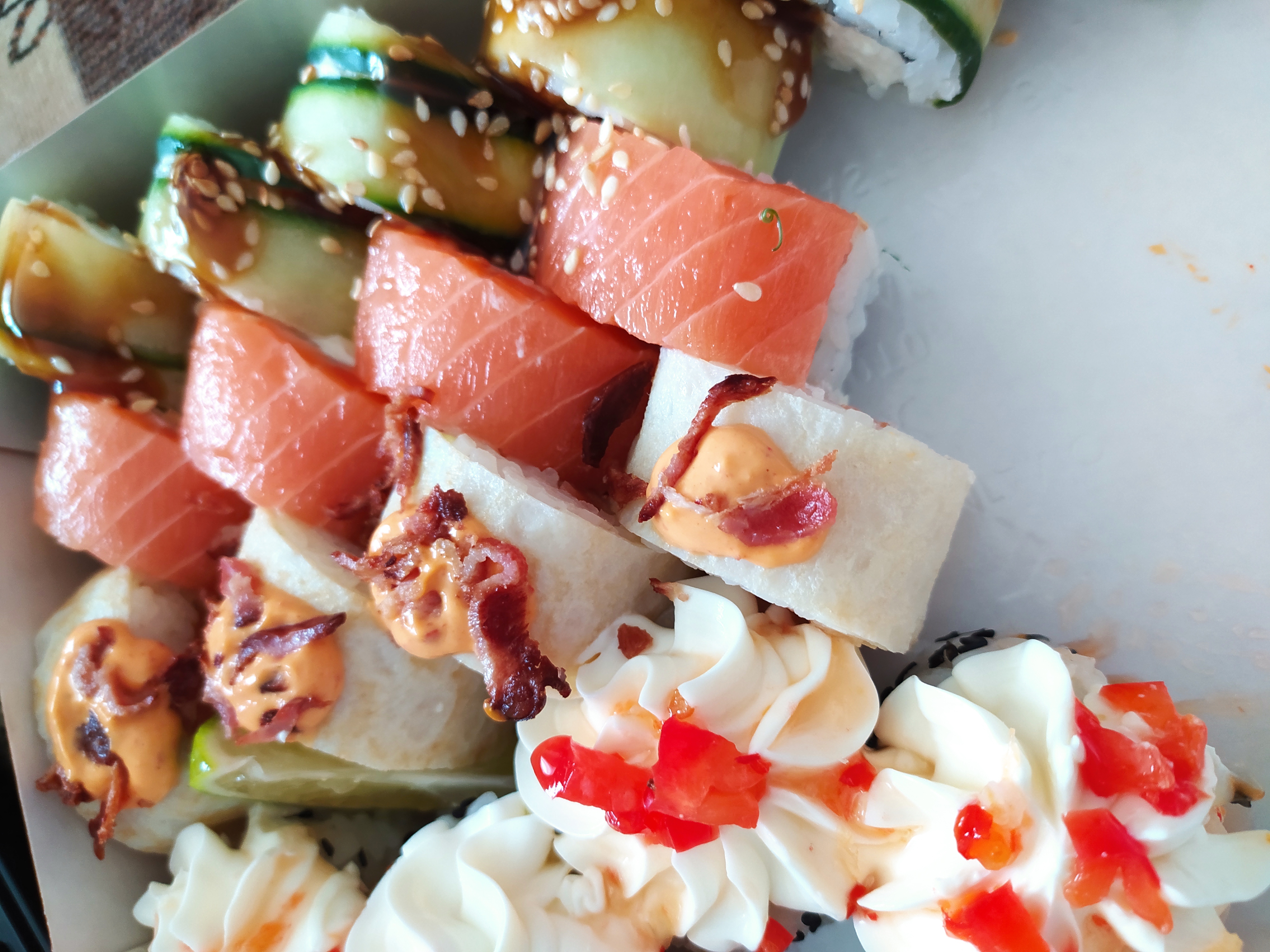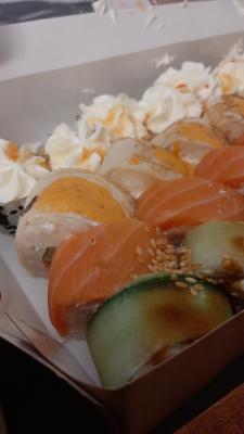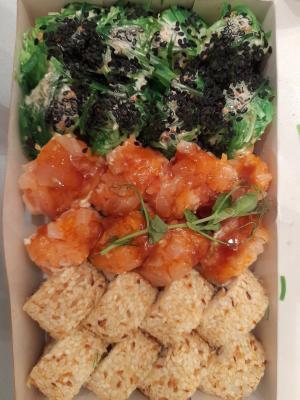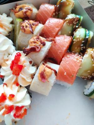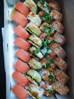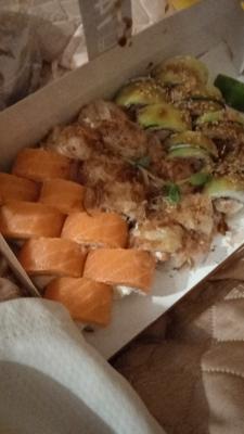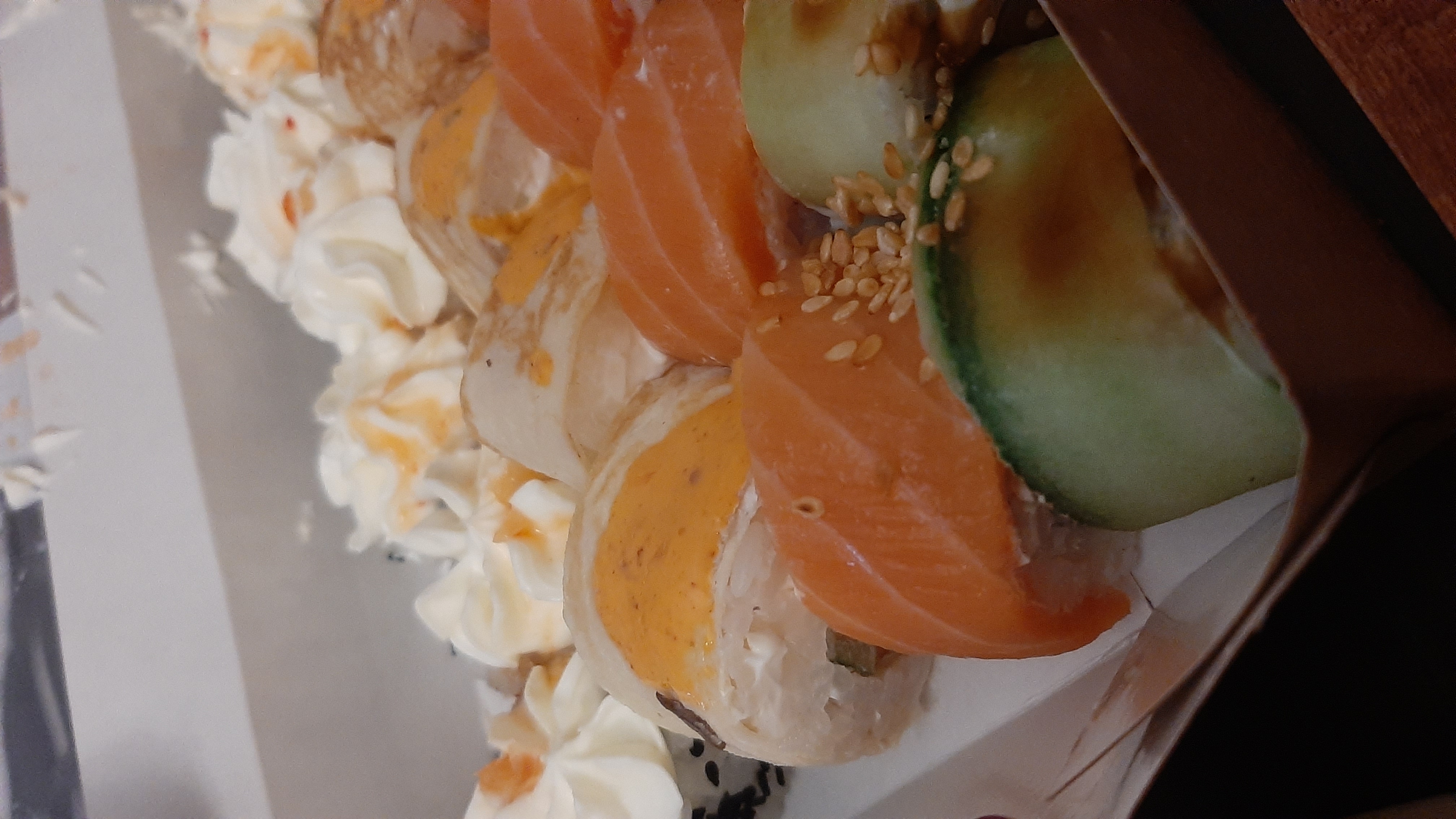 Состав: лосось, огурец, сливочный сыр, соус спайси, кунжут кимчи, соус терияки, кляр, сухари панко
