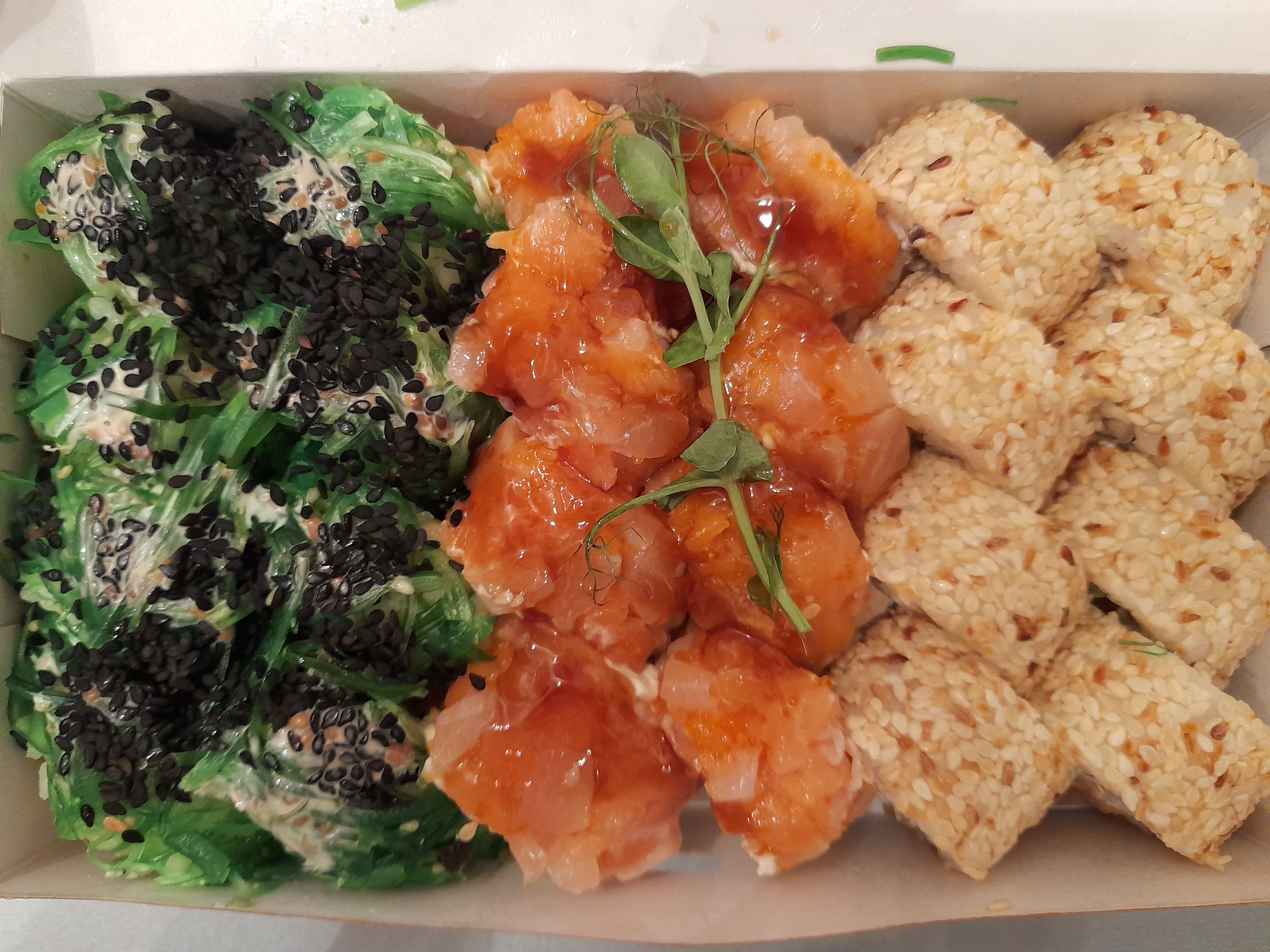 Состав: сунец, авокадо, сливочный сыр, кунжутное масло, картофель пай, соус терияки, кляр, сухари панко