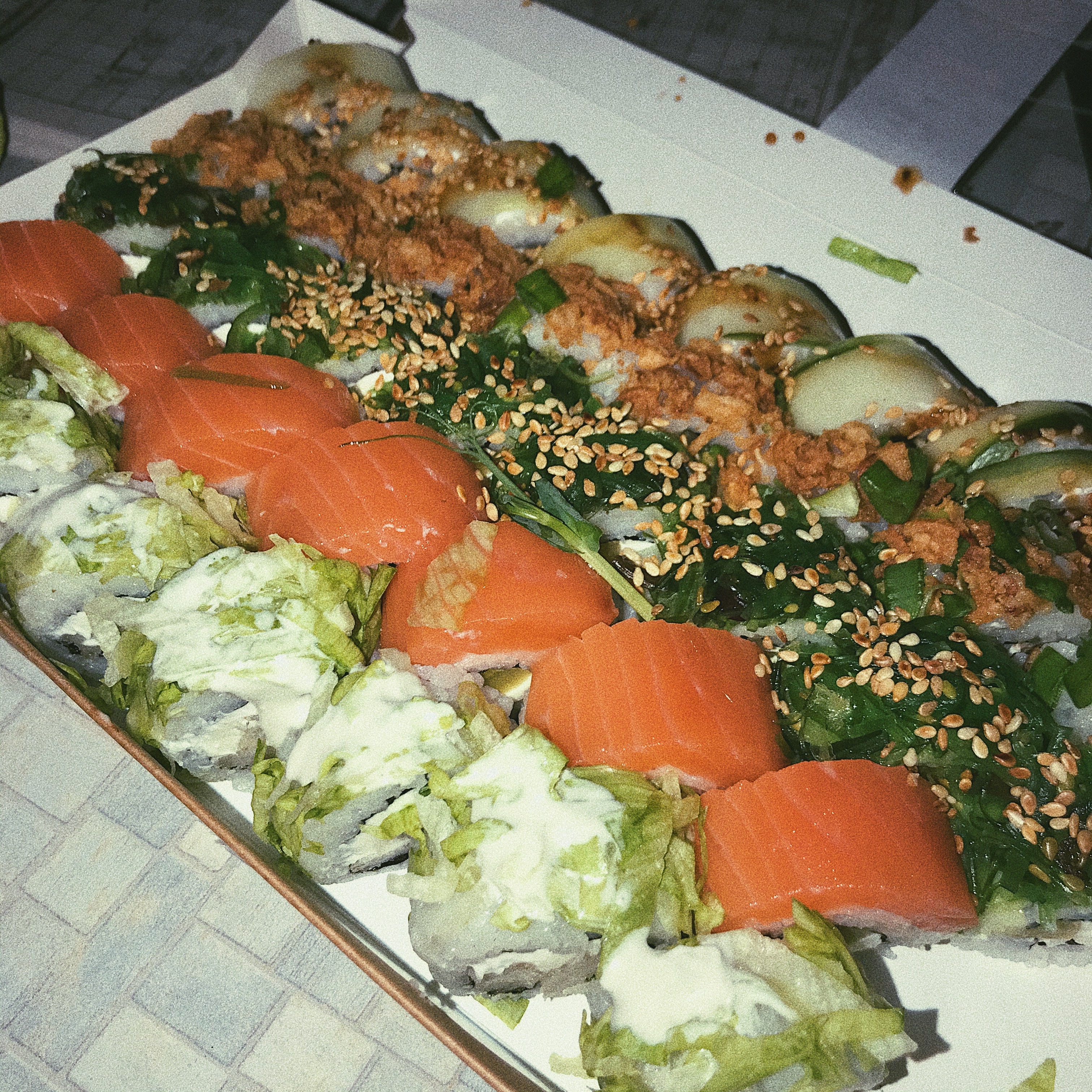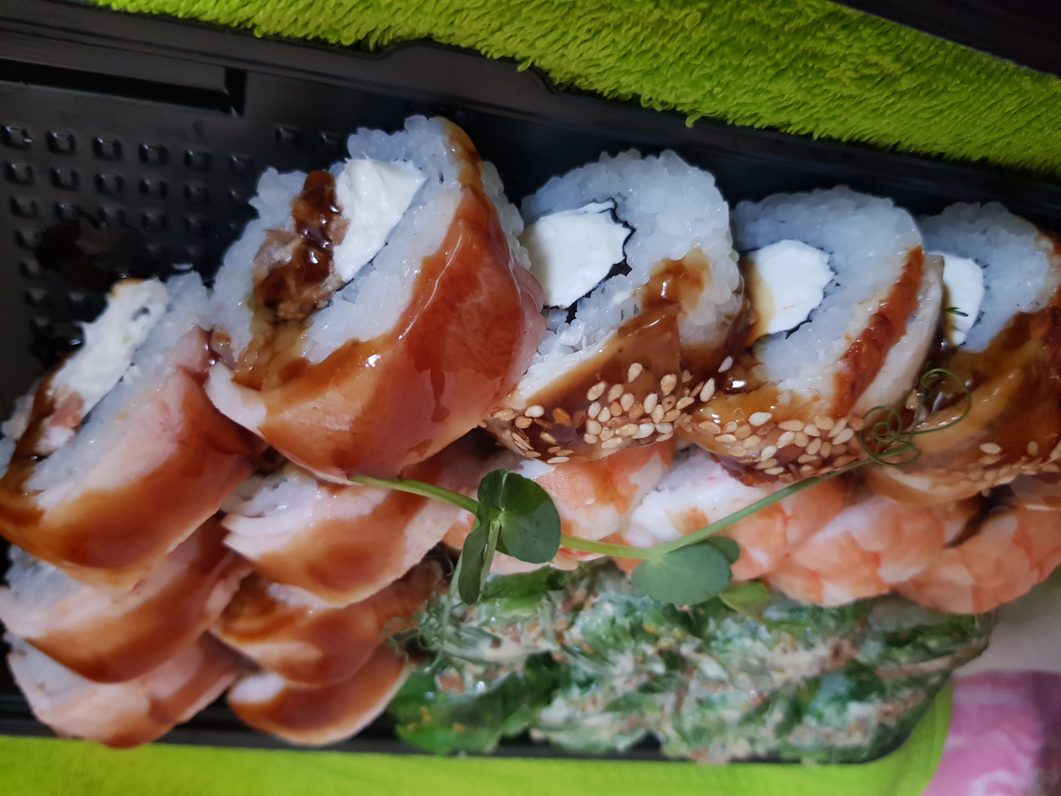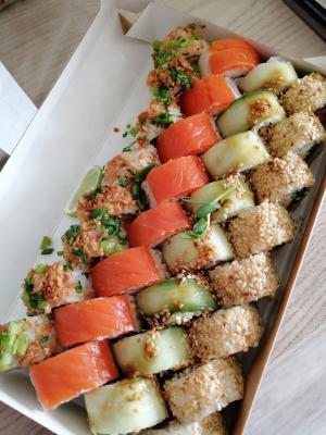 Состав: лосось, огурец, сливочный сыр, соус спайси, кунжут кимчи, соус терияки, кляр, сухари панко