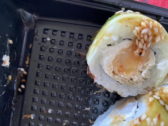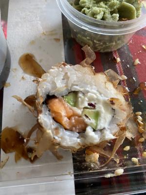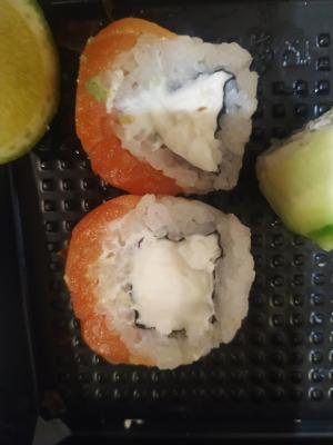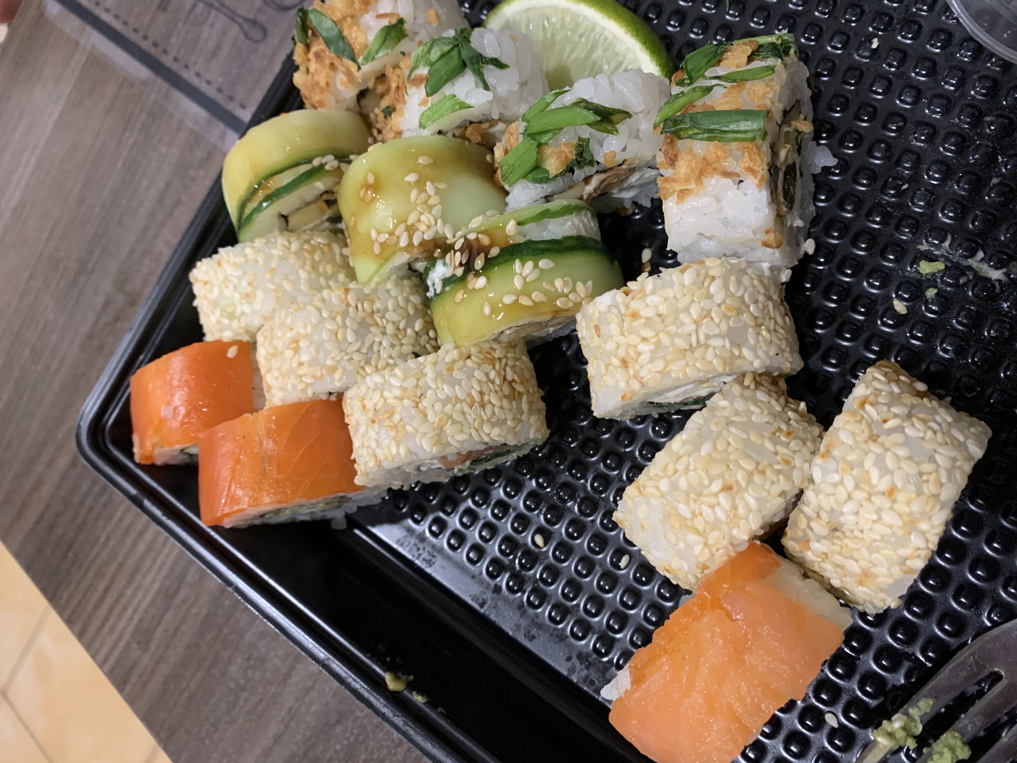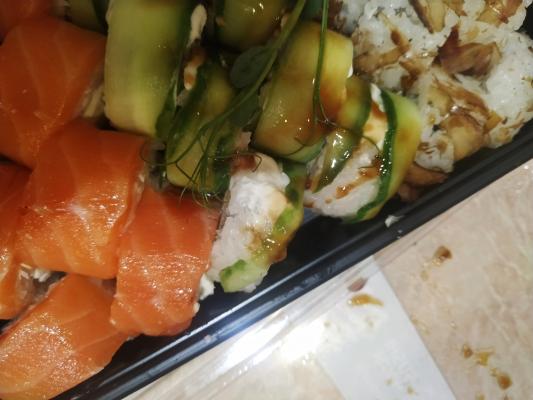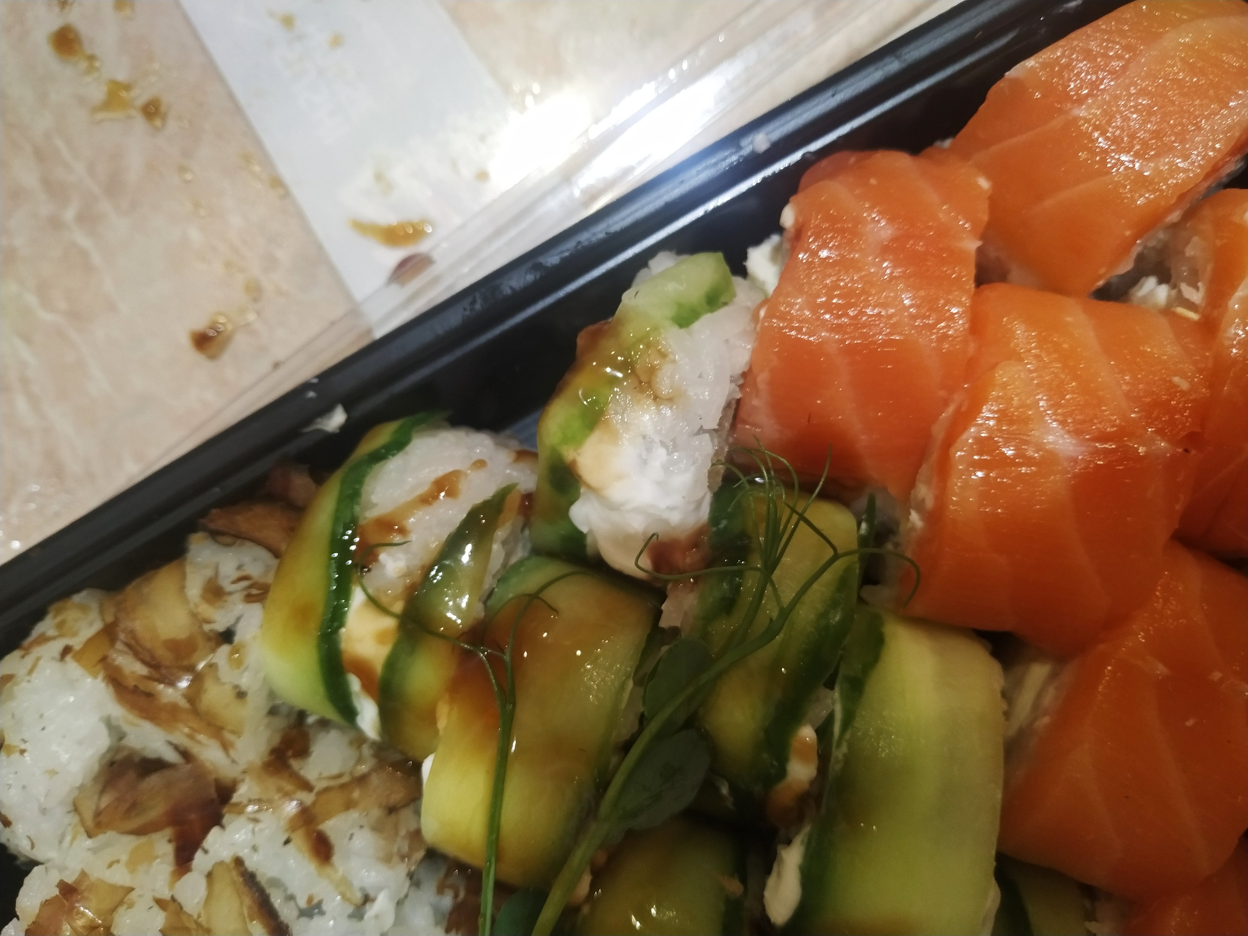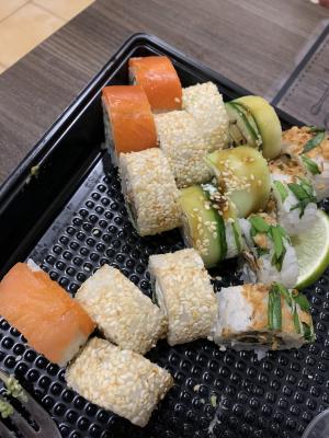 Заказывали суши навынос на определённое время.  Все готово было вовремя. Роллы свежие, хорошо приготовлены. И горячие роллы и сладкие тоже понравились. Горячее с крылышками и рисовыми шариками вкусное) Еще и ролл в подарок. В общем, вдвоём с мужем в один заход даже не справились))) Спасибо за акцию