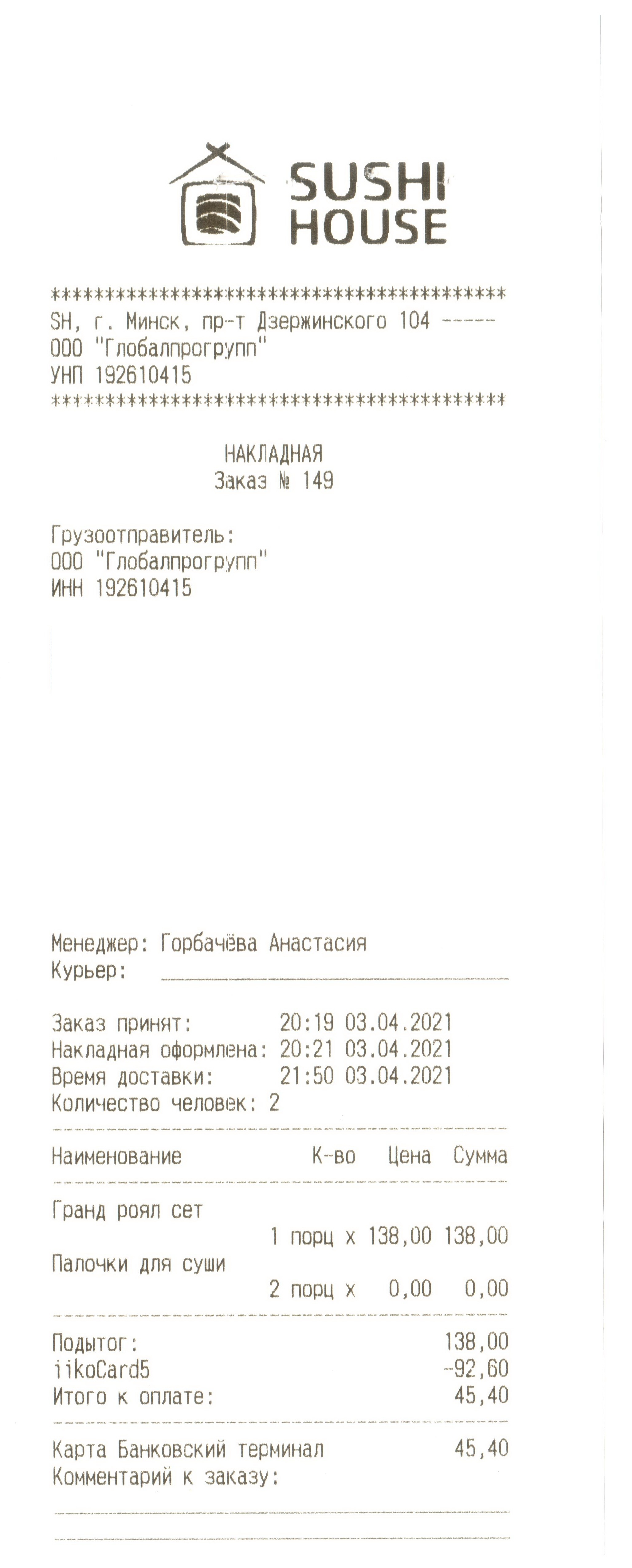 Заказываю у вас уже не в первый раз. Суши очень вкусные, свежие, много начинки. Доставка всегда вовремя. Советую. Спасибо Sushi House