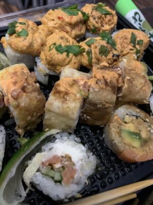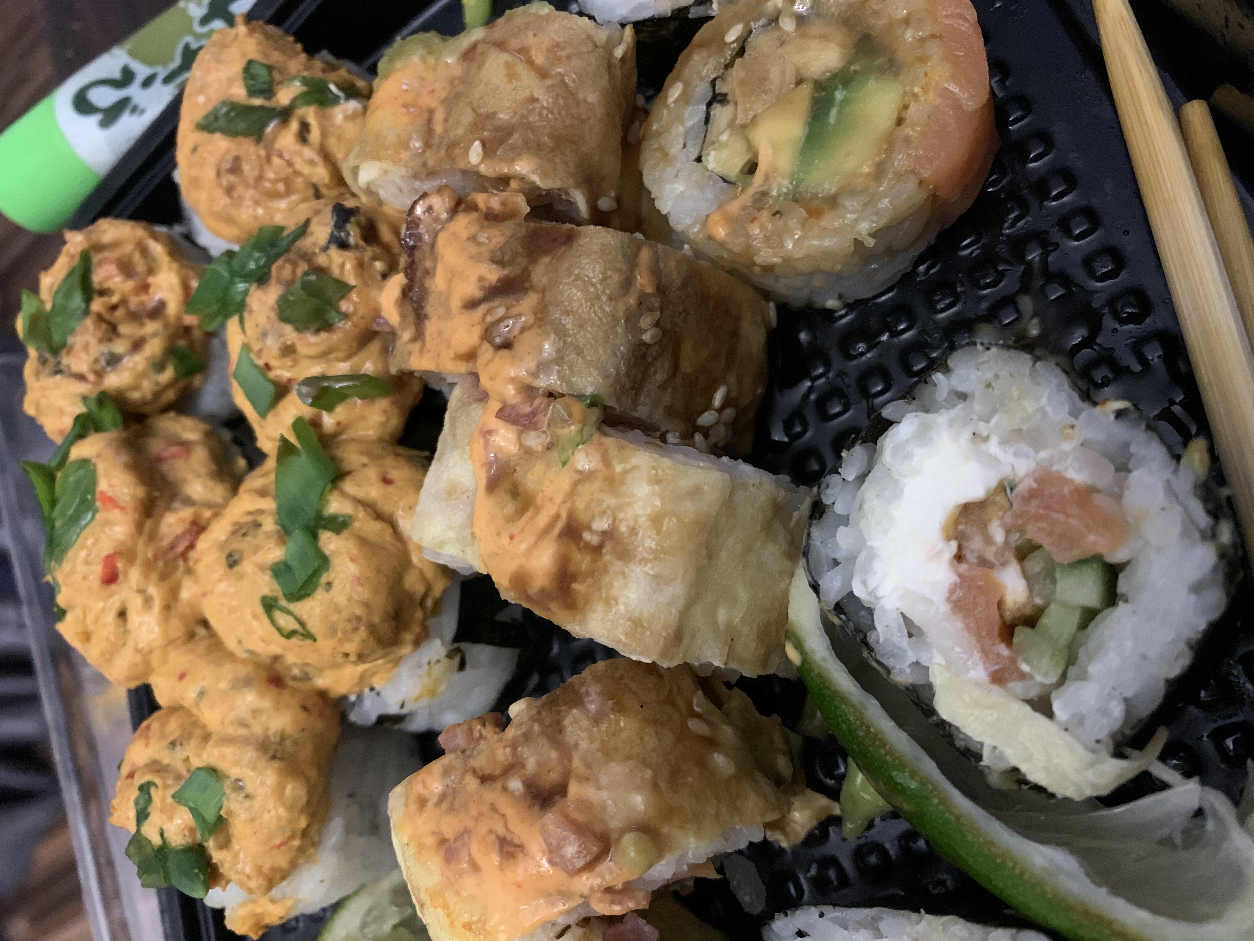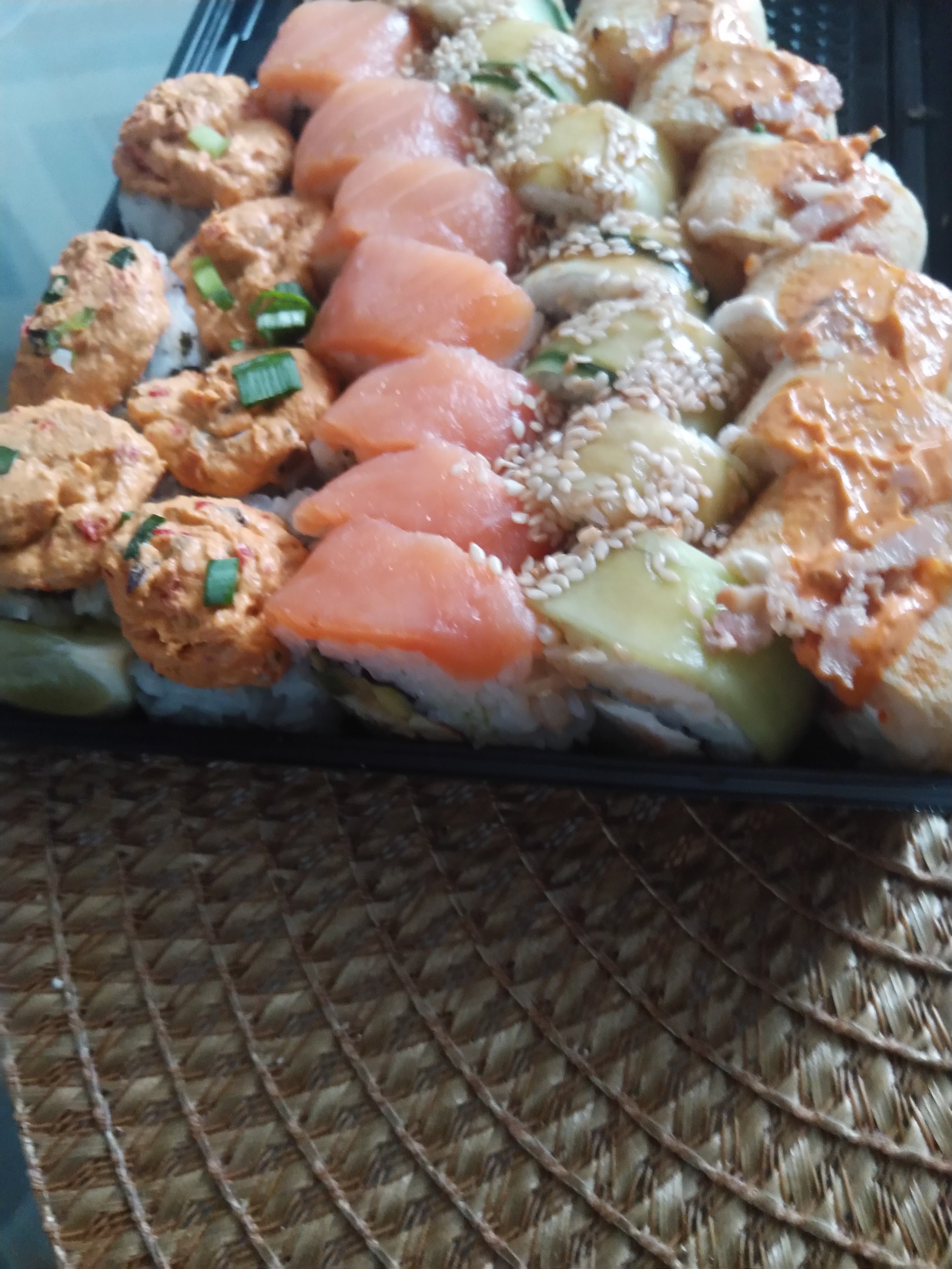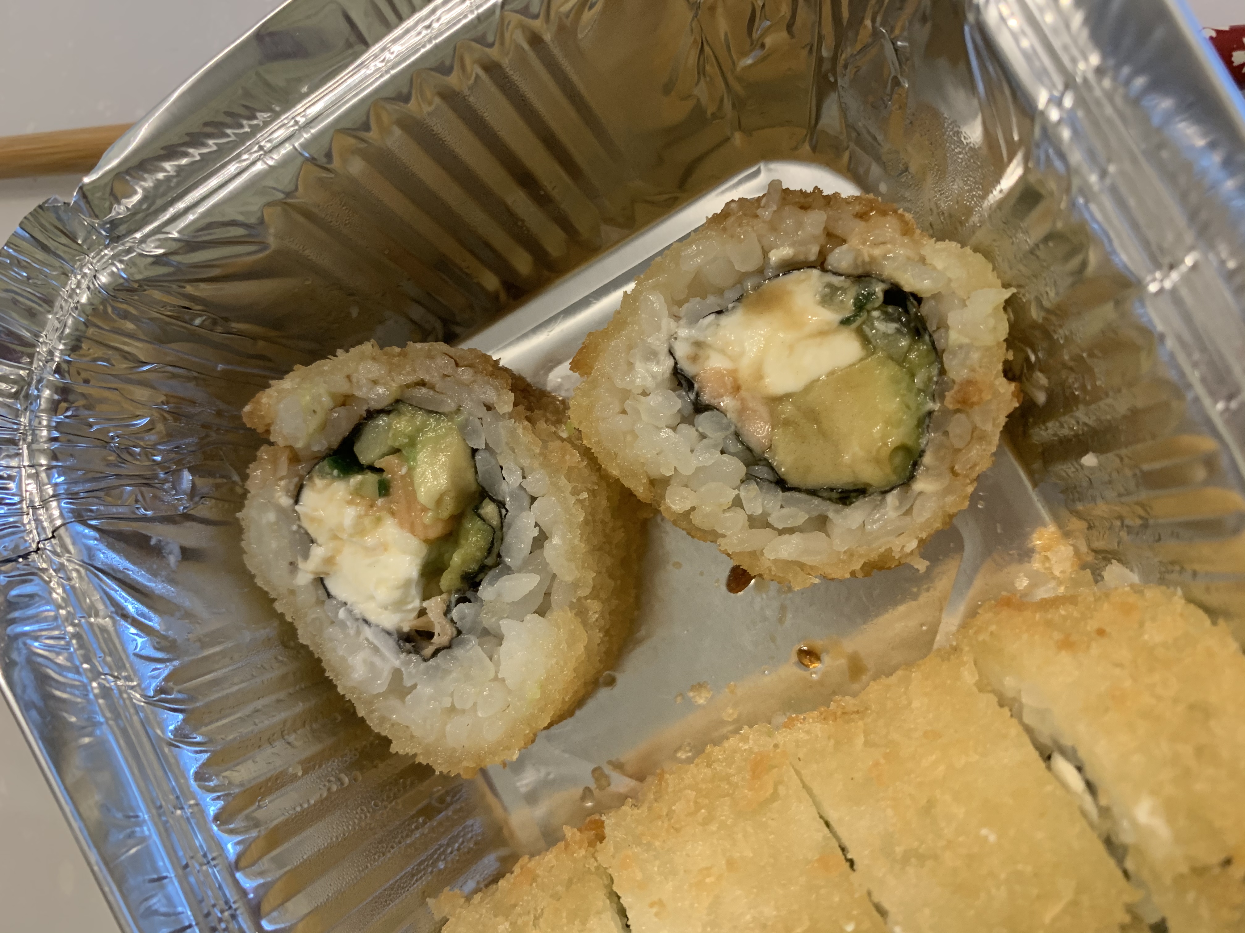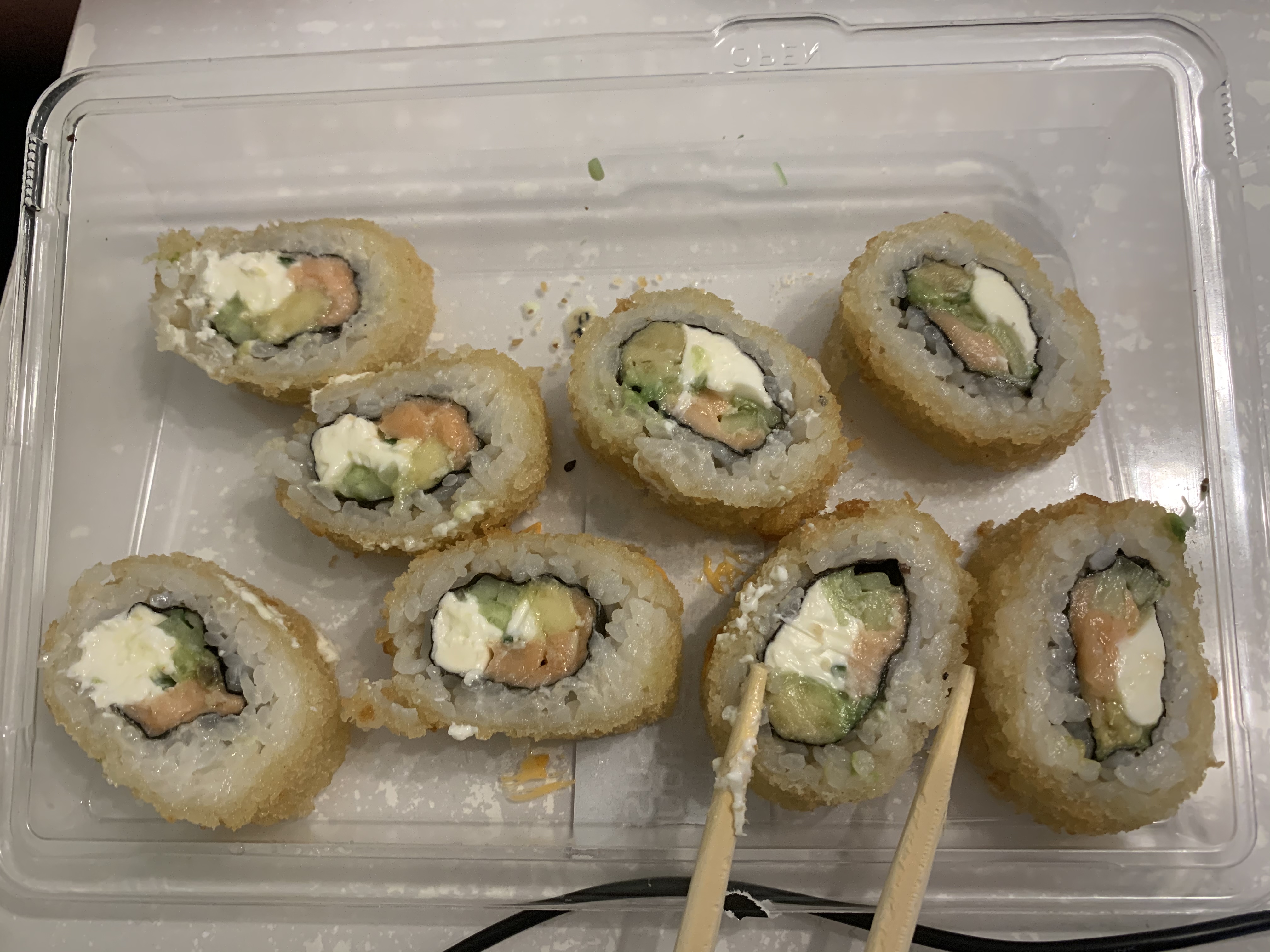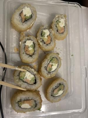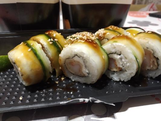 Состав: лосось, огурец, сливочный сыр, соус спайси, кунжут кимчи, соус терияки, кляр, сухари панко