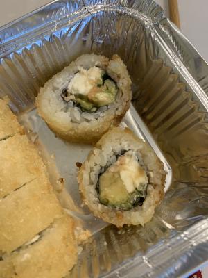 Состав: сунец, авокадо, сливочный сыр, кунжутное масло, картофель пай, соус терияки, кляр, сухари панко