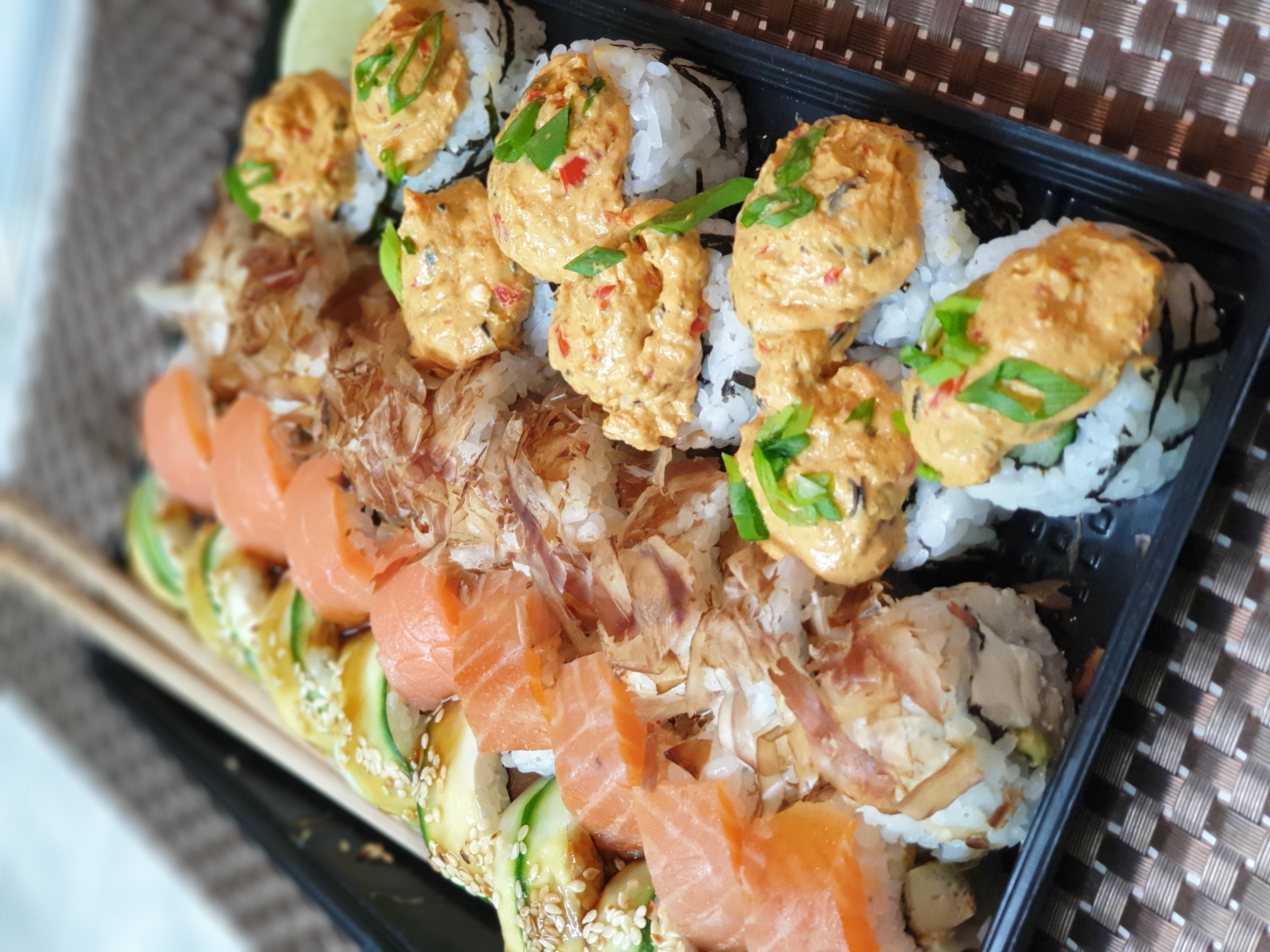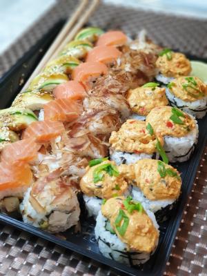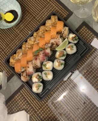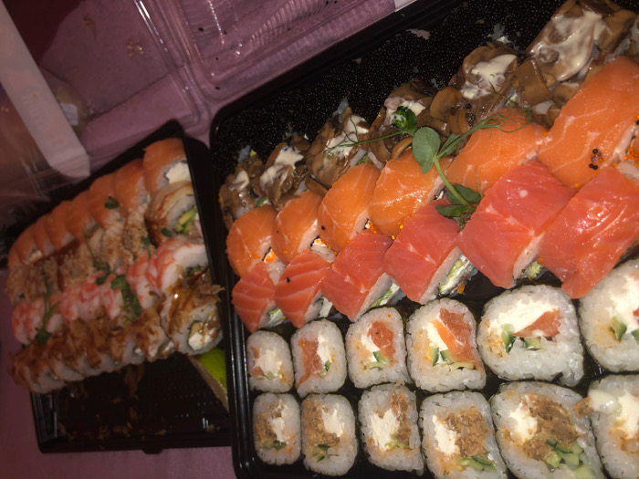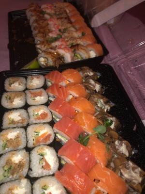 Брали сет из 80 шт. Скажу вам, вкусно, прекрасно. Доставка в час как заявлено. По сливкам. На 4х нашлись от души, даже осталось. Вкусно, свежее, разнообразие. Сытно. В подарок сладкий рол.