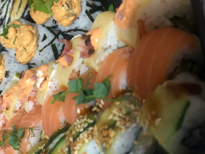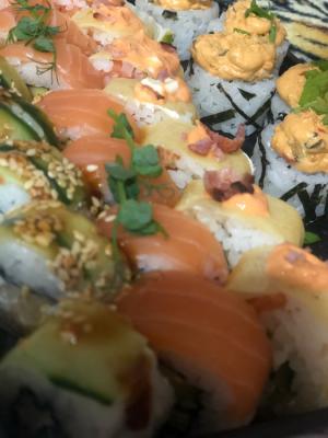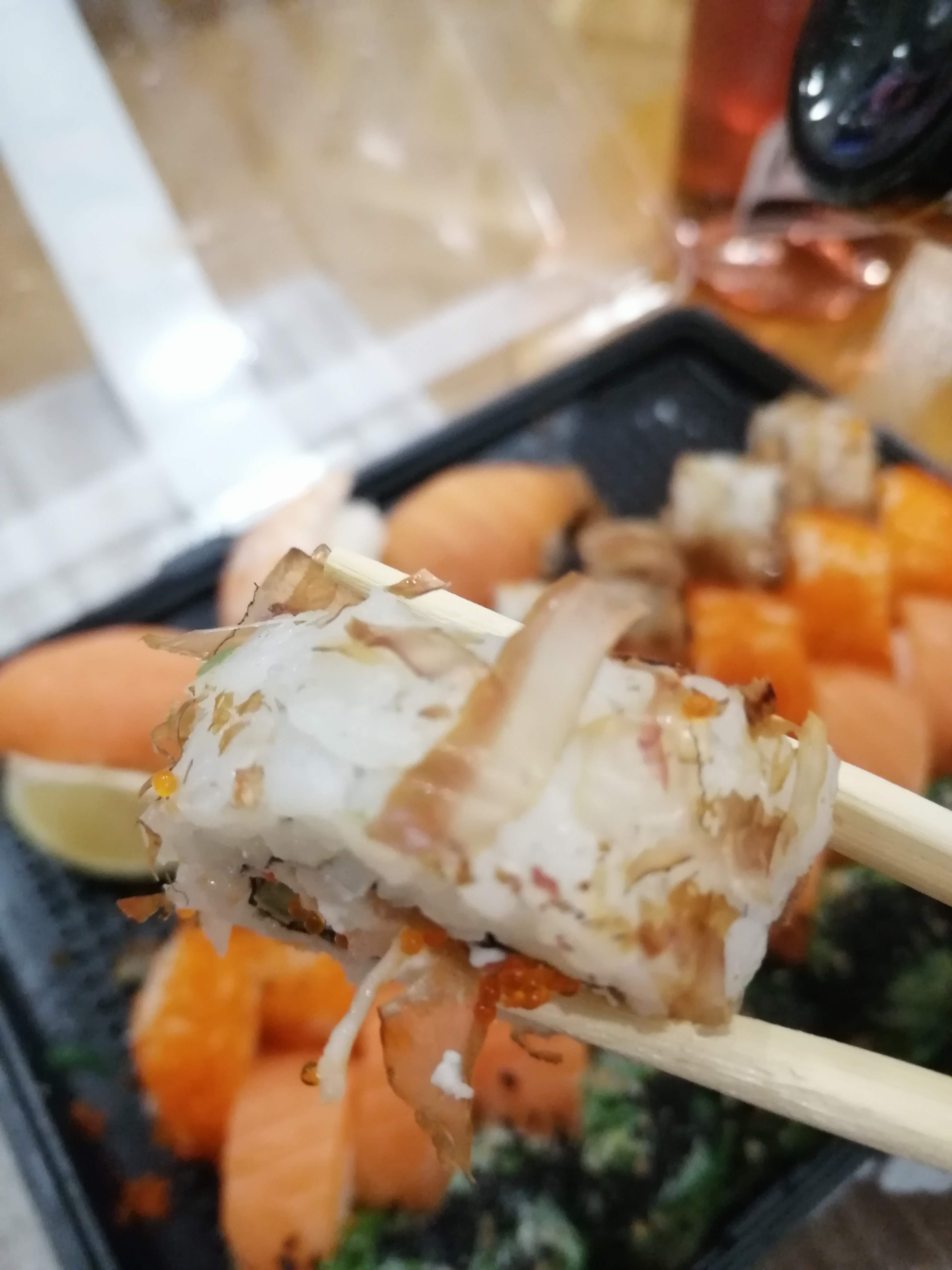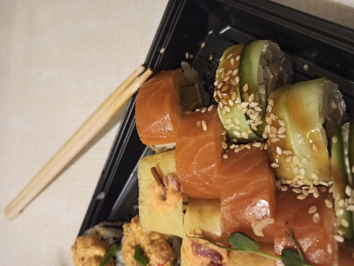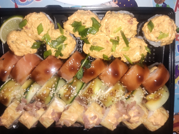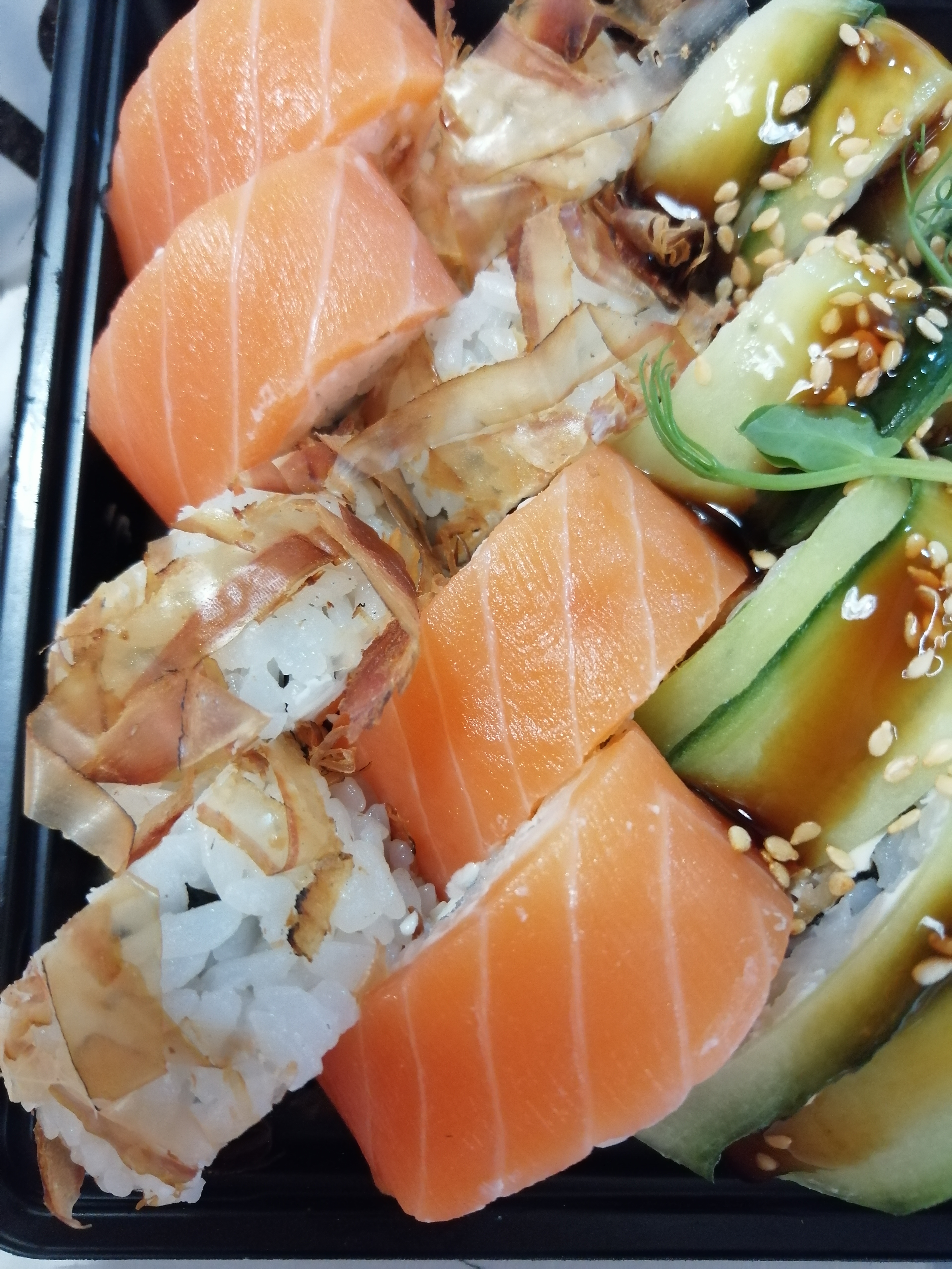 Состав: лосось, огурец, сливочный сыр, соус спайси, кунжут кимчи, соус терияки, кляр, сухари панко