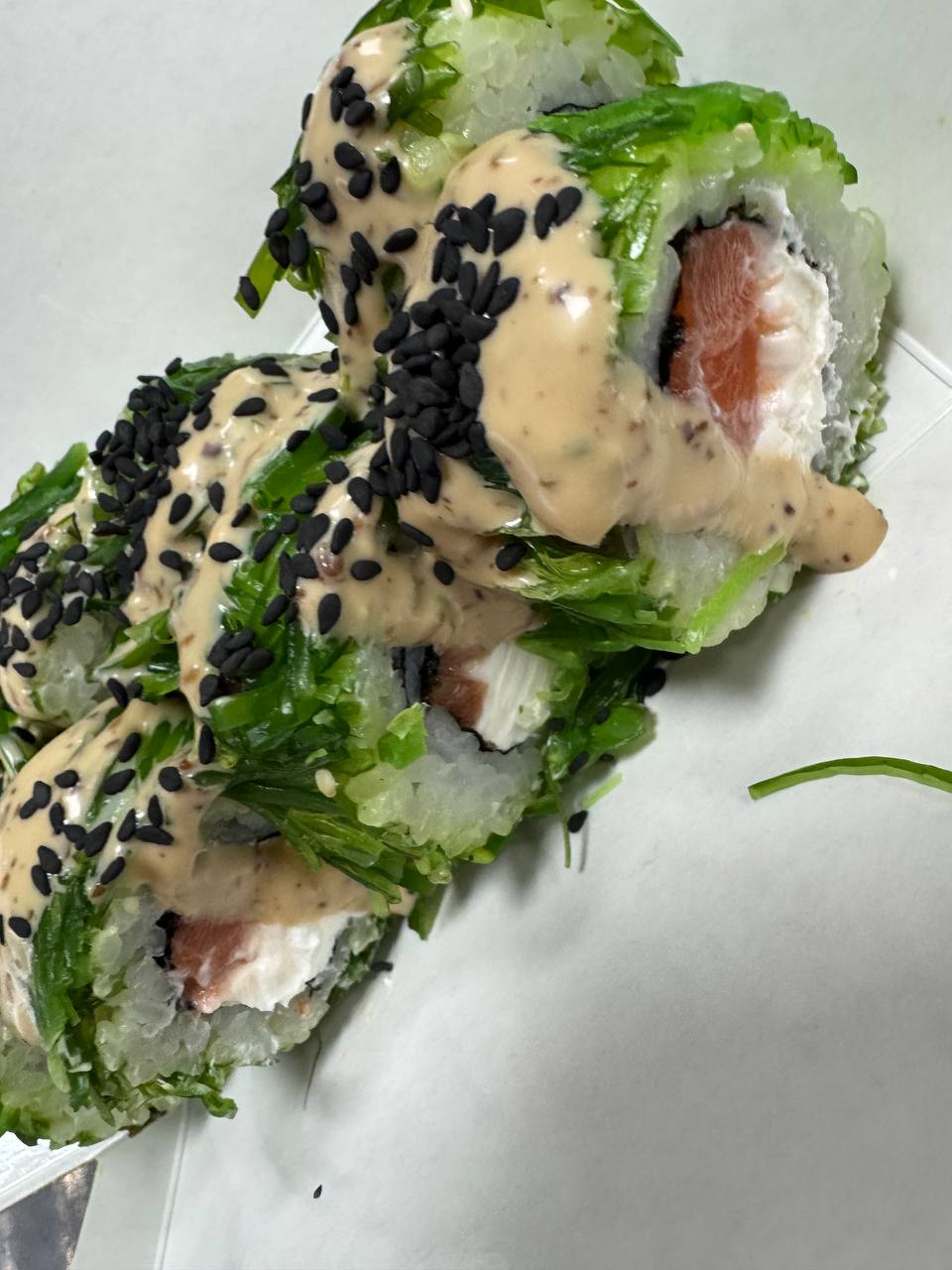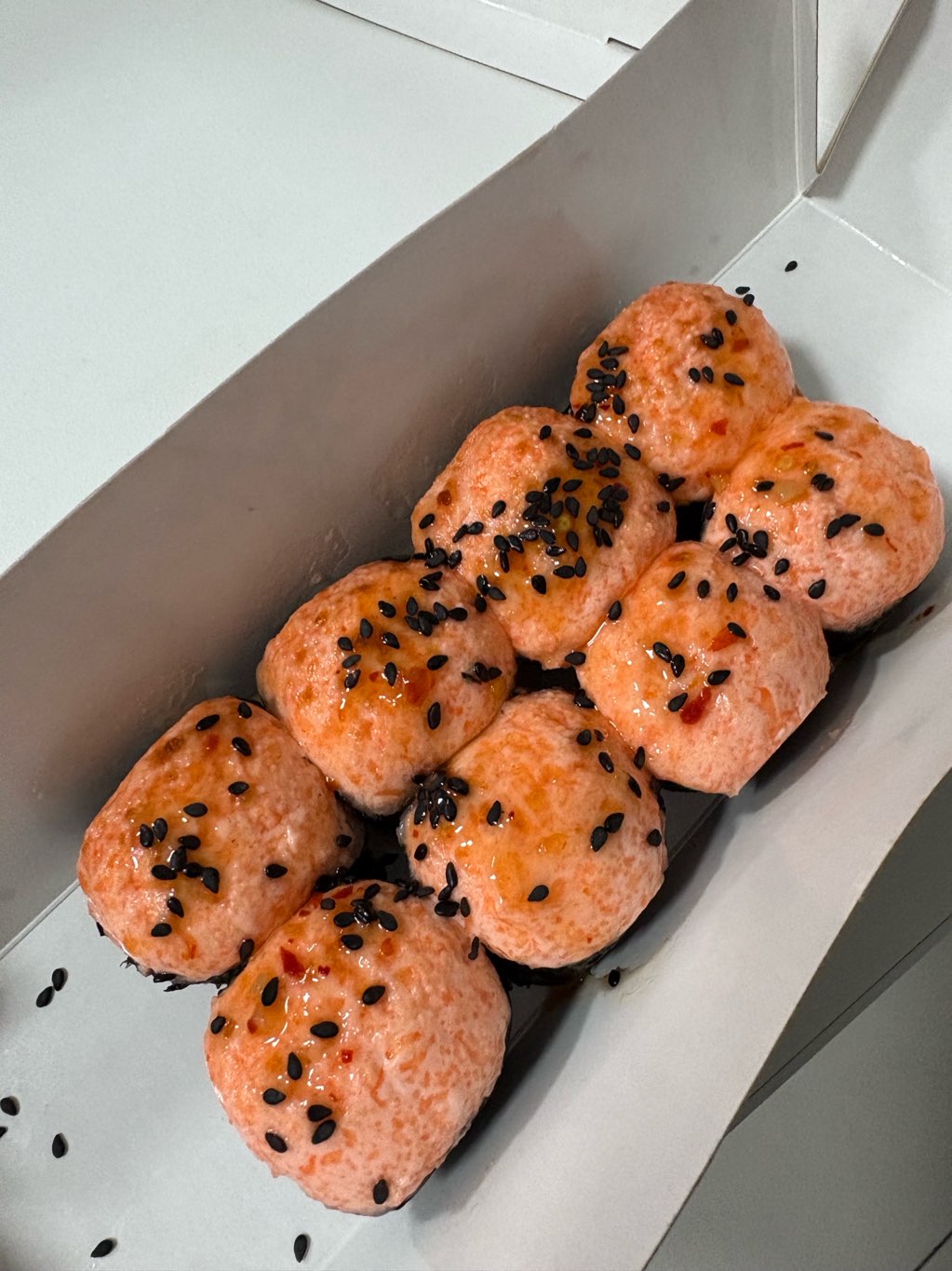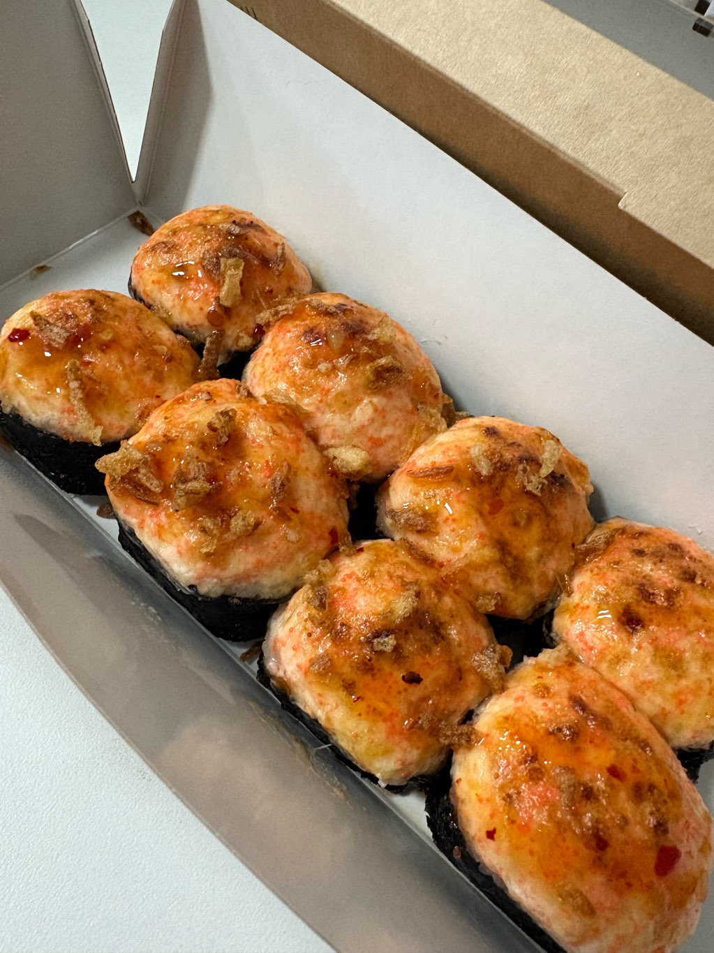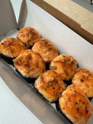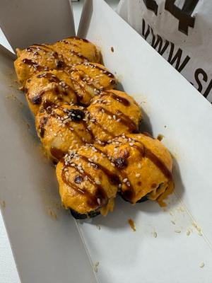 Состав: лосось, огурец, сливочный сыр, соус спайси, кунжут кимчи, соус терияки, кляр, сухари панко