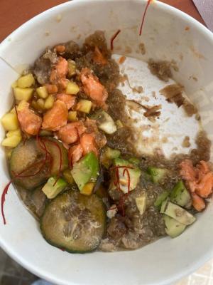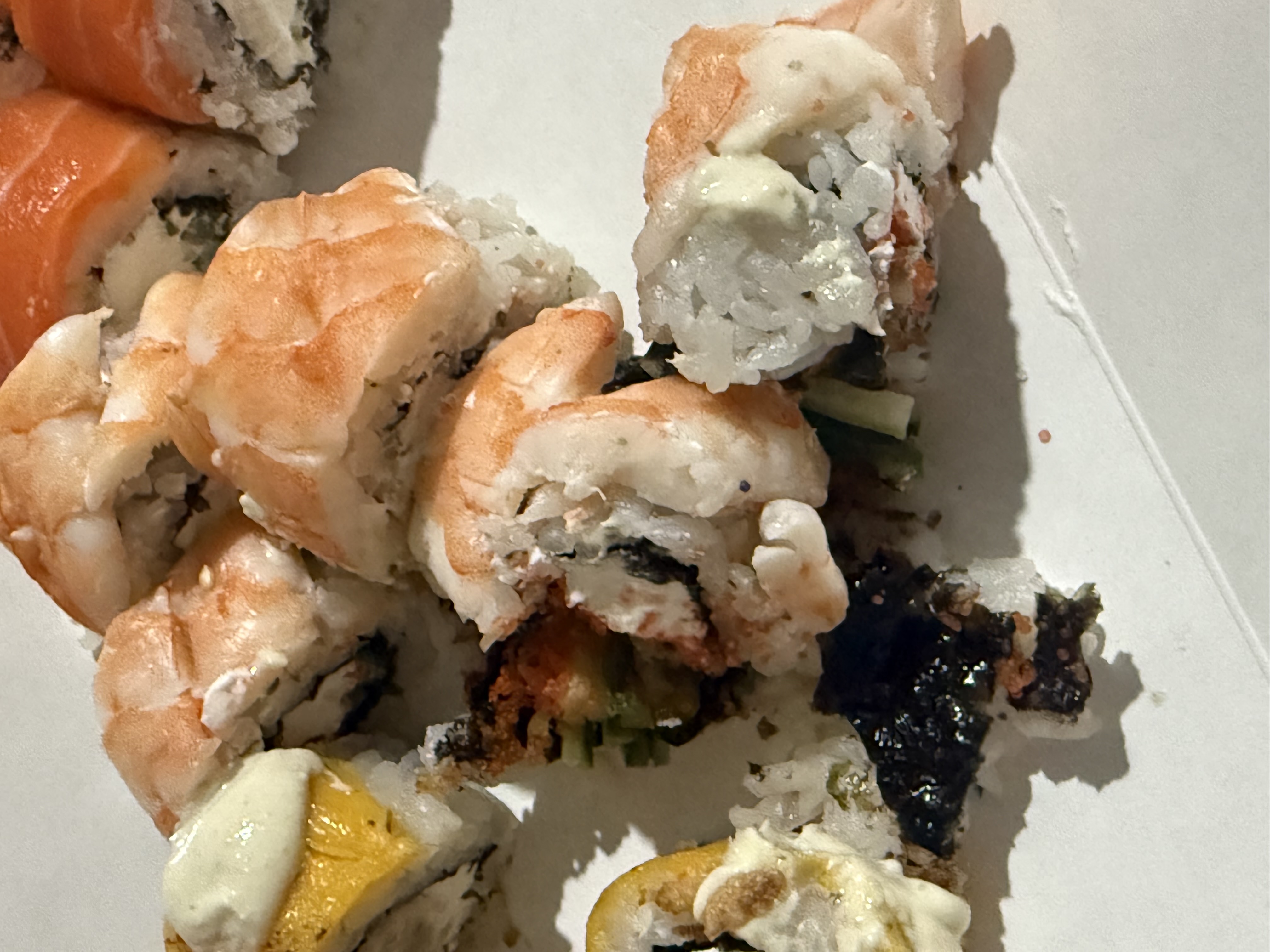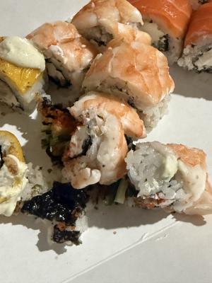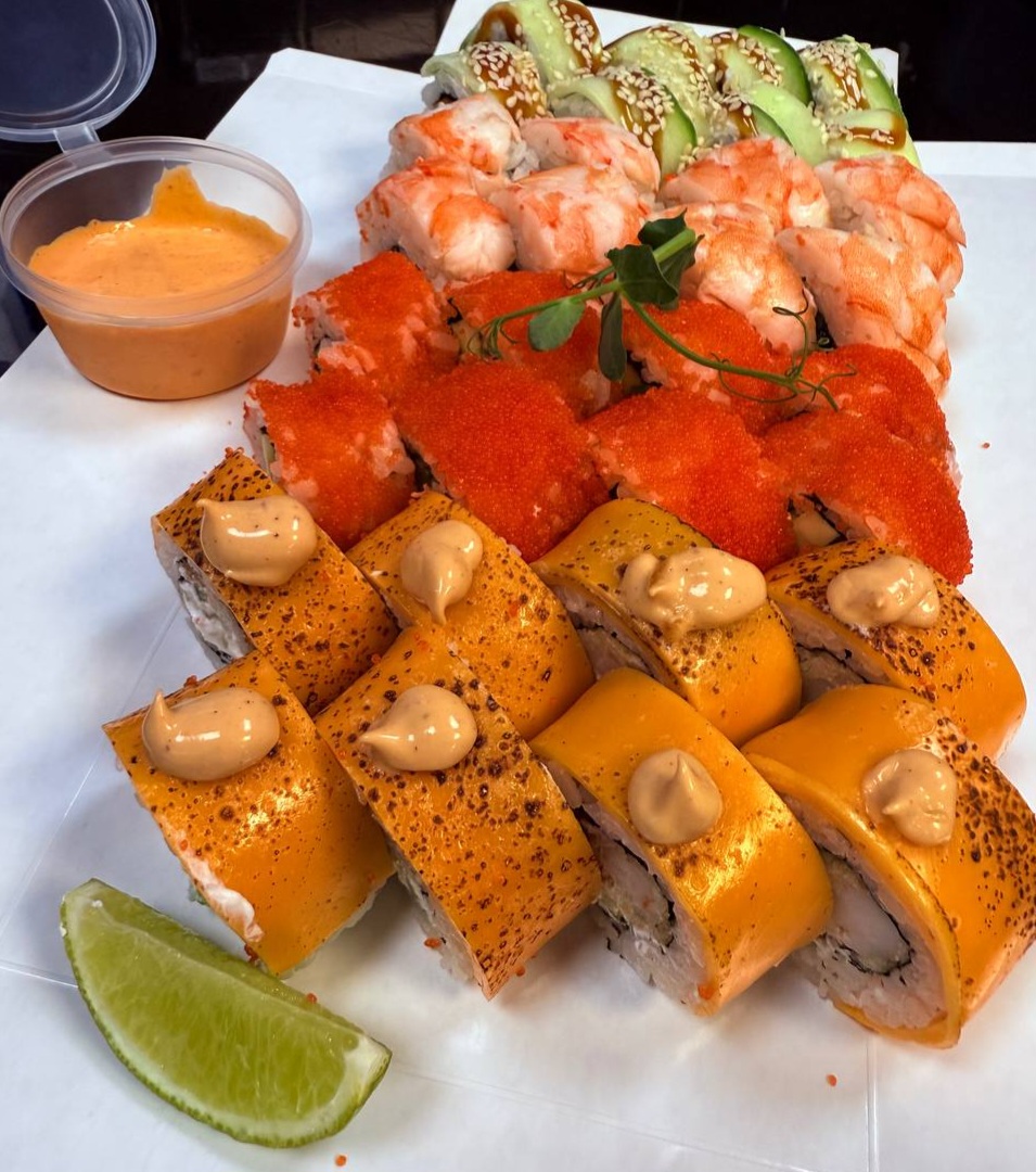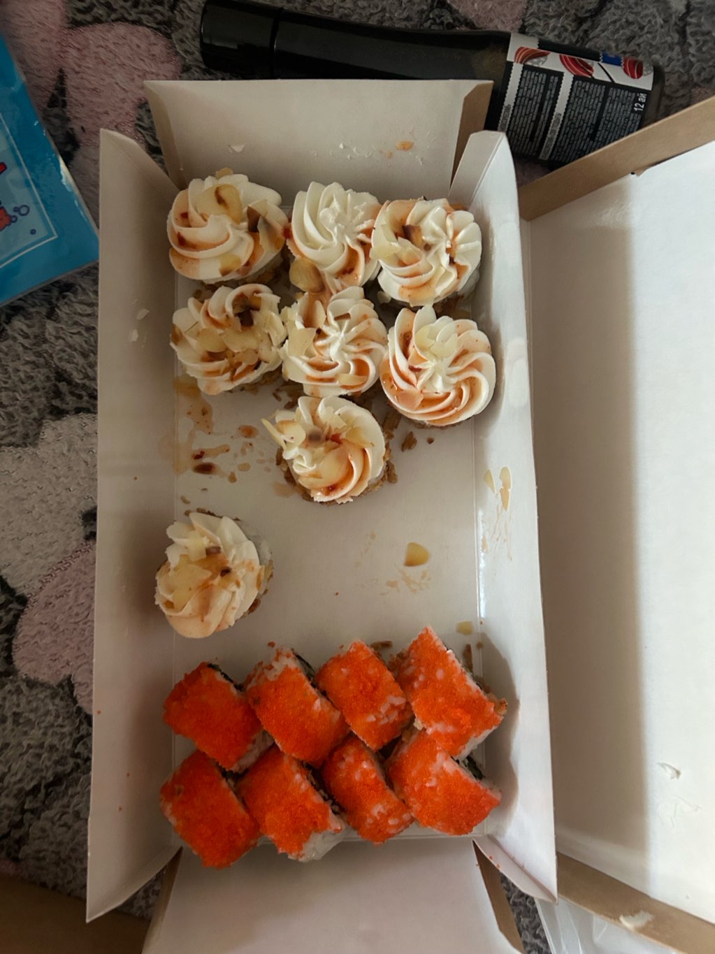 Состав: лосось, огурец, сливочный сыр, соус спайси, кунжут кимчи, соус терияки, кляр, сухари панко
