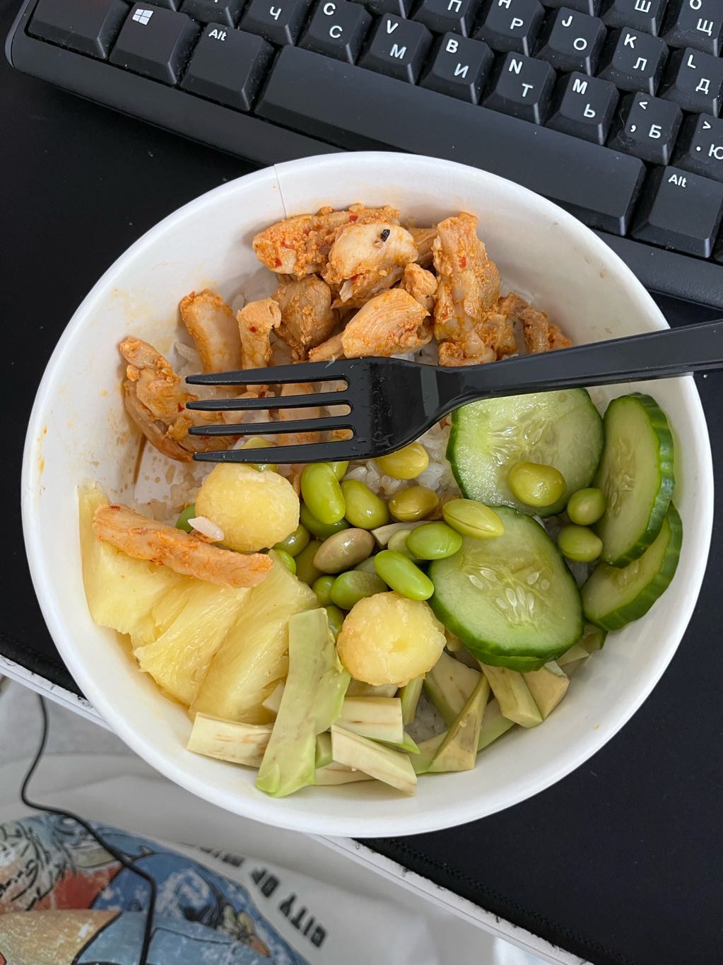 Состав: курица, цукини, лук красный, морковь, перец болгарский, масло чесночное, бобы эдомаме, рис, бульон вок, соус вок, соевые ростки, кунжут