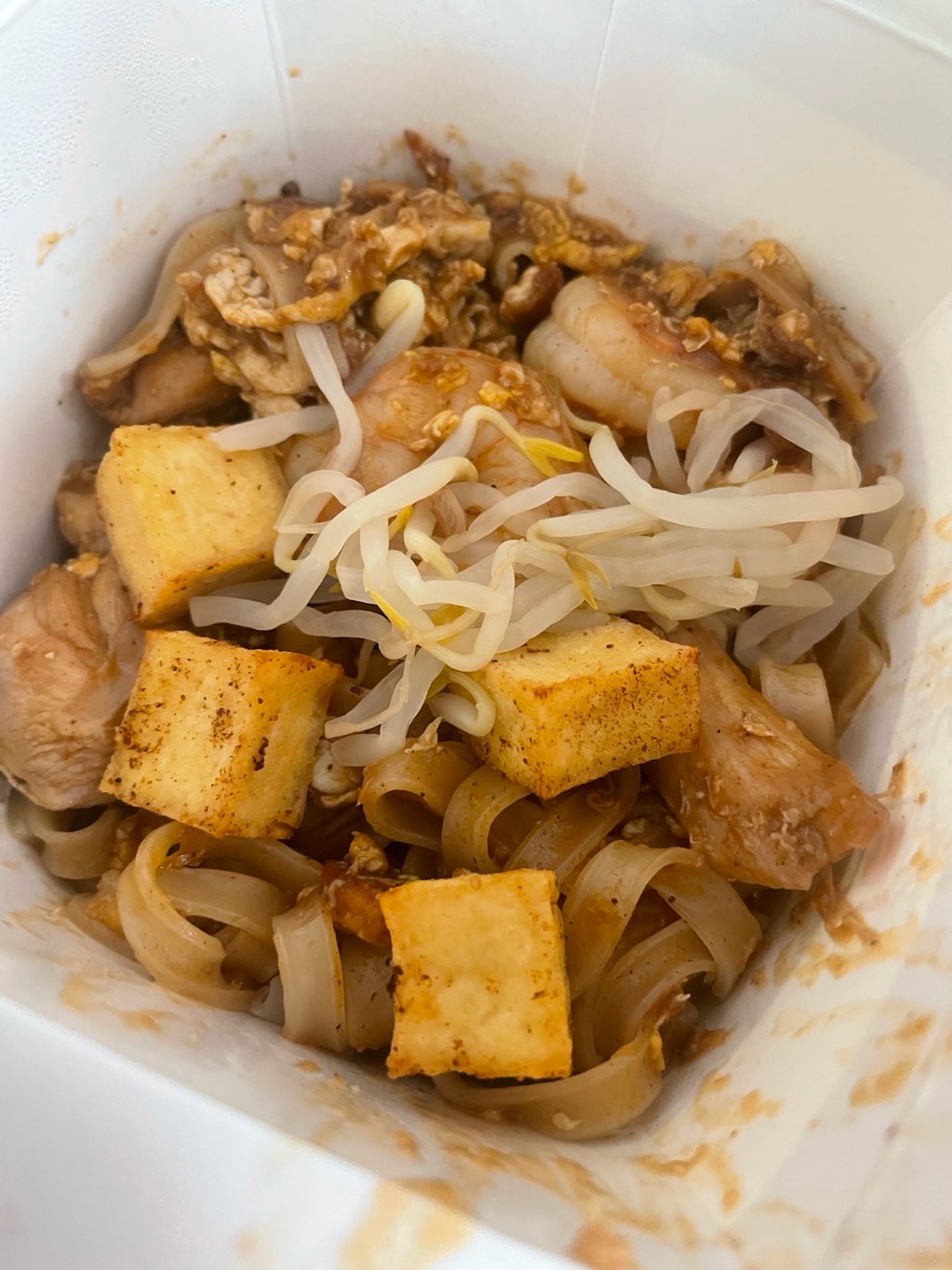 Состав: рисовая лапша, куриное бедро, креветки, яйцо, сыр тофу, морковь, соевые ростки, арахис, кунжут, лук зеленый, перец Чили, лайм, соус Пад Тай