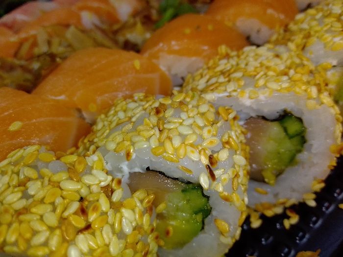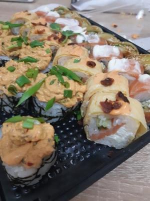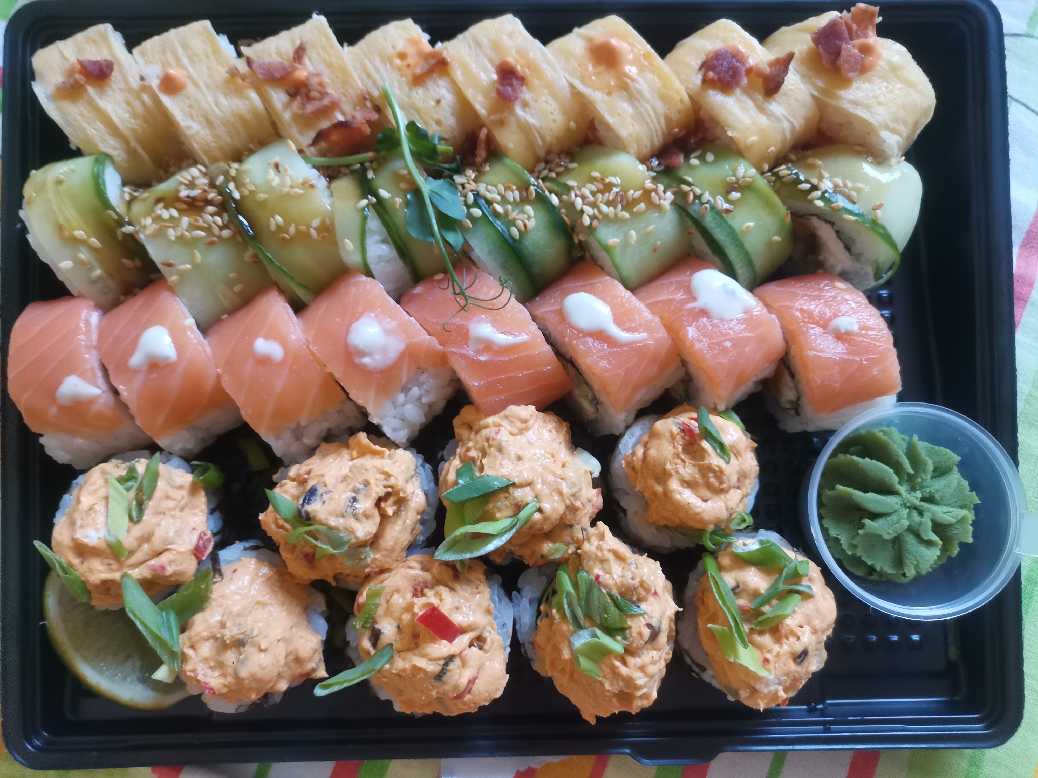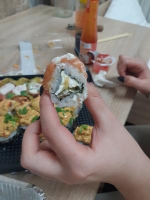 Состав: лосось, огурец, сливочный сыр, соус спайси, кунжут кимчи, соус терияки, кляр, сухари панко