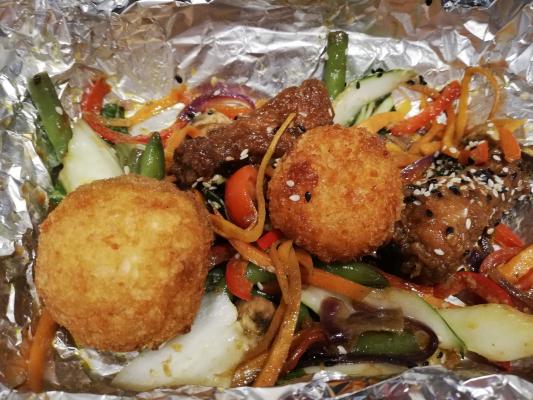 Состав: свинина, соус хойсин, цуккини, лук красный, морковь, перец болгарский, бобы эдамамэ, соевые ростки, кунжут, рис, бульон вок
