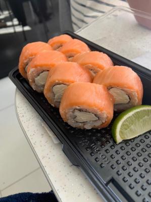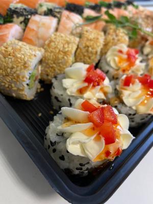 Состав: лосось, огурец, сливочный сыр, соус спайси, кунжут кимчи, соус терияки, кляр, сухари панко