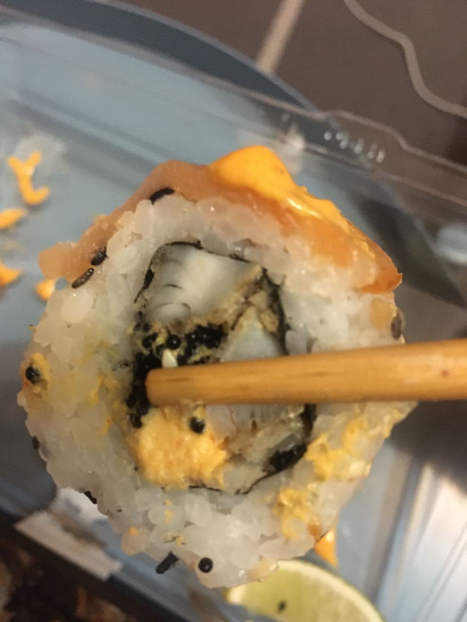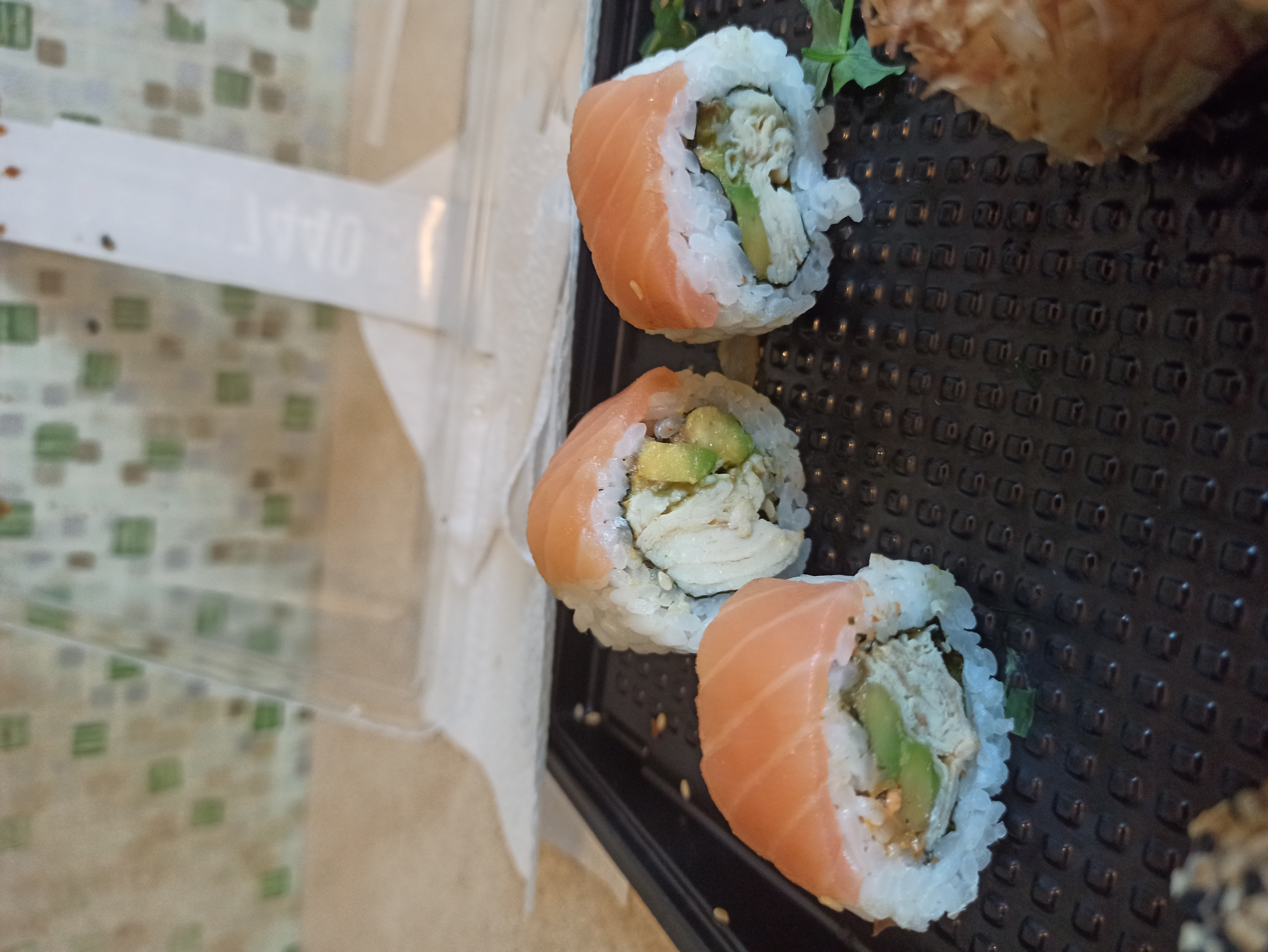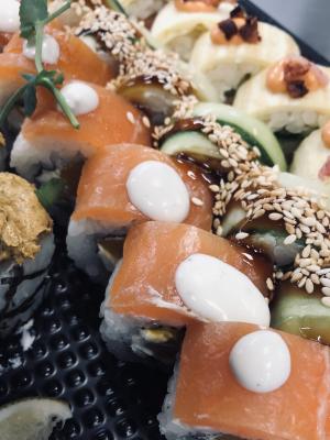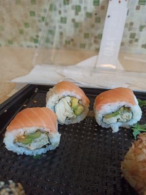 Состав: лосось, огурец, сливочный сыр, соус спайси, кунжут кимчи, соус терияки, кляр, сухари панко