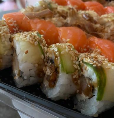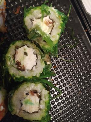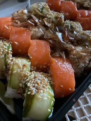 Состав: лосось, огурец, сливочный сыр, соус спайси, кунжут кимчи, соус терияки, кляр, сухари панко