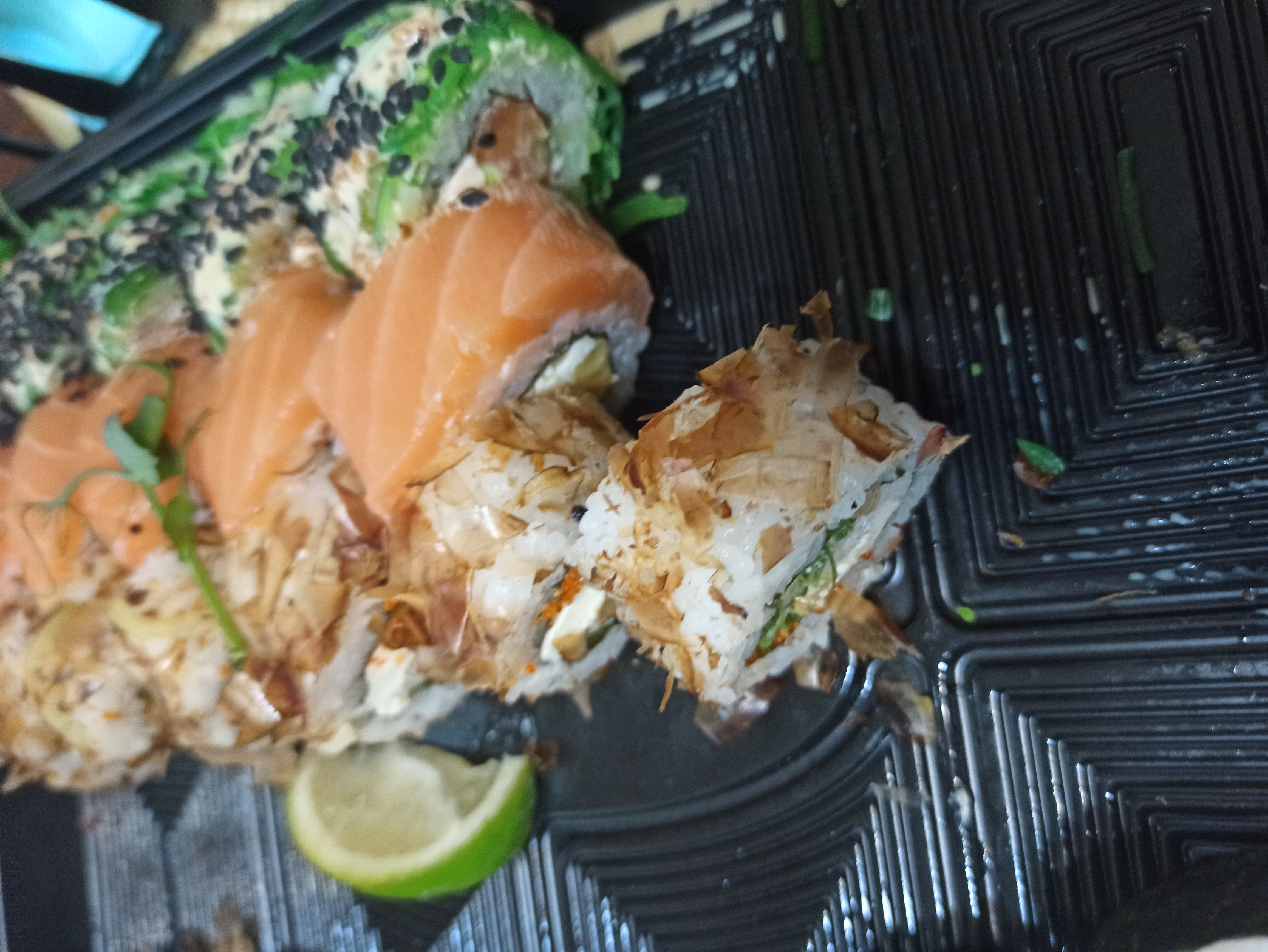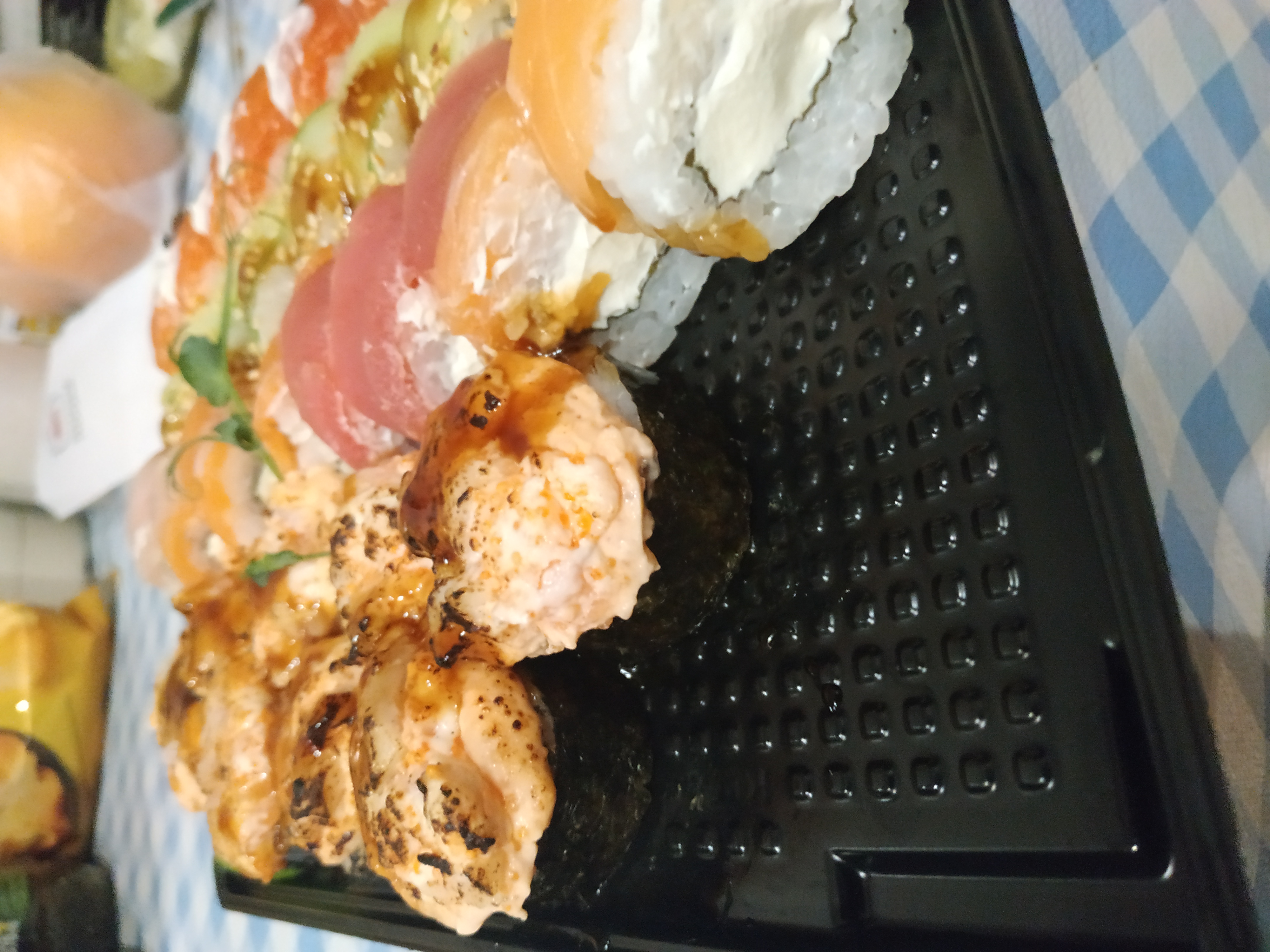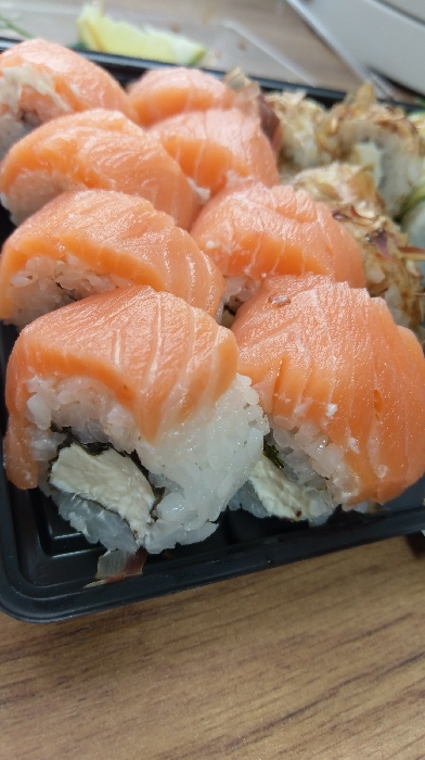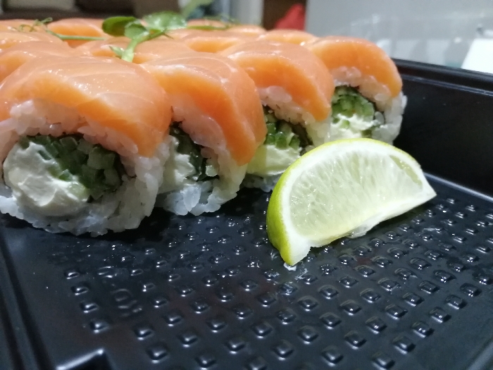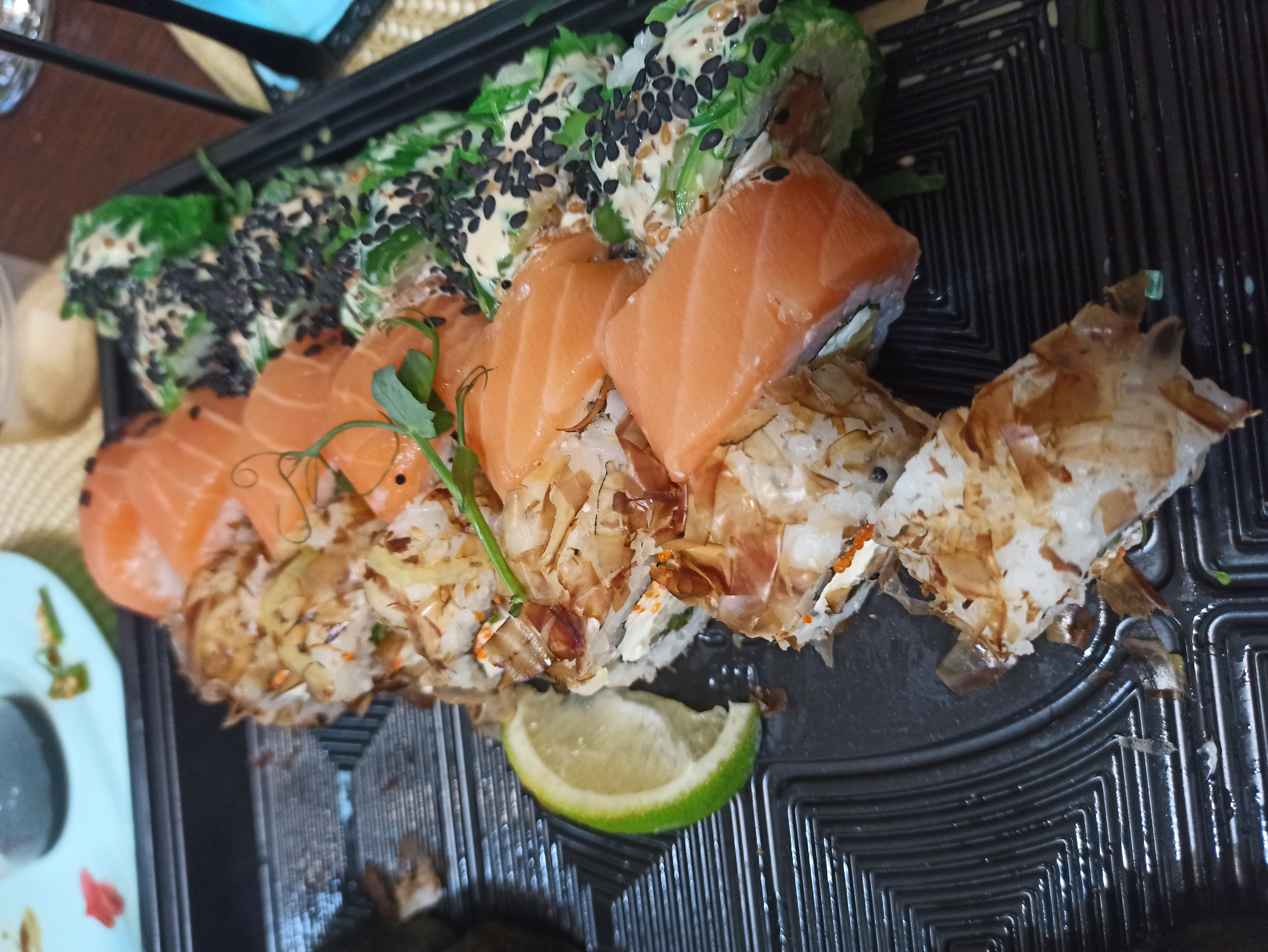 Состав: лосось, огурец, сливочный сыр, соус спайси, кунжут кимчи, соус терияки, кляр, сухари панко