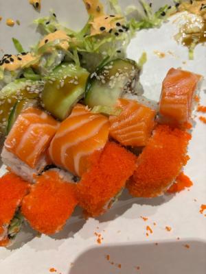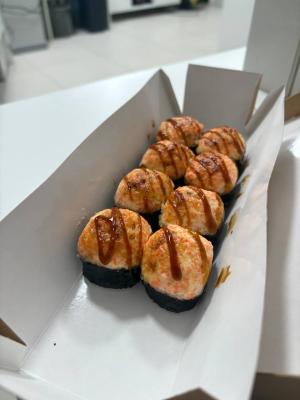 Состав: лосось, огурец, сливочный сыр, соус спайси, кунжут кимчи, соус терияки, кляр, сухари панко