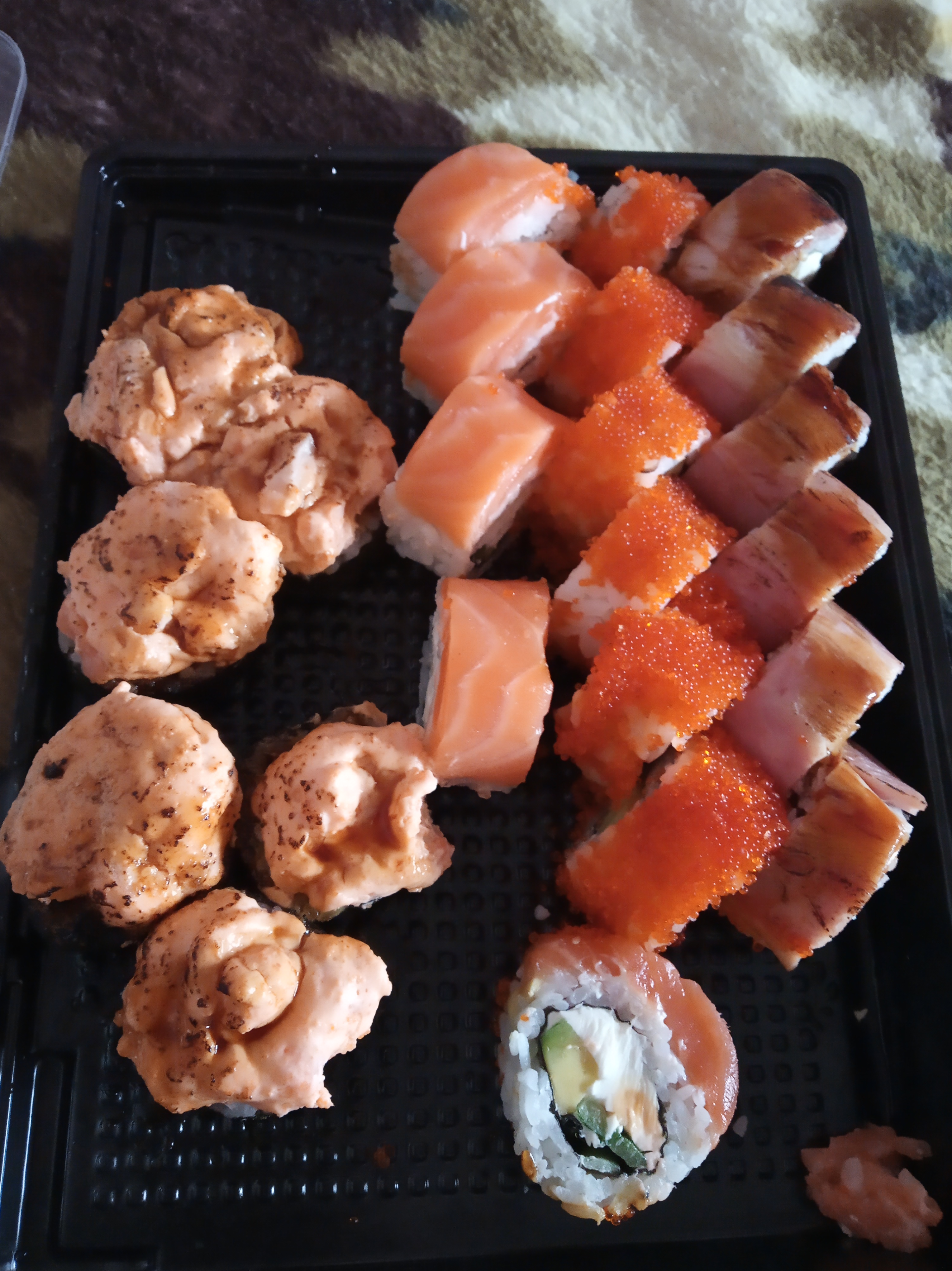 Состав: лосось, огурец, сливочный сыр, соус спайси, кунжут кимчи, соус терияки, кляр, сухари панко