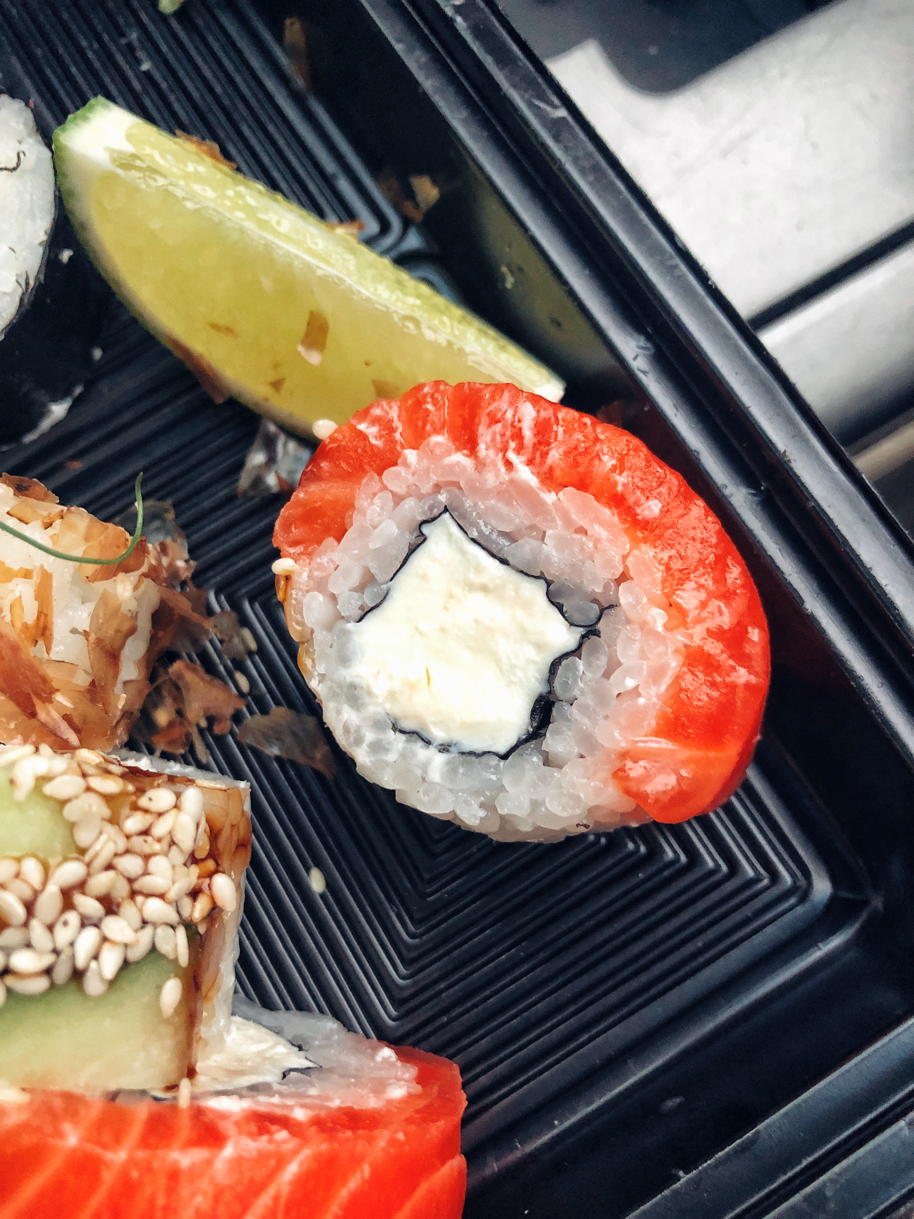 Состав: креветка, авокадо, манго, сливочный сыр, соус уорчестор, кунжутное масло, кунжут, сус кунжутный, петрушка