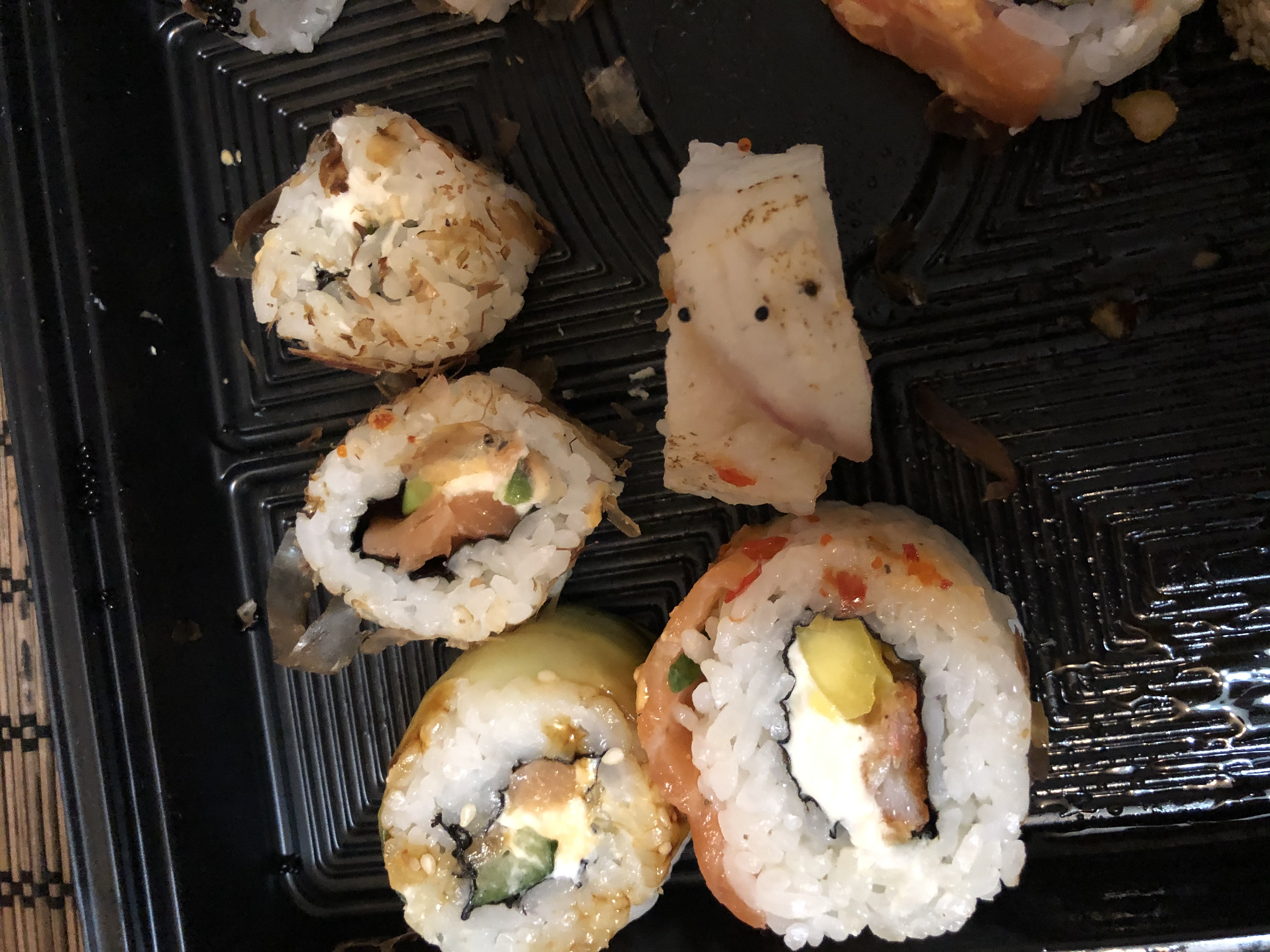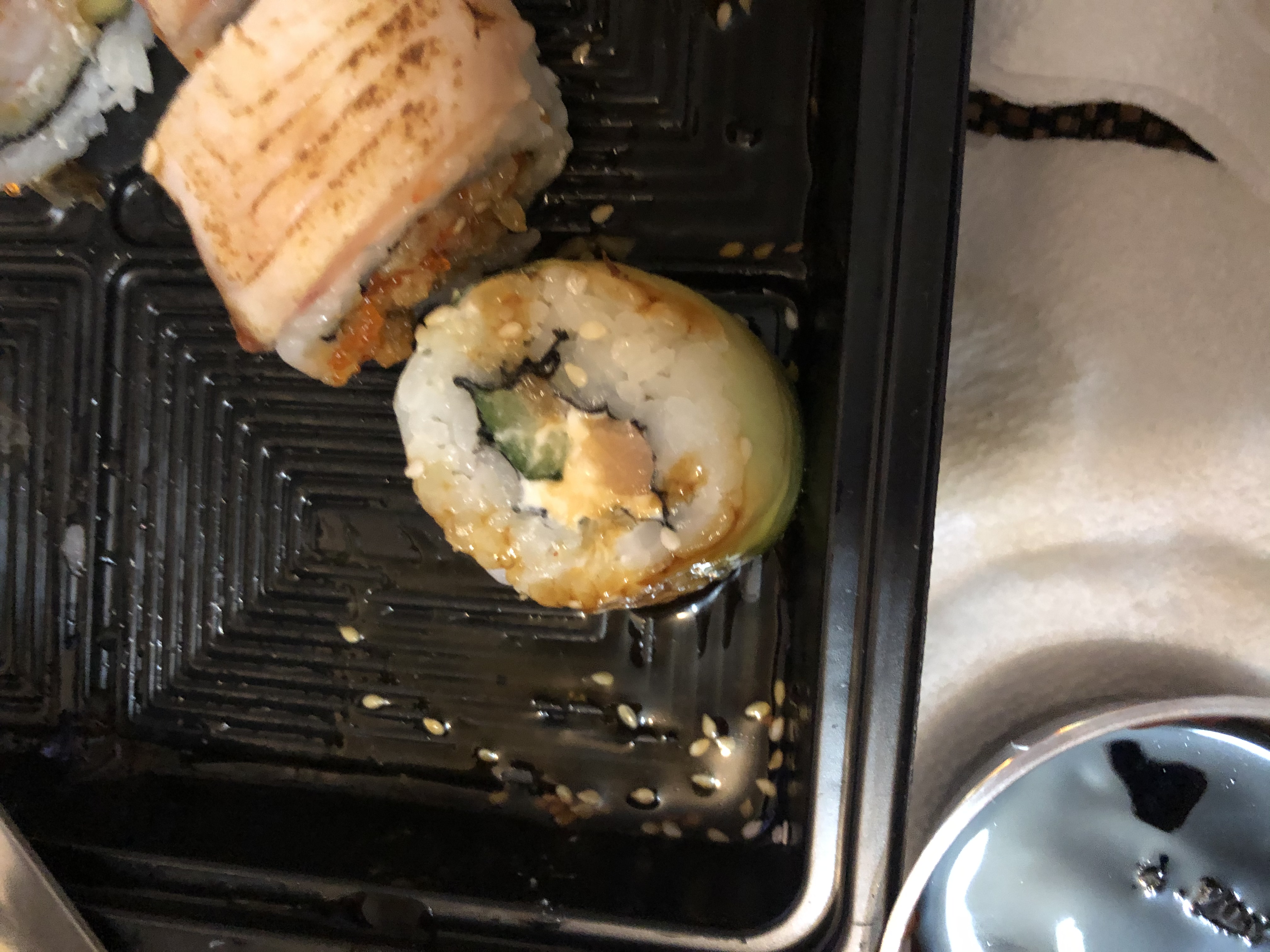 Состав: сунец, авокадо, сливочный сыр, кунжутное масло, картофель пай, соус терияки, кляр, сухари панко