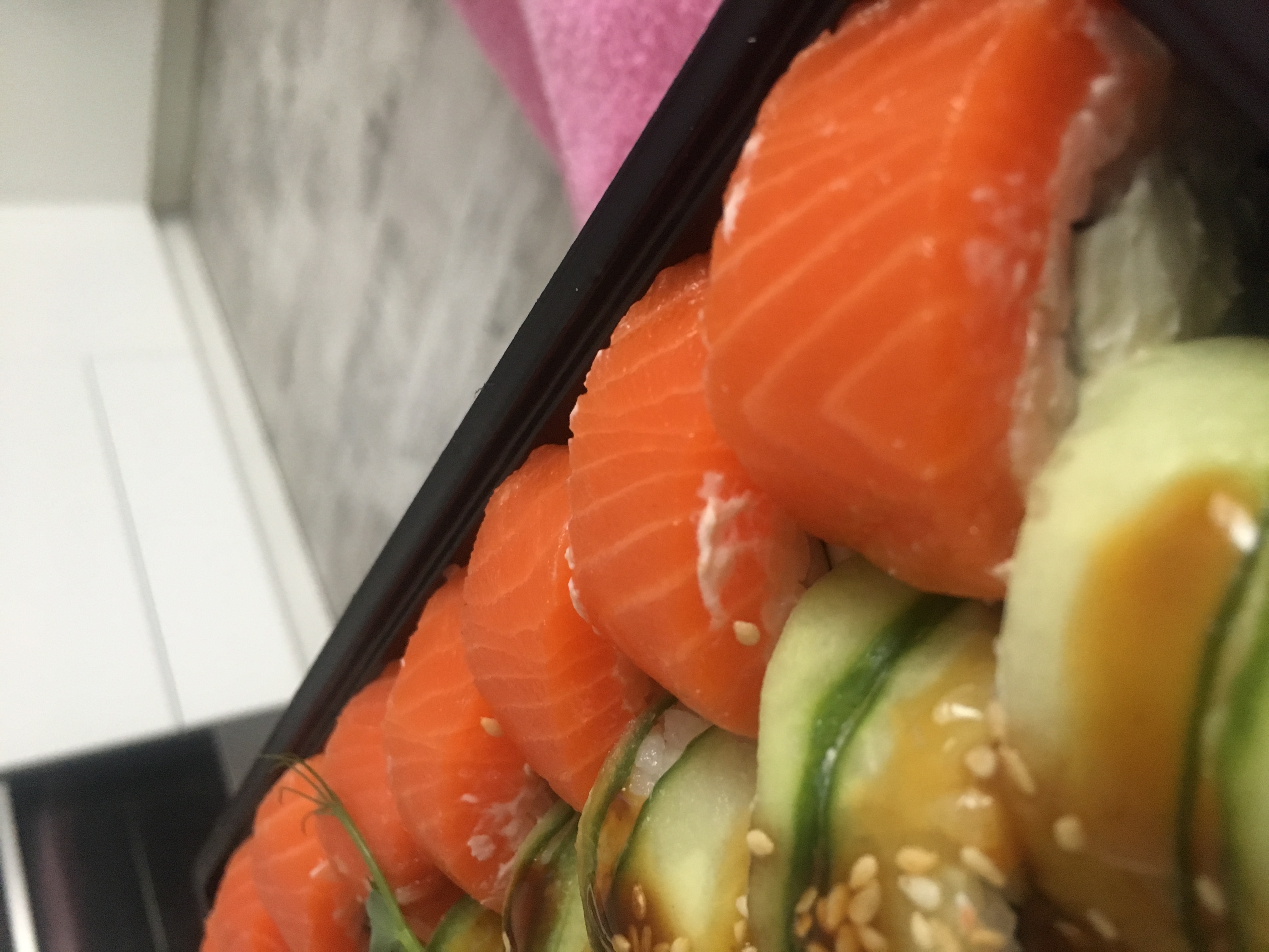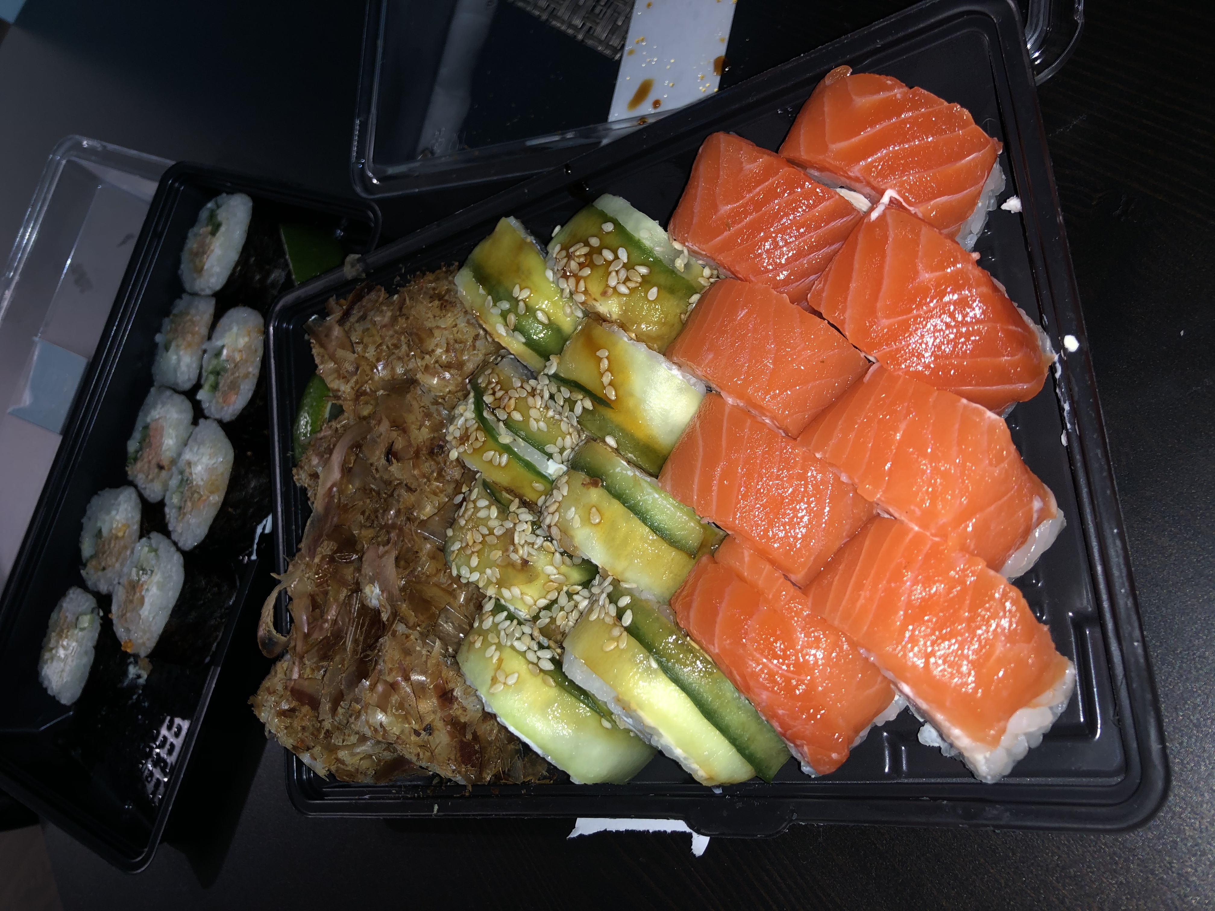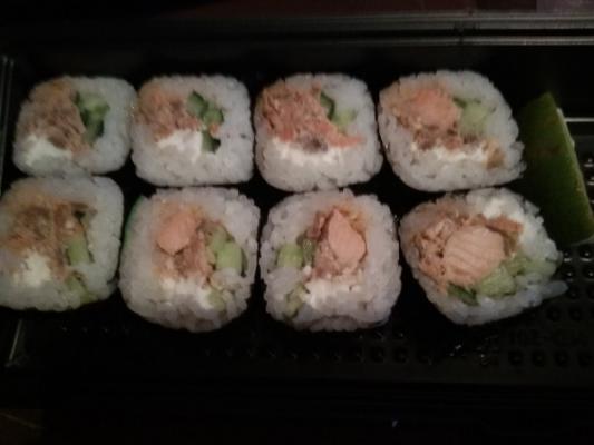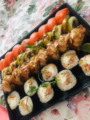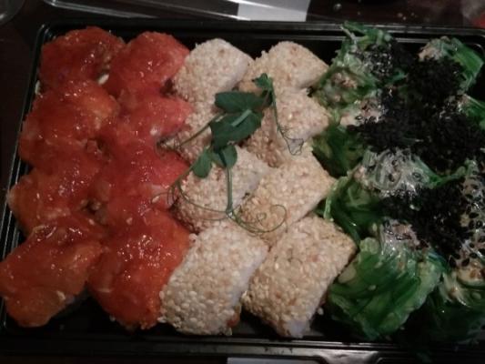 Состав: лосось, огурец, сливочный сыр, соус спайси, кунжут кимчи, соус терияки, кляр, сухари панко