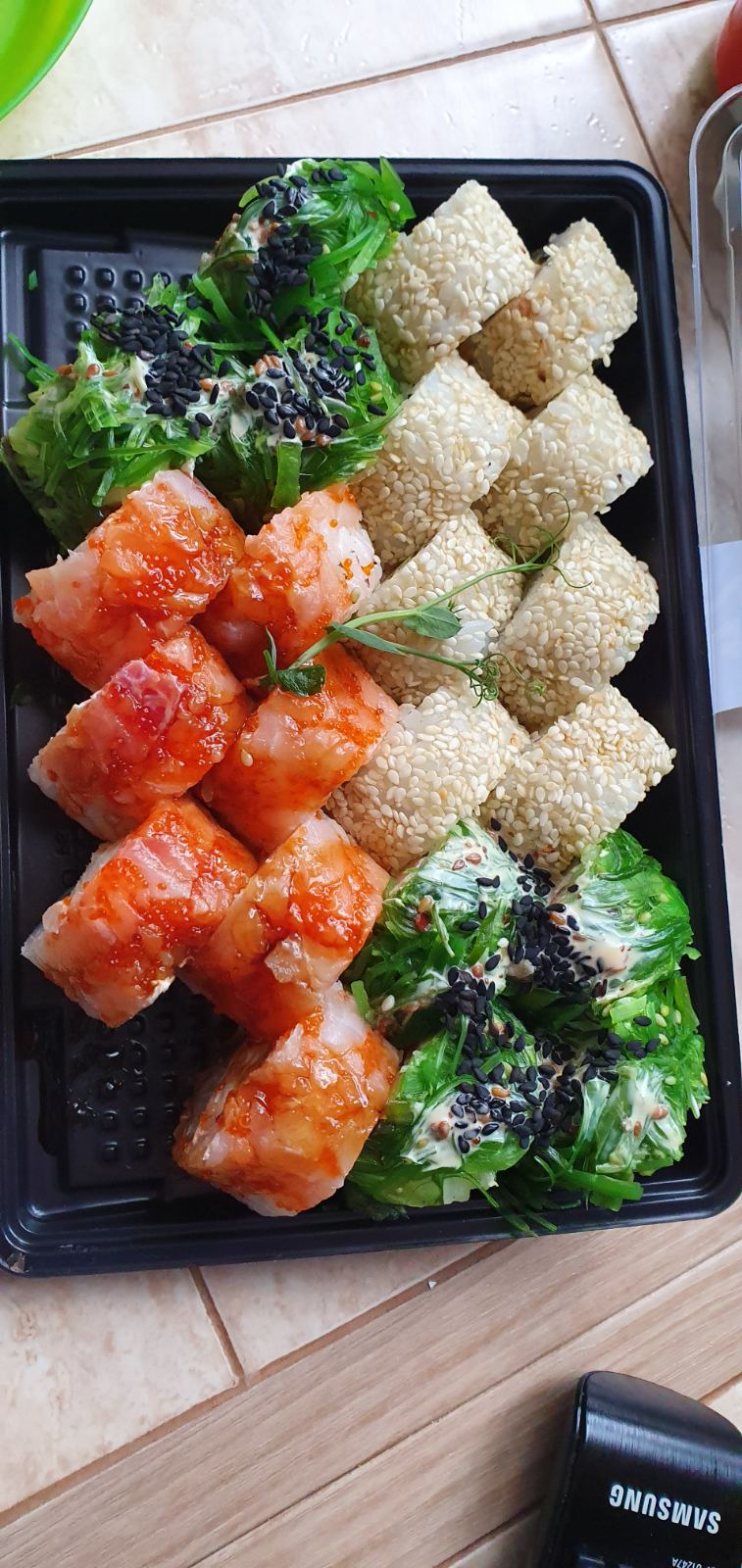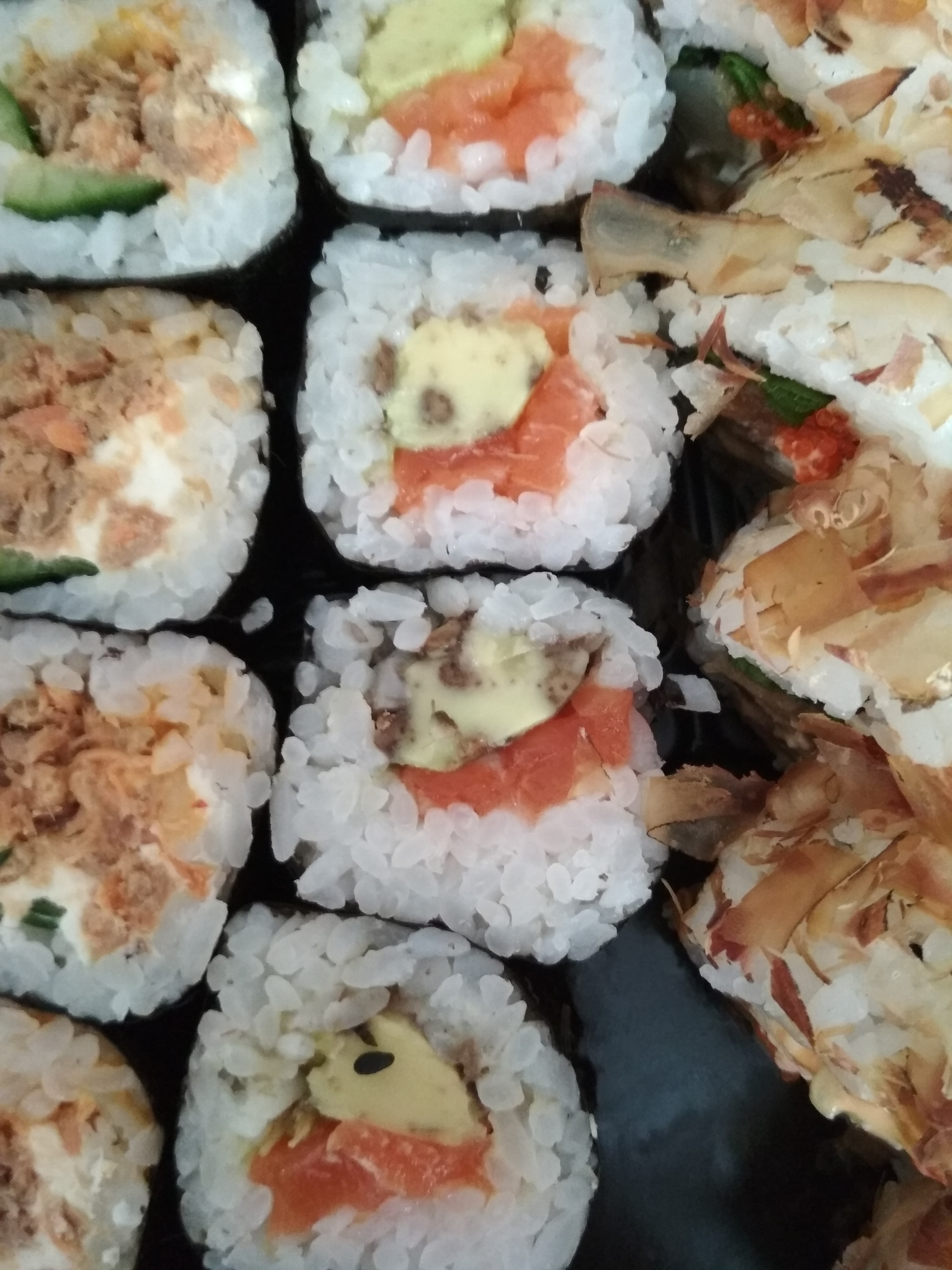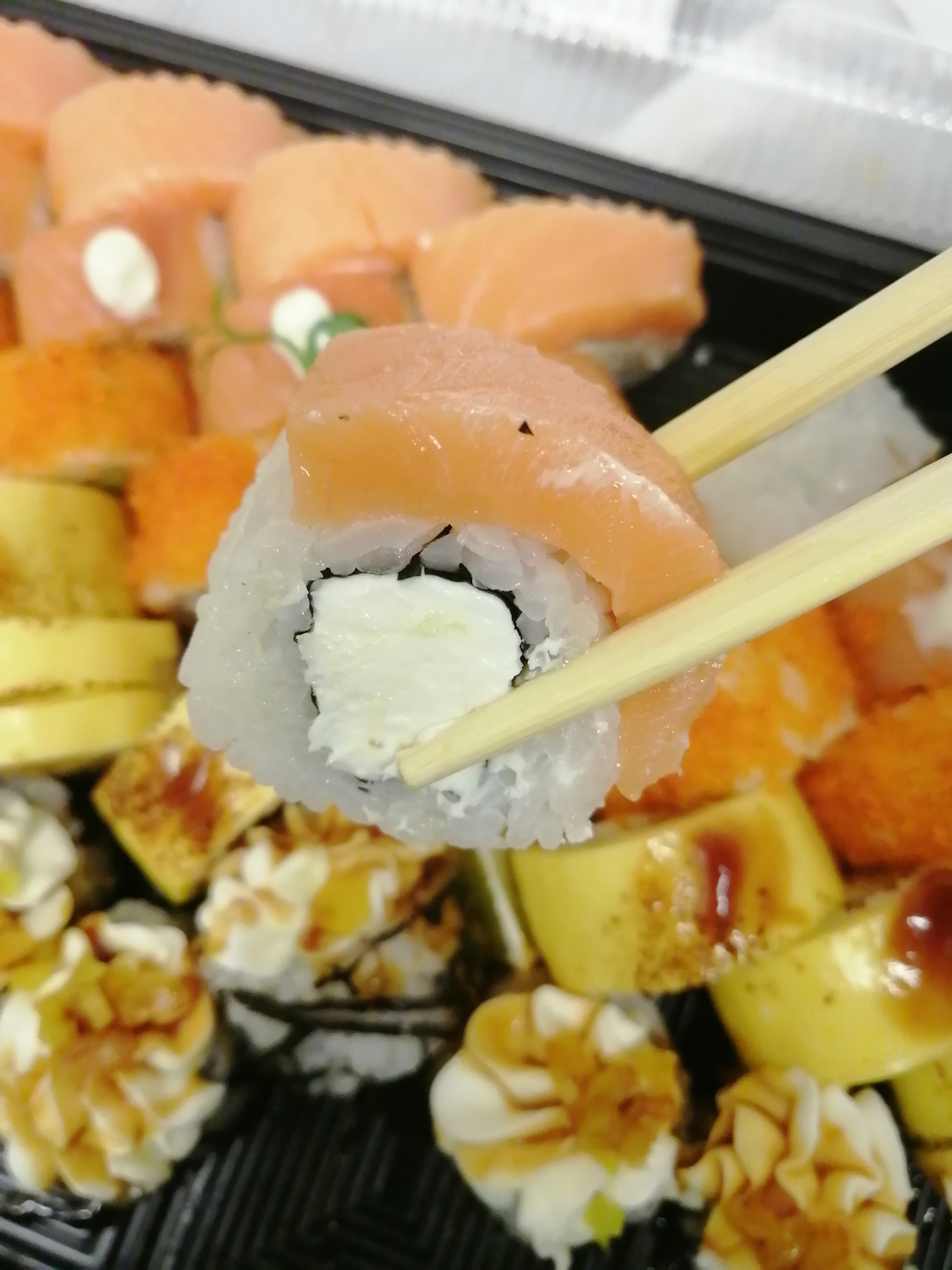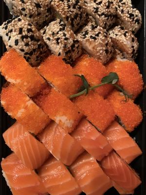 Состав: лосось, огурец, сливочный сыр, соус спайси, кунжут кимчи, соус терияки, кляр, сухари панко