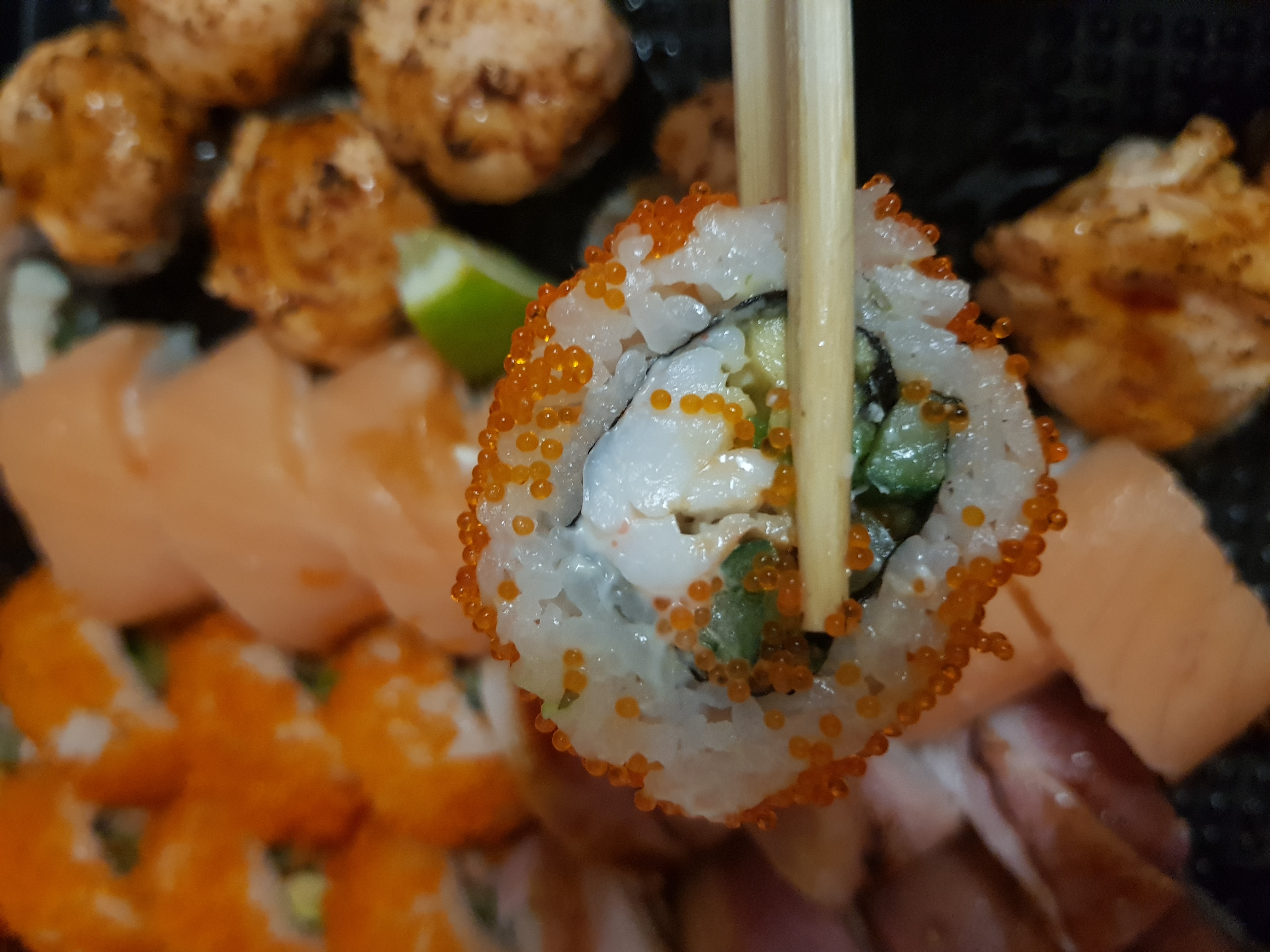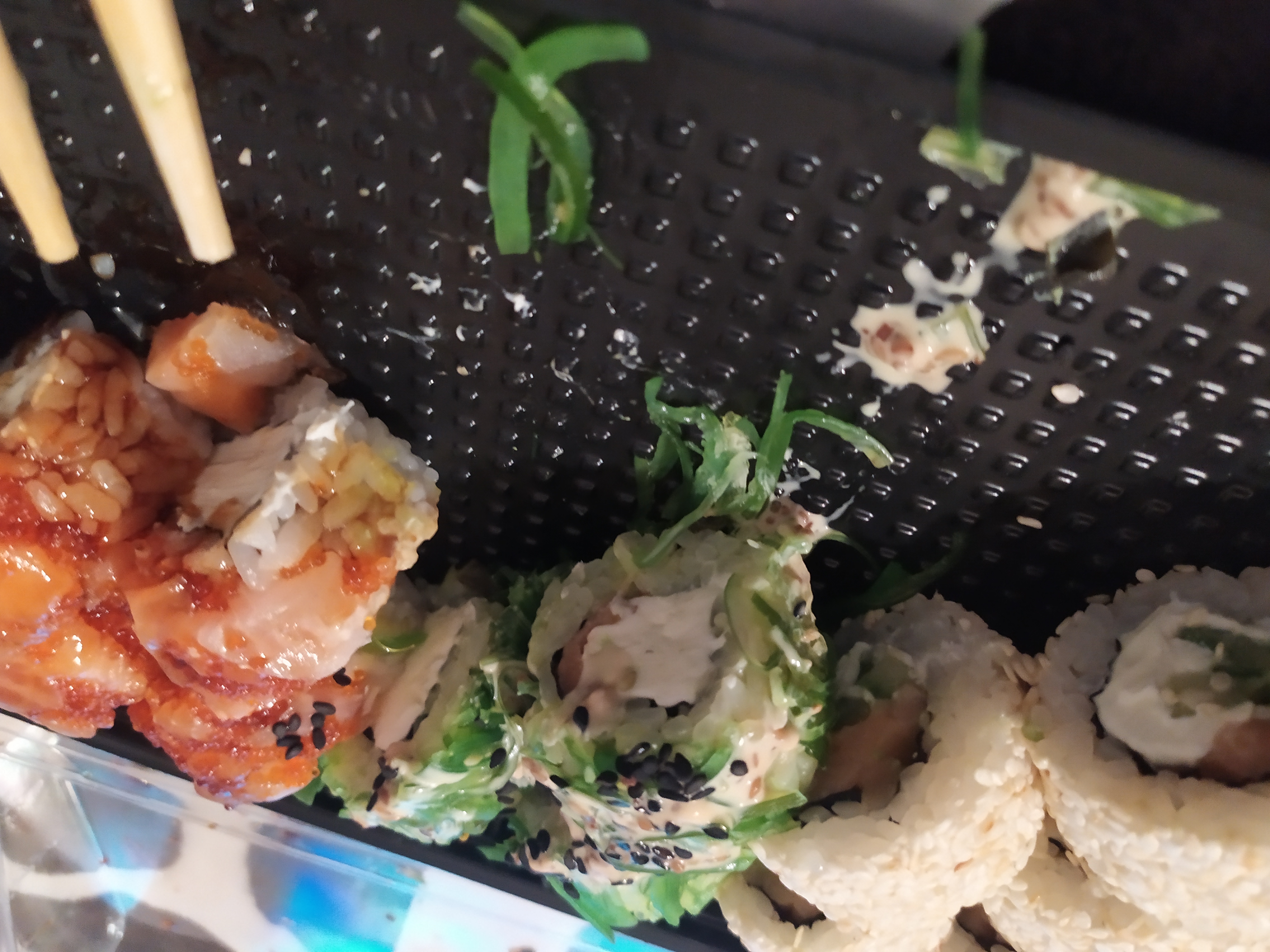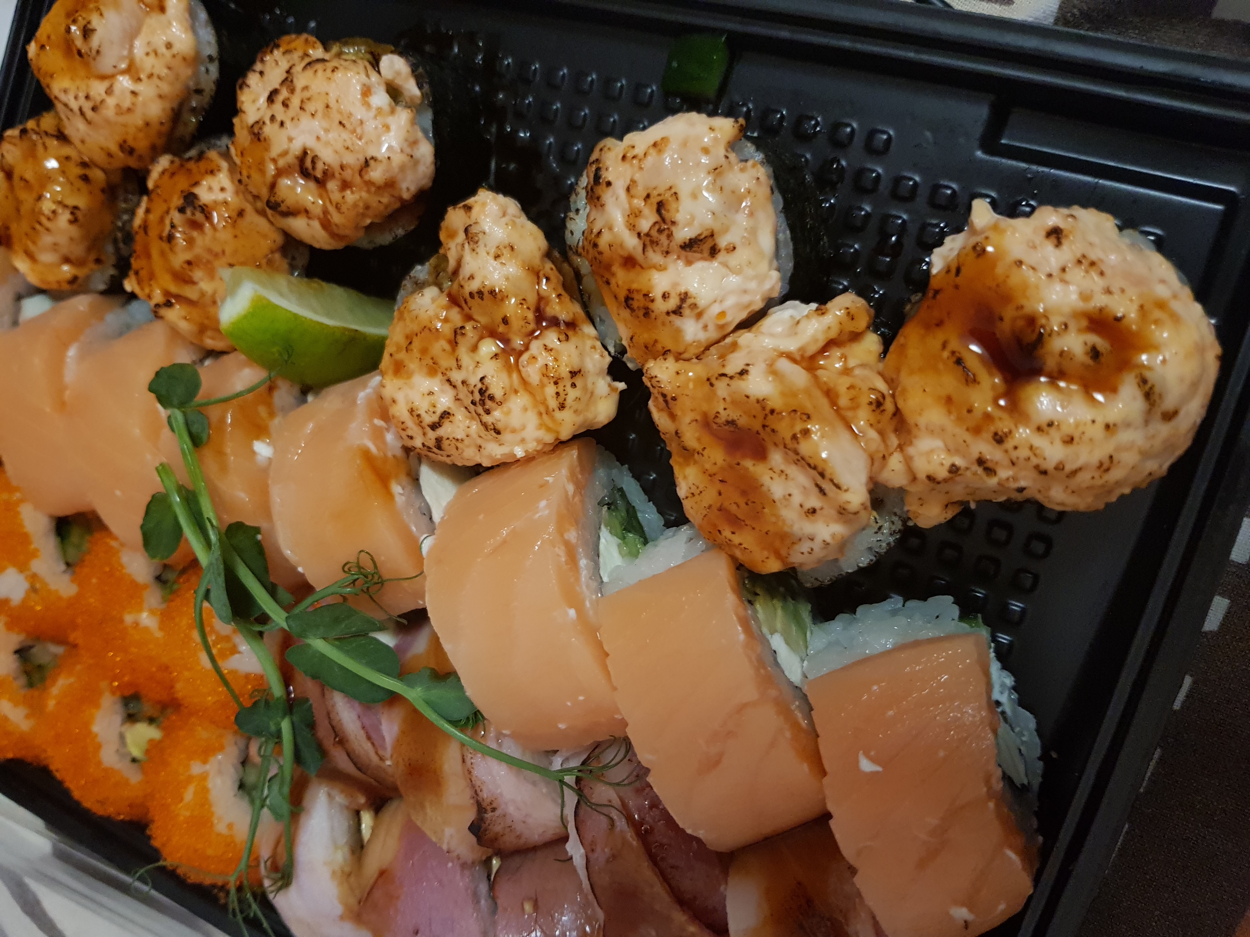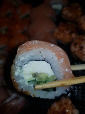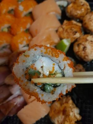Состав: лосось, огурец, сливочный сыр, соус спайси, кунжут кимчи, соус терияки, кляр, сухари панко