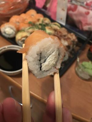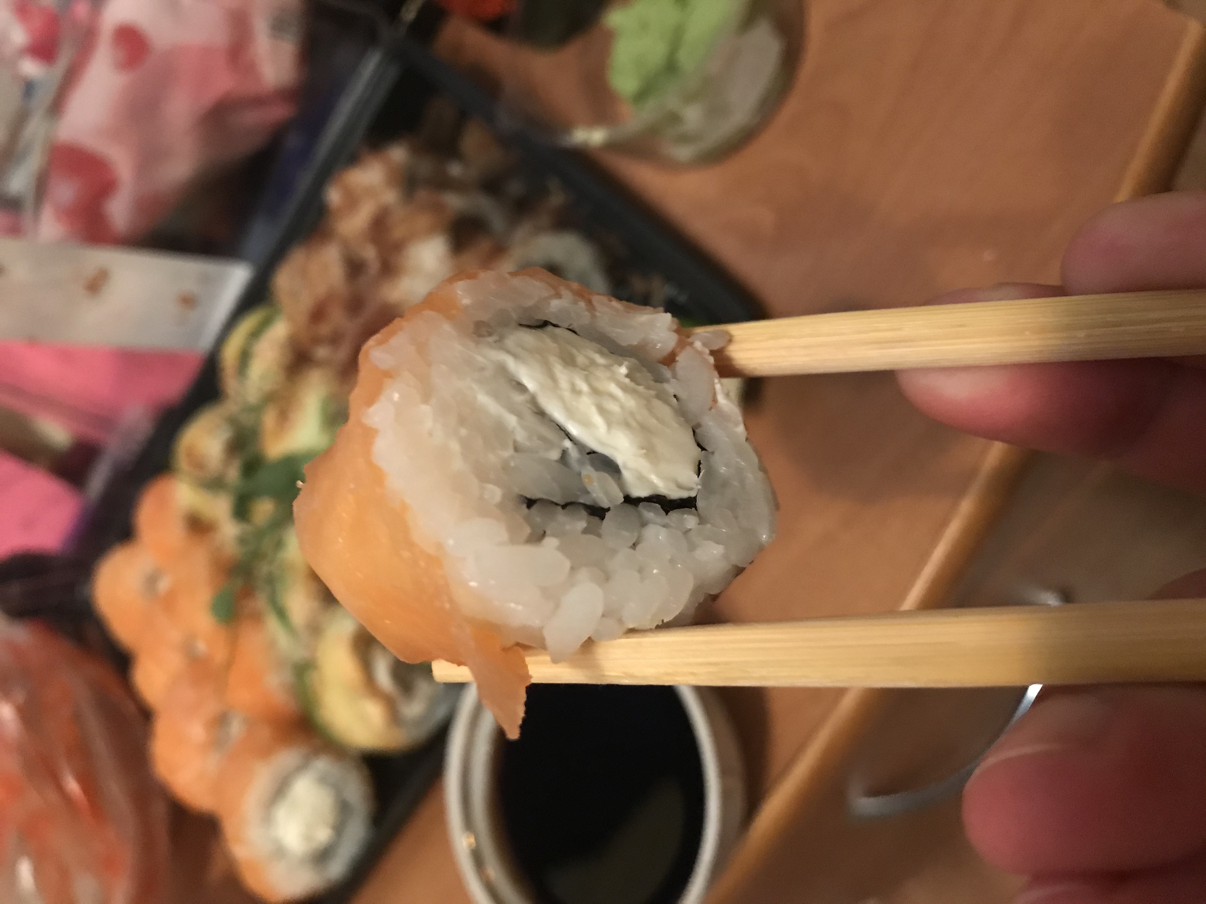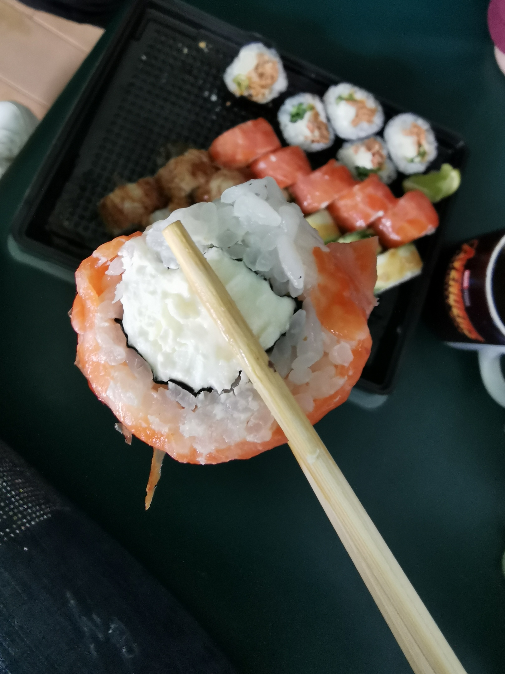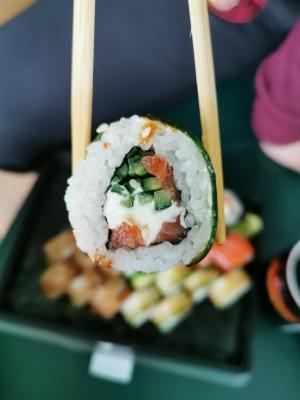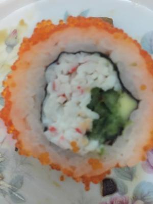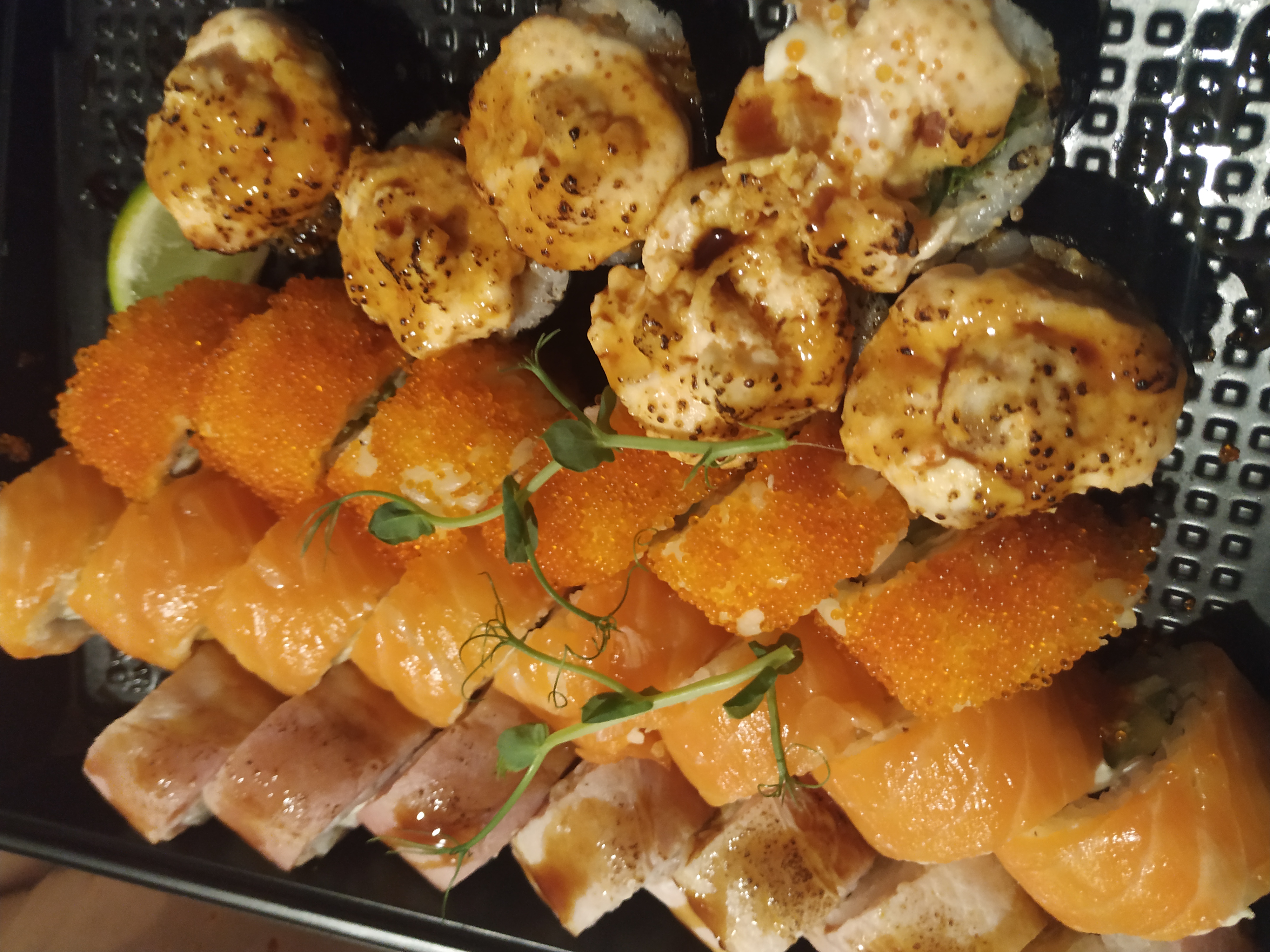 Состав: лосось, огурец, сливочный сыр, соус спайси, кунжут кимчи, соус терияки, кляр, сухари панко