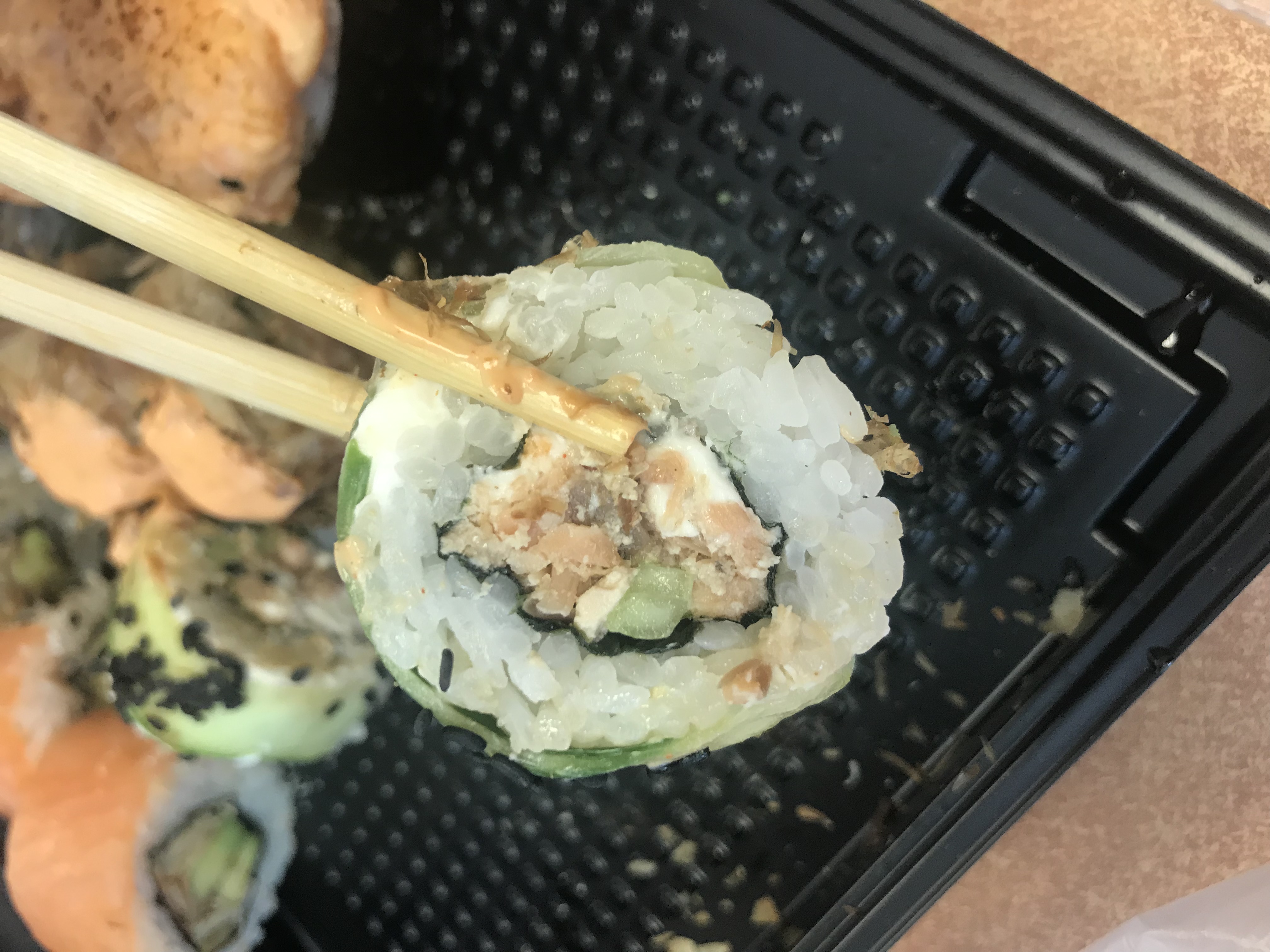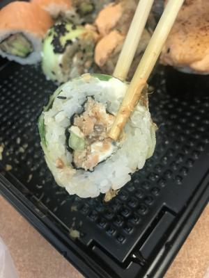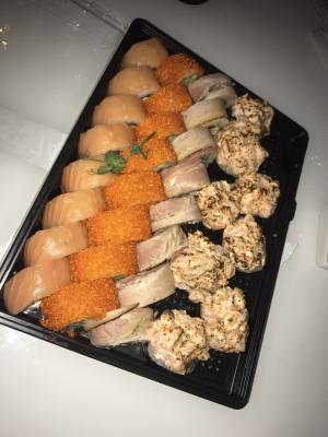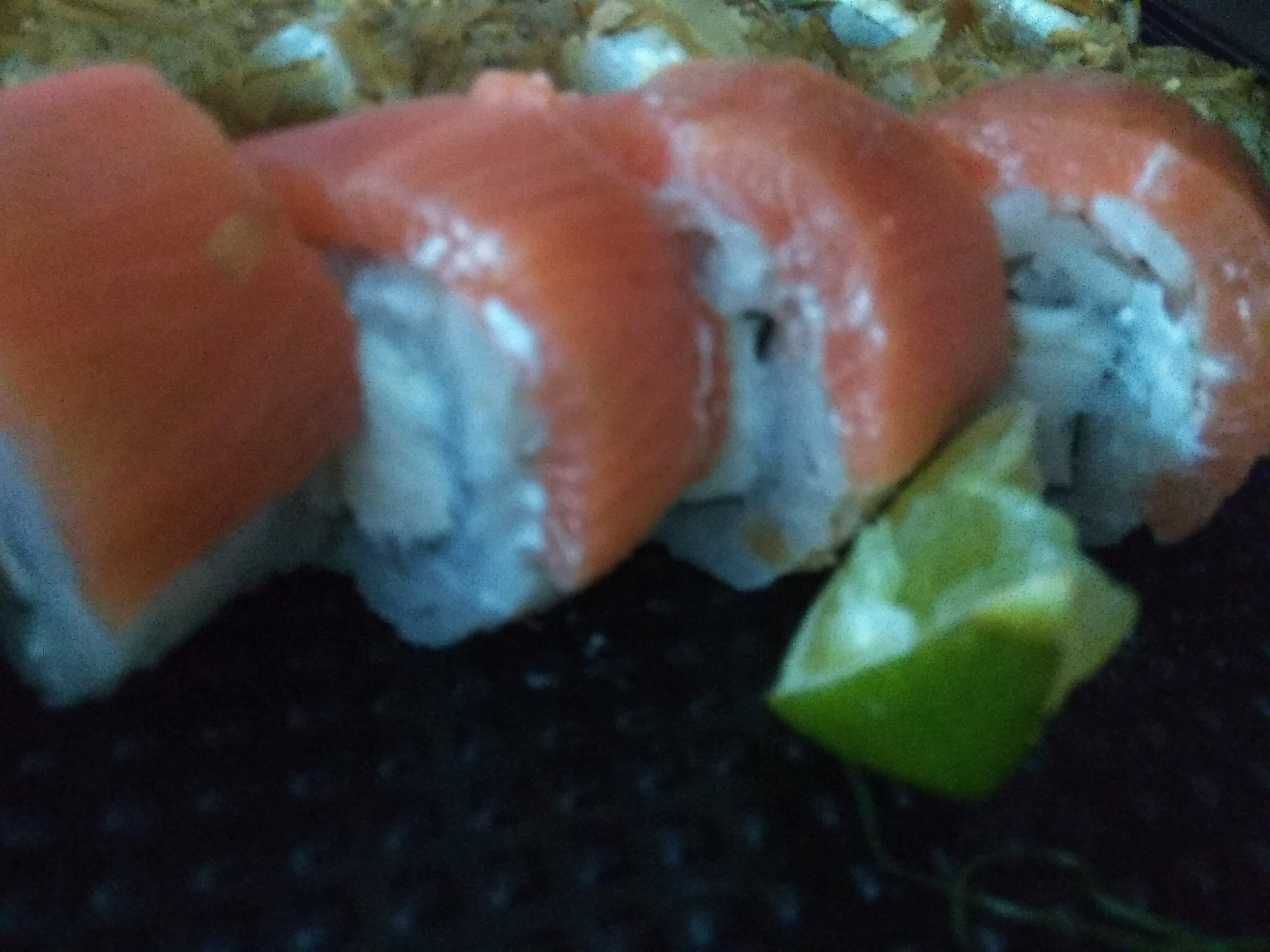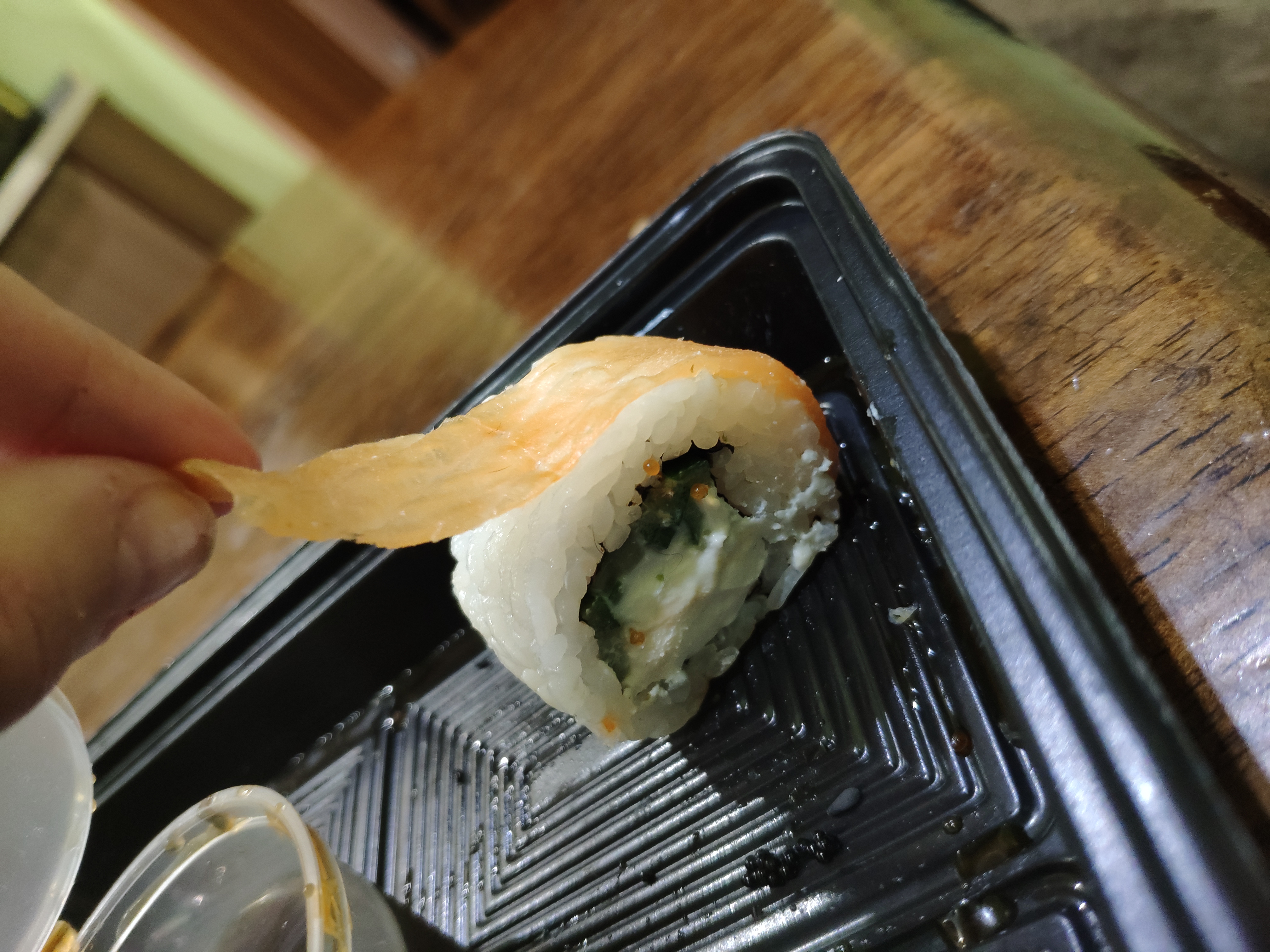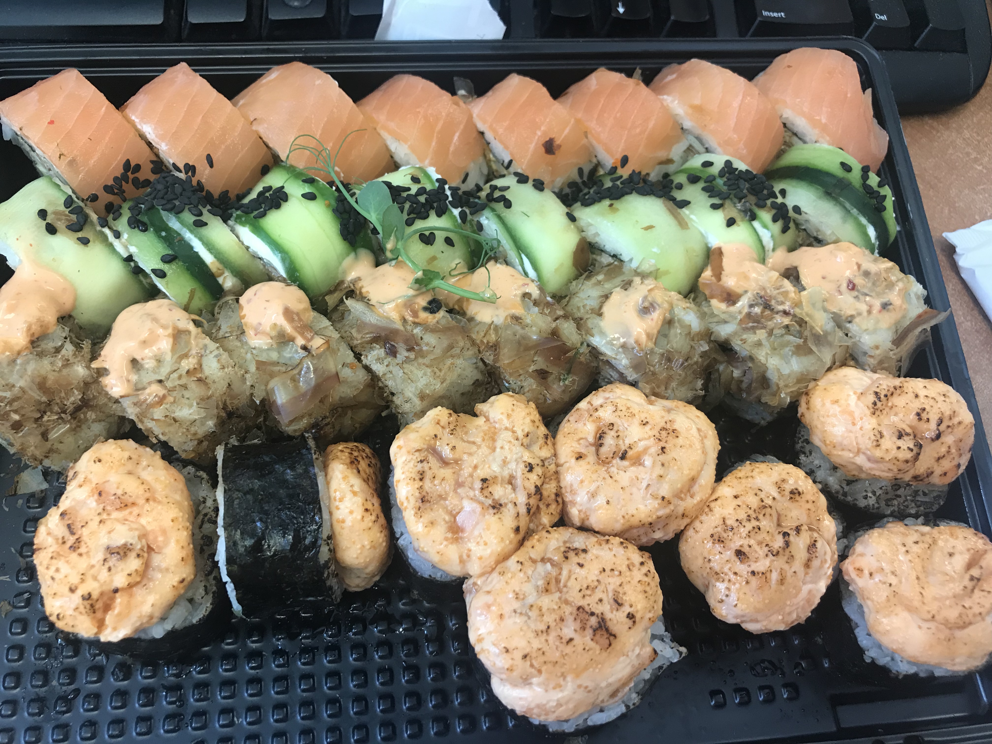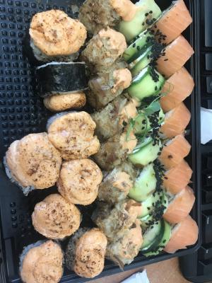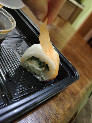 Состав: лосось, огурец, сливочный сыр, соус спайси, кунжут кимчи, соус терияки, кляр, сухари панко