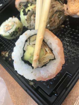 Состав: краб микс, сыр чеддер, огурец, чипс бекона, сливочный сыр, соус терияки, кляр, сухари панко