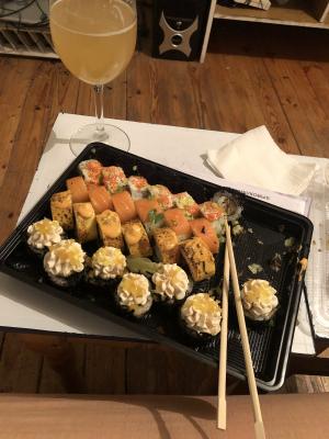 Суши очень вкусные,  брали сет 6. При самовывозе из Титана получили приятный бонус) Спасибо, будем еще заказывать!