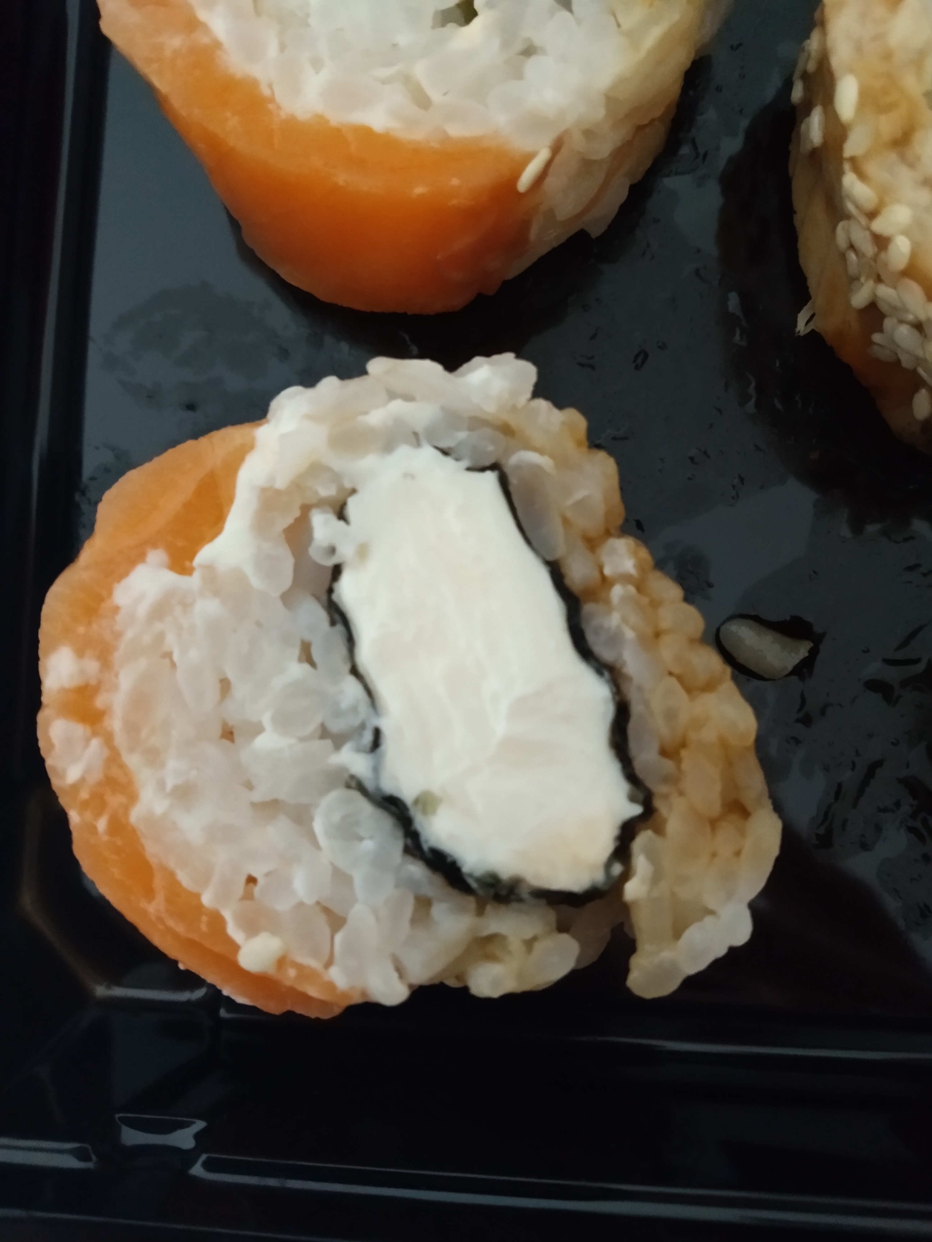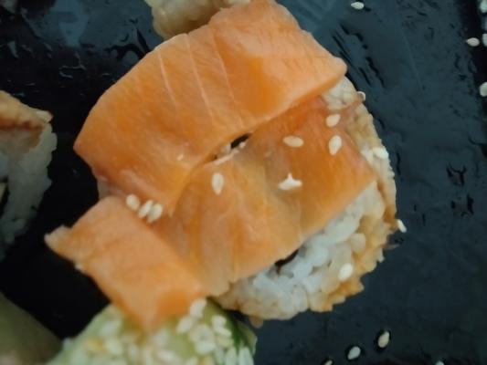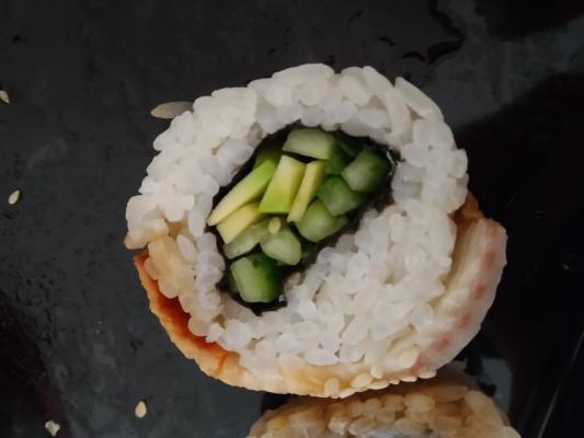 Состав: лосось, огурец, сливочный сыр, соус спайси, кунжут кимчи, соус терияки, кляр, сухари панко