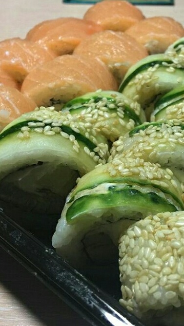 Состав: лосось, огурец, сливочный сыр, соус спайси, кунжут кимчи, соус терияки, кляр, сухари панко