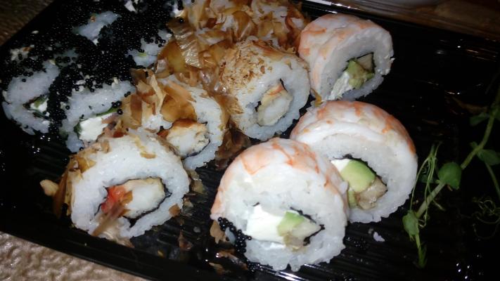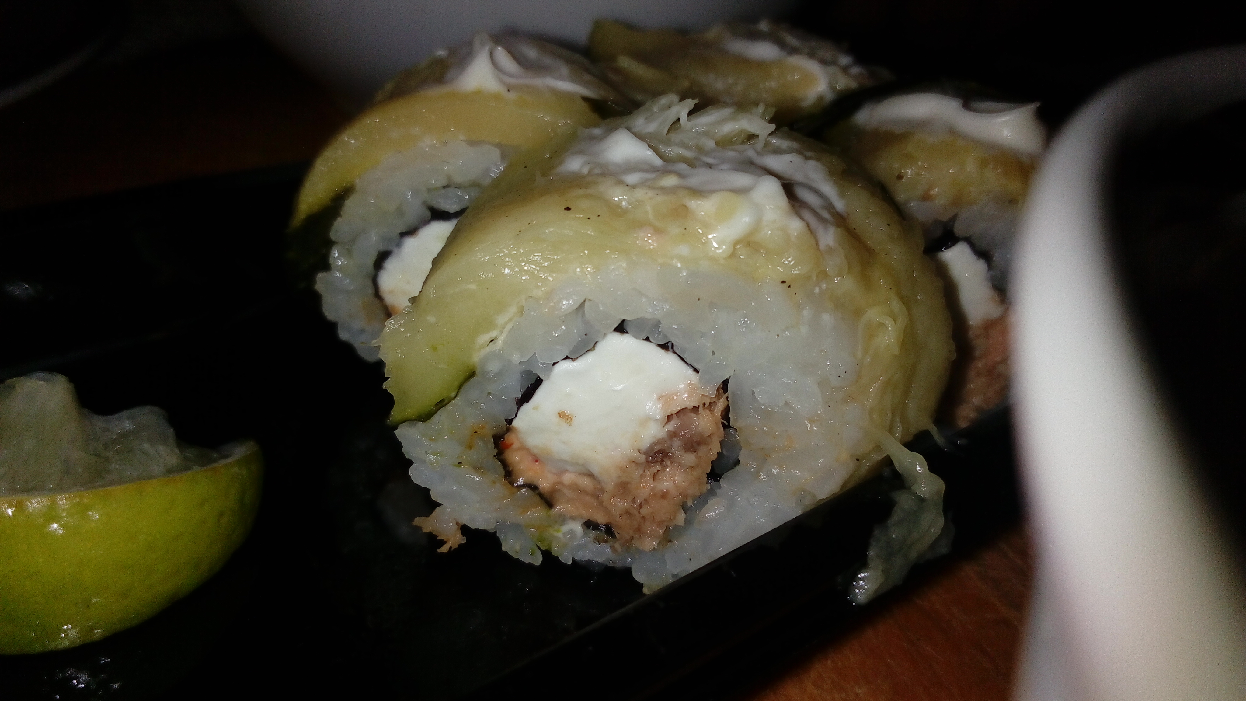 Состав: сунец, авокадо, сливочный сыр, кунжутное масло, картофель пай, соус терияки, кляр, сухари панко