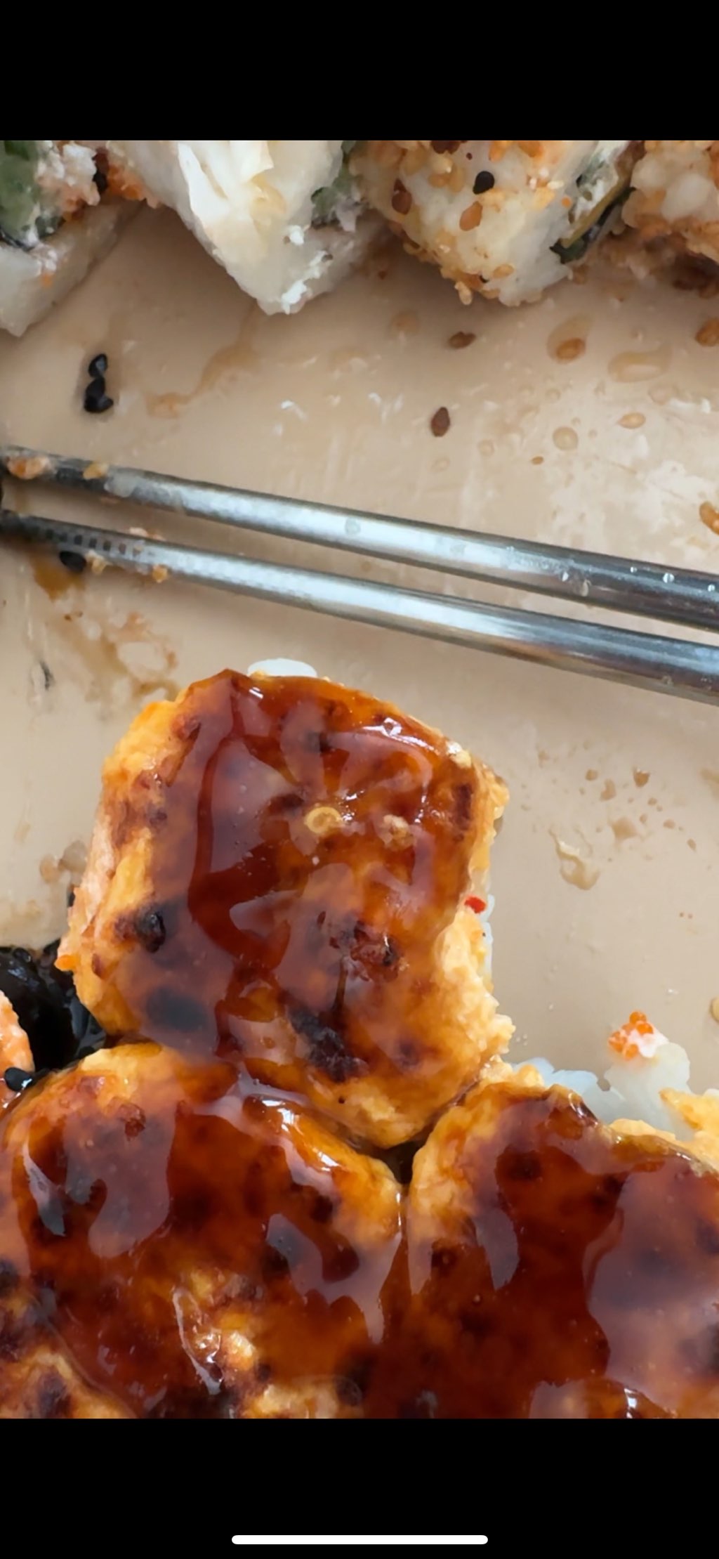 Состав: сунец, авокадо, сливочный сыр, кунжутное масло, картофель пай, соус терияки, кляр, сухари панко