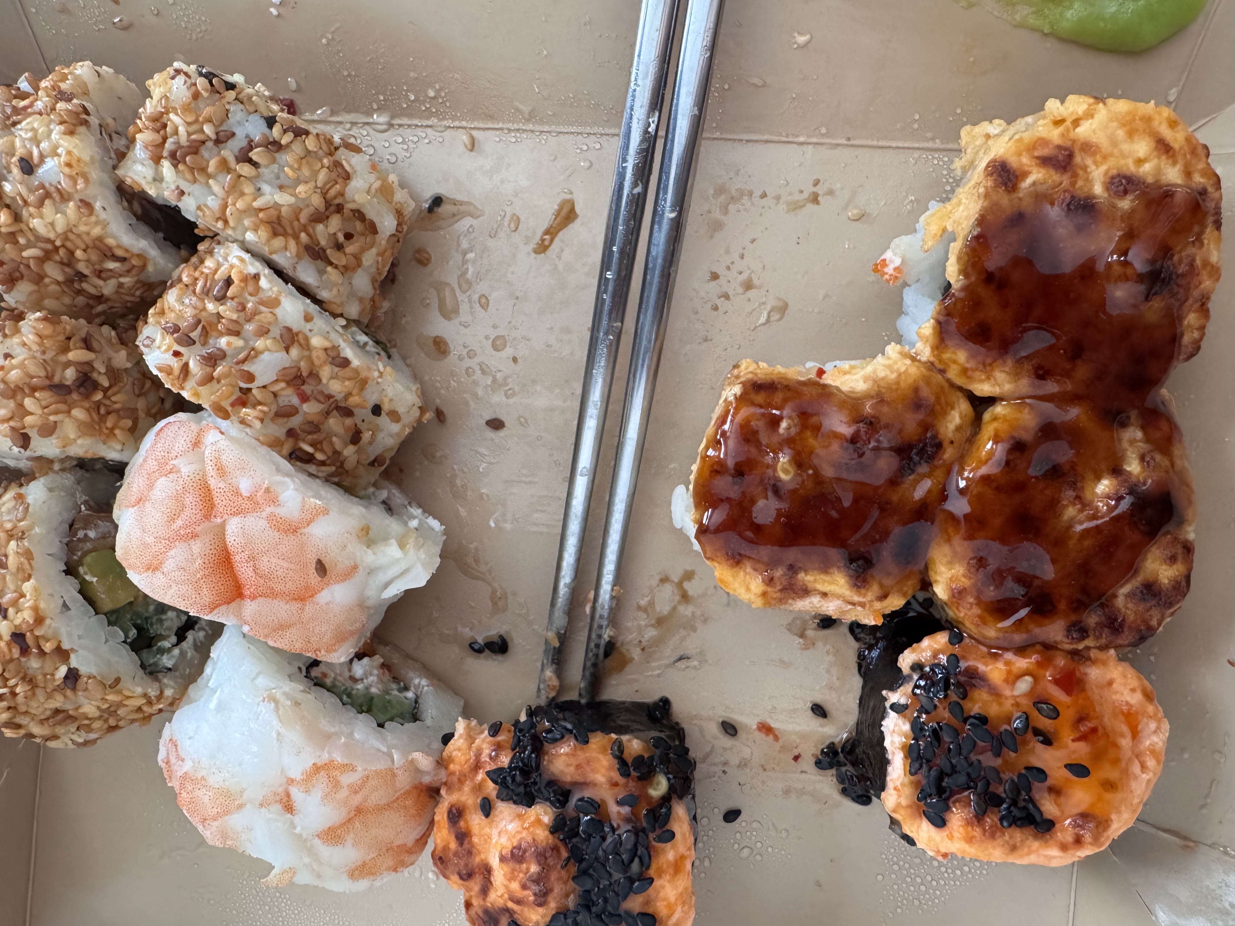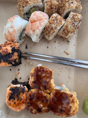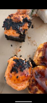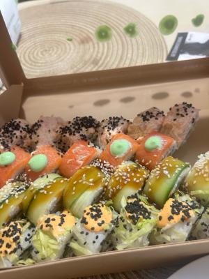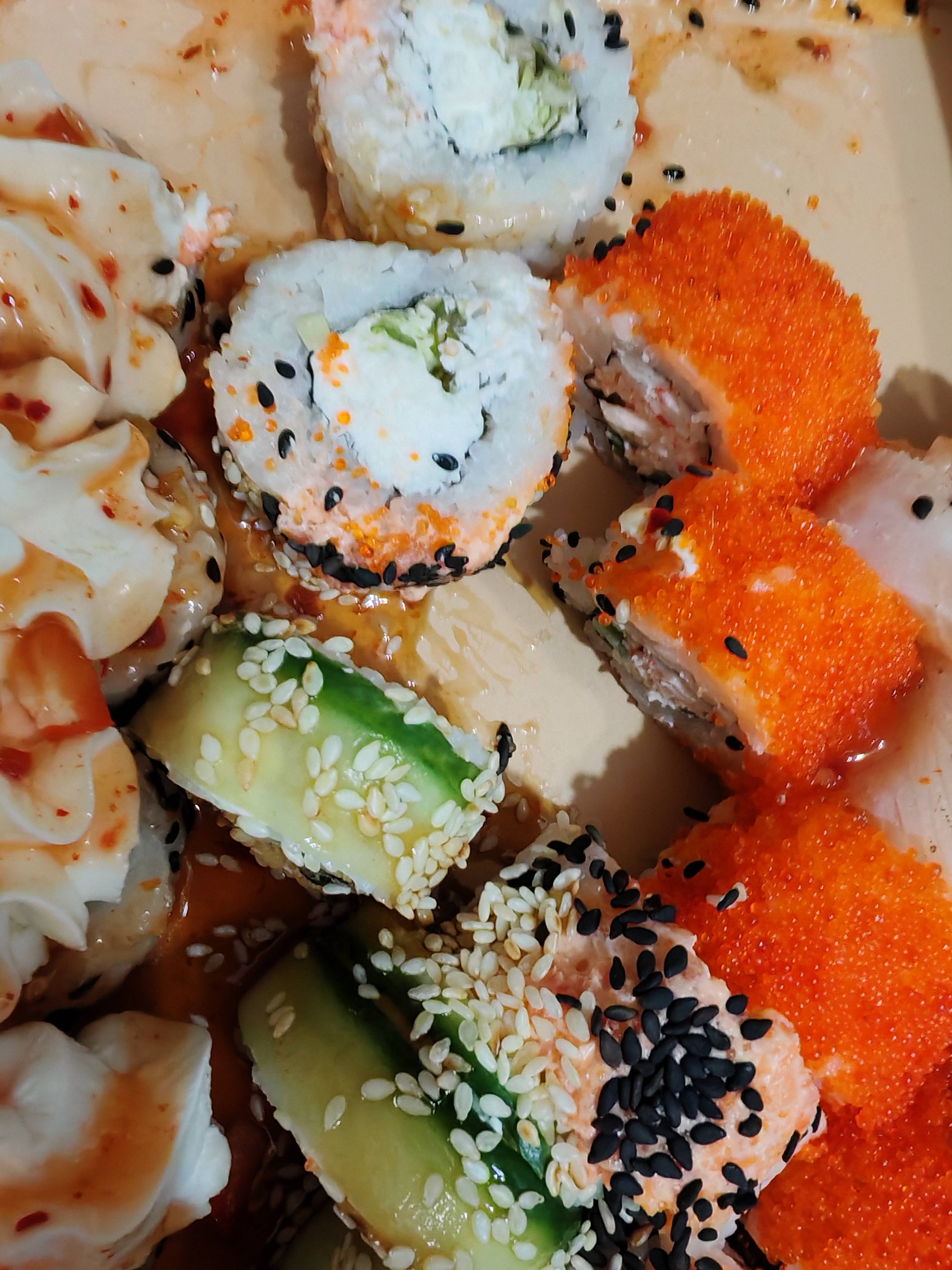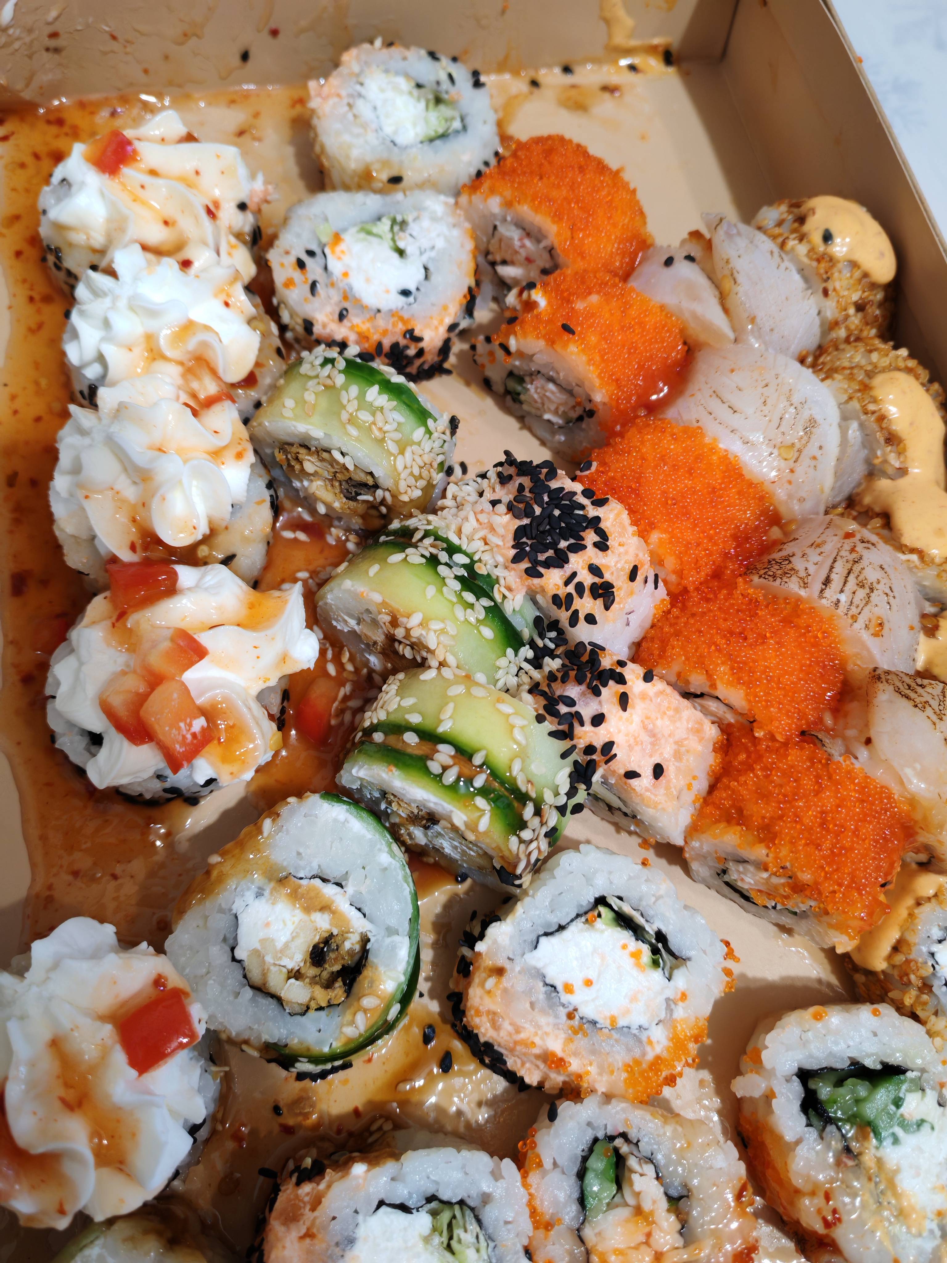 Состав: лосось, огурец, сливочный сыр, соус спайси, кунжут кимчи, соус терияки, кляр, сухари панко