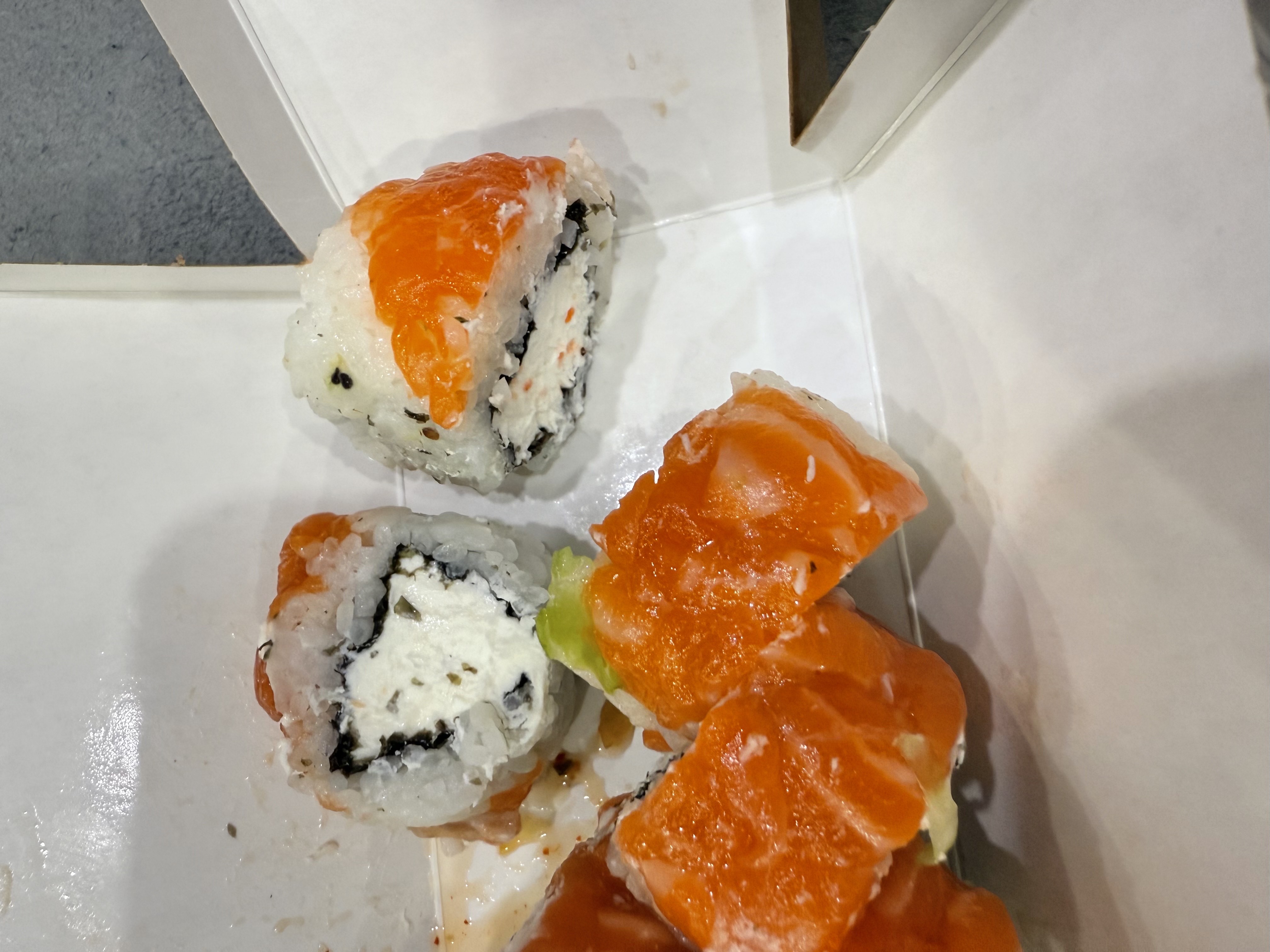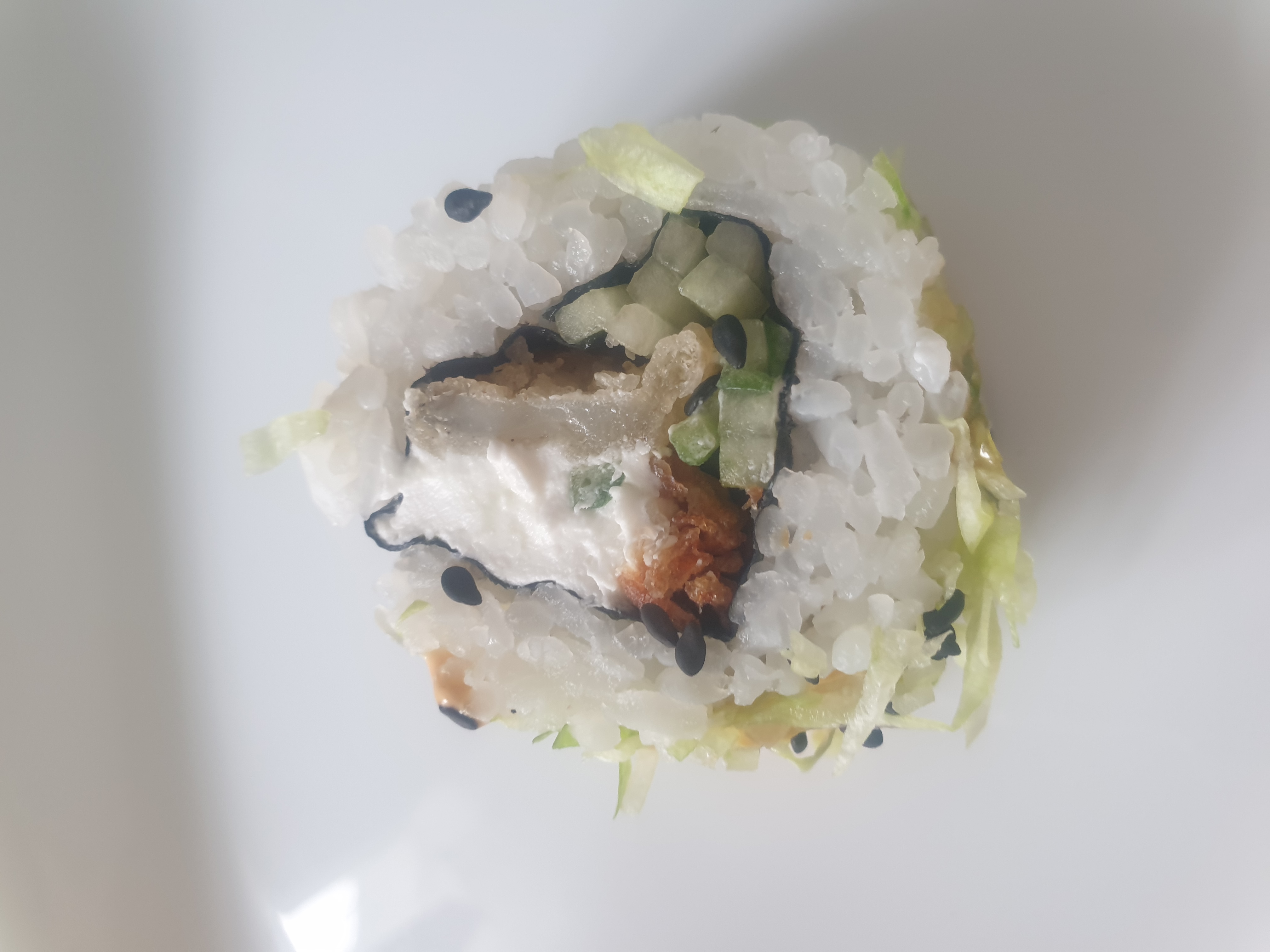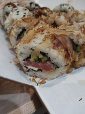 Состав: лосось, огурец, сливочный сыр, соус спайси, кунжут кимчи, соус терияки, кляр, сухари панко