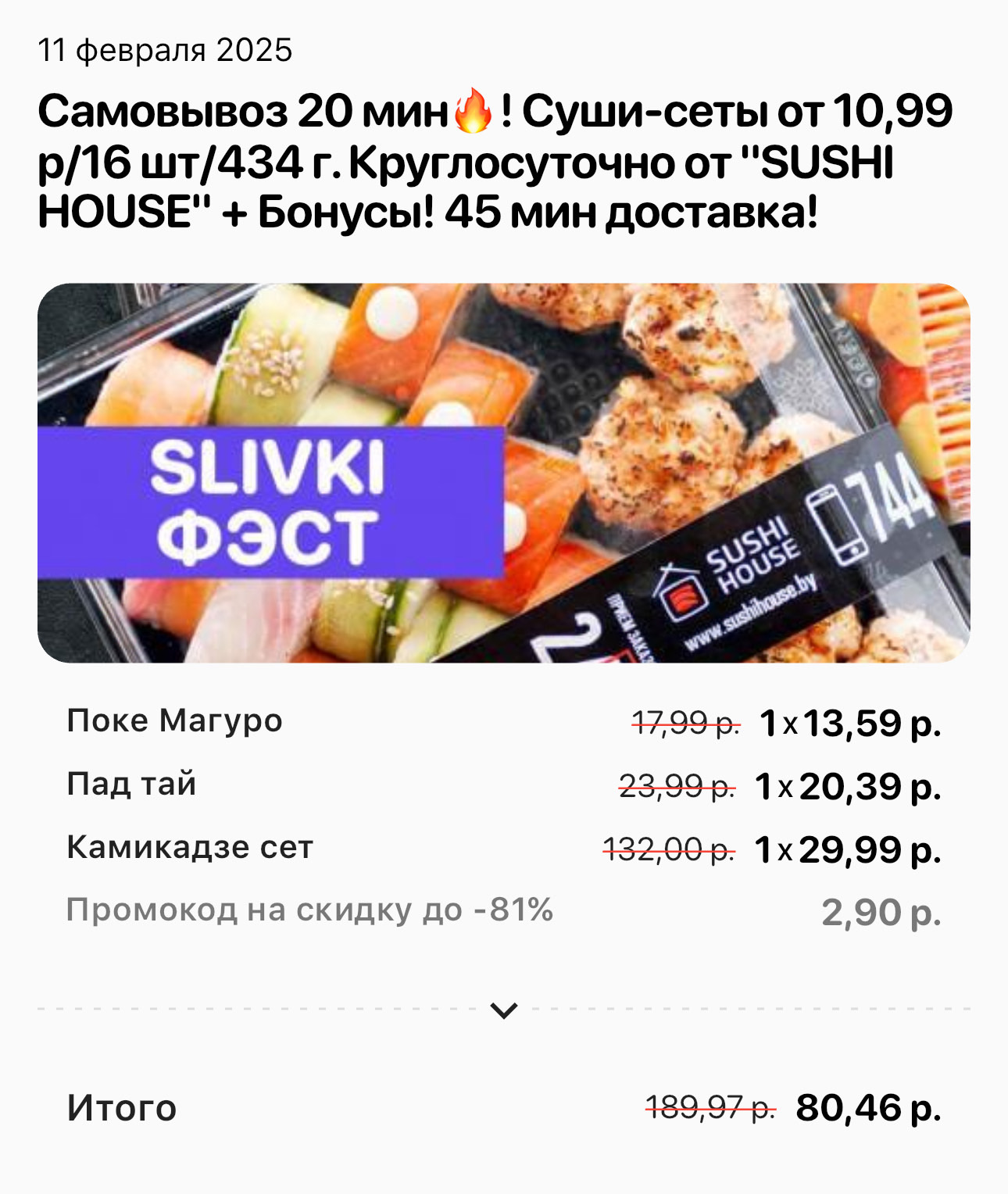 - Промокод дает право на скидку до 59% на сет "Анатолий доплатит" от "SUSHI HOUSE"