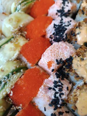 Состав: лосось, огурец, сливочный сыр, соус спайси, кунжут кимчи, соус терияки, кляр, сухари панко