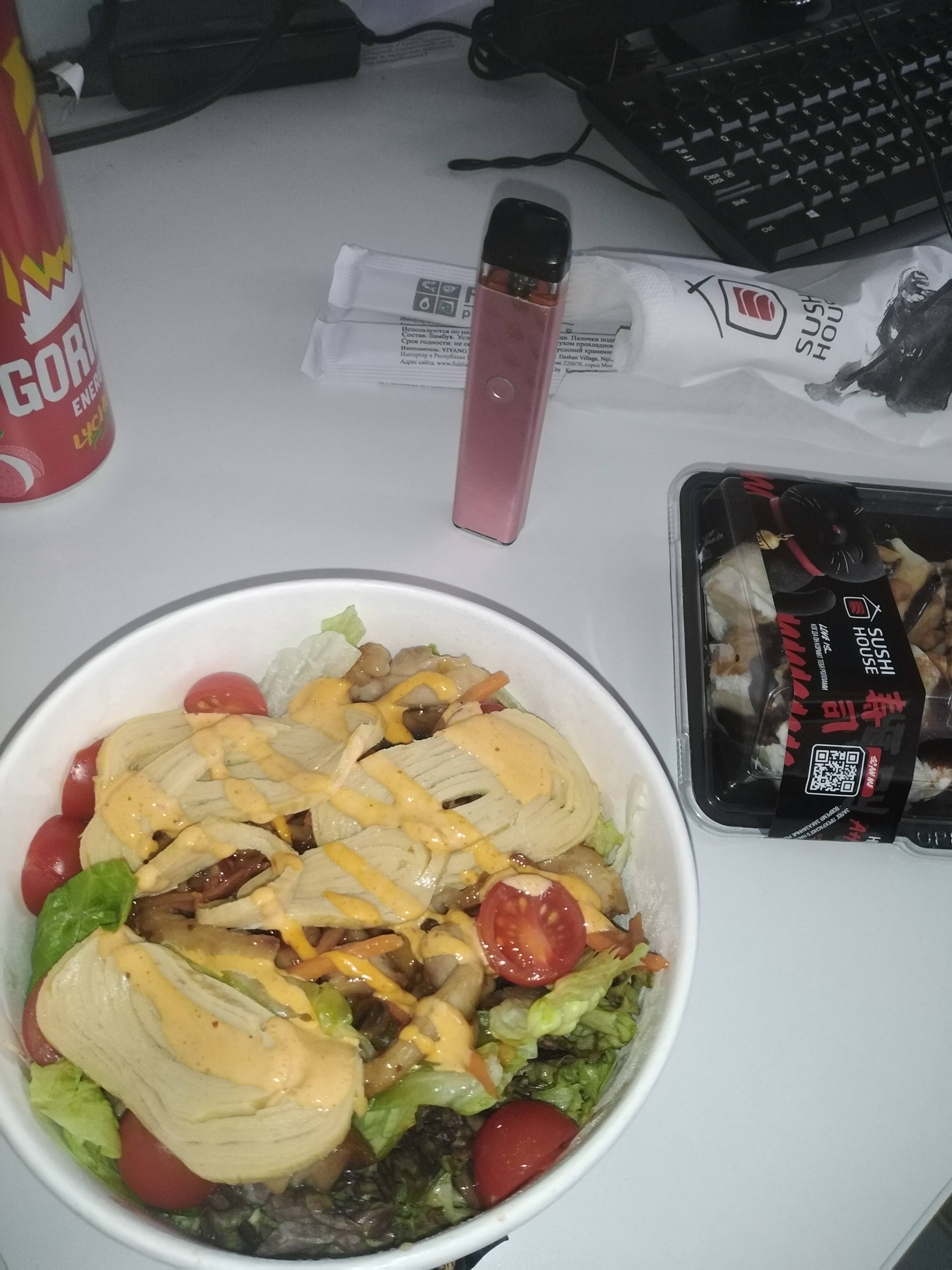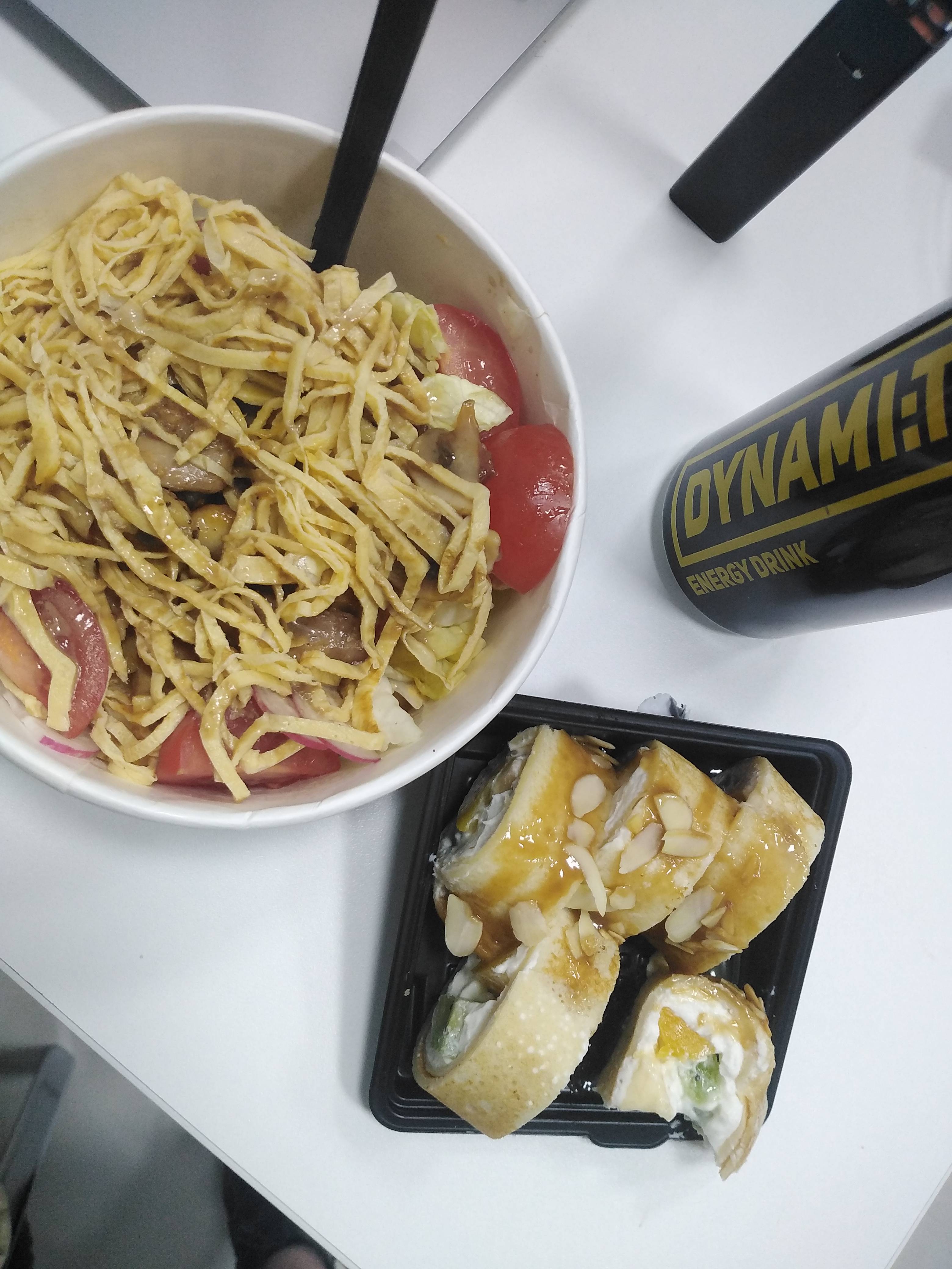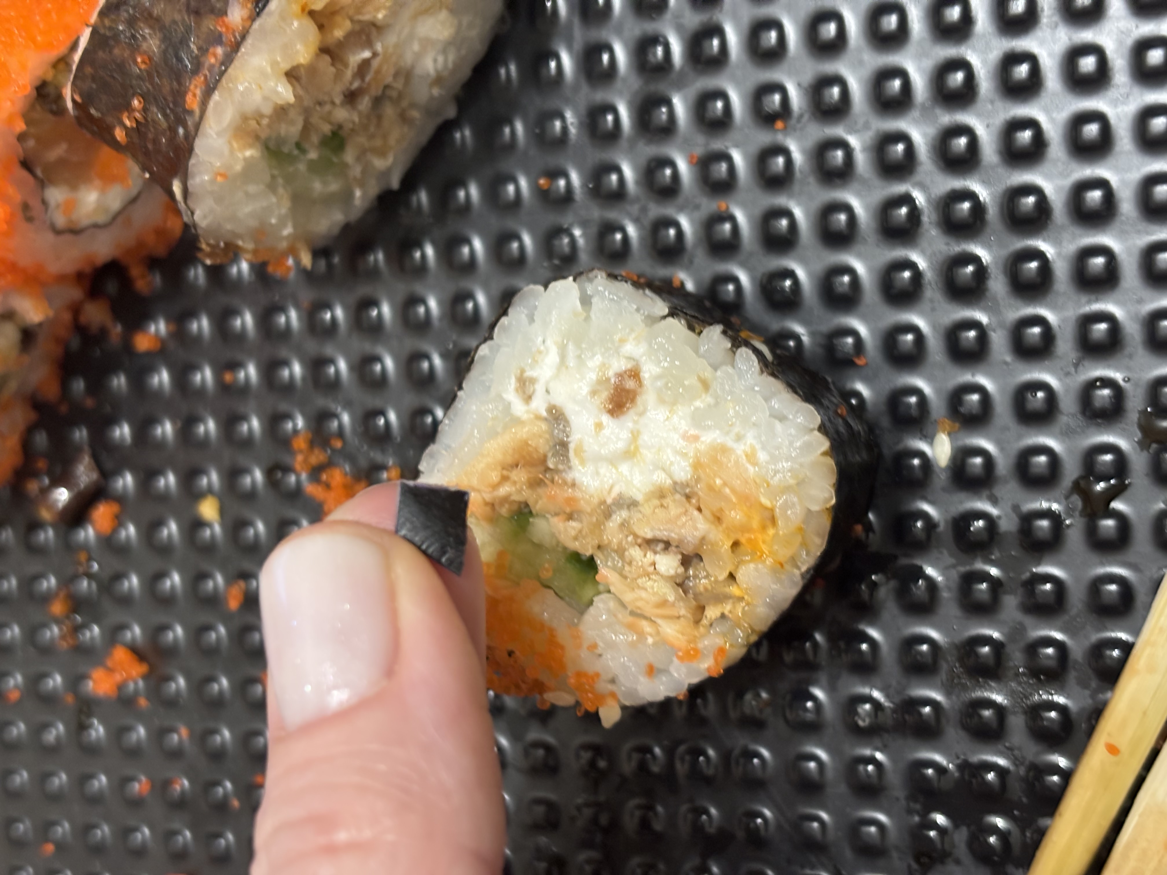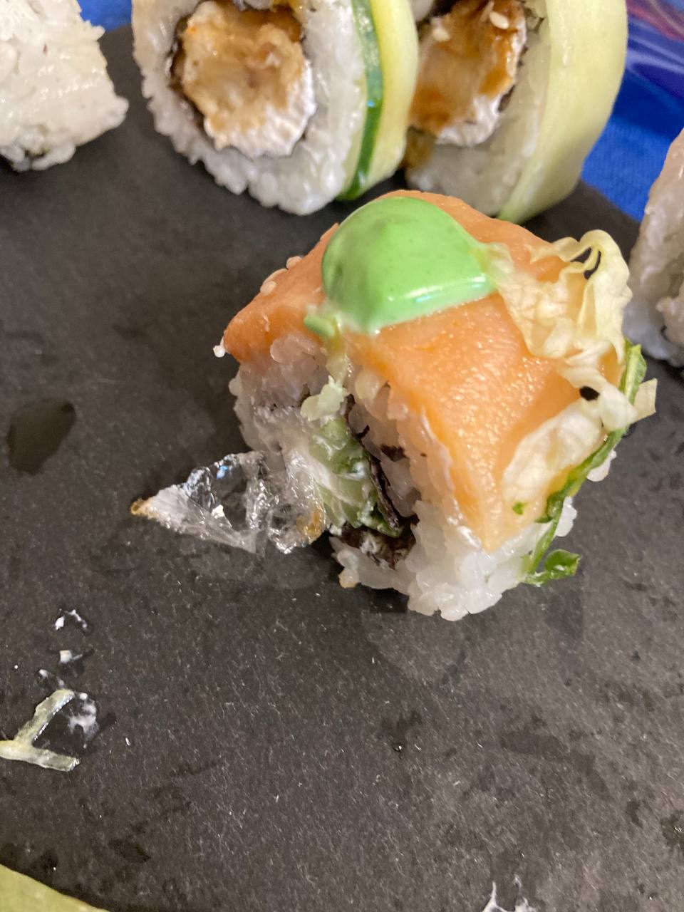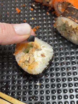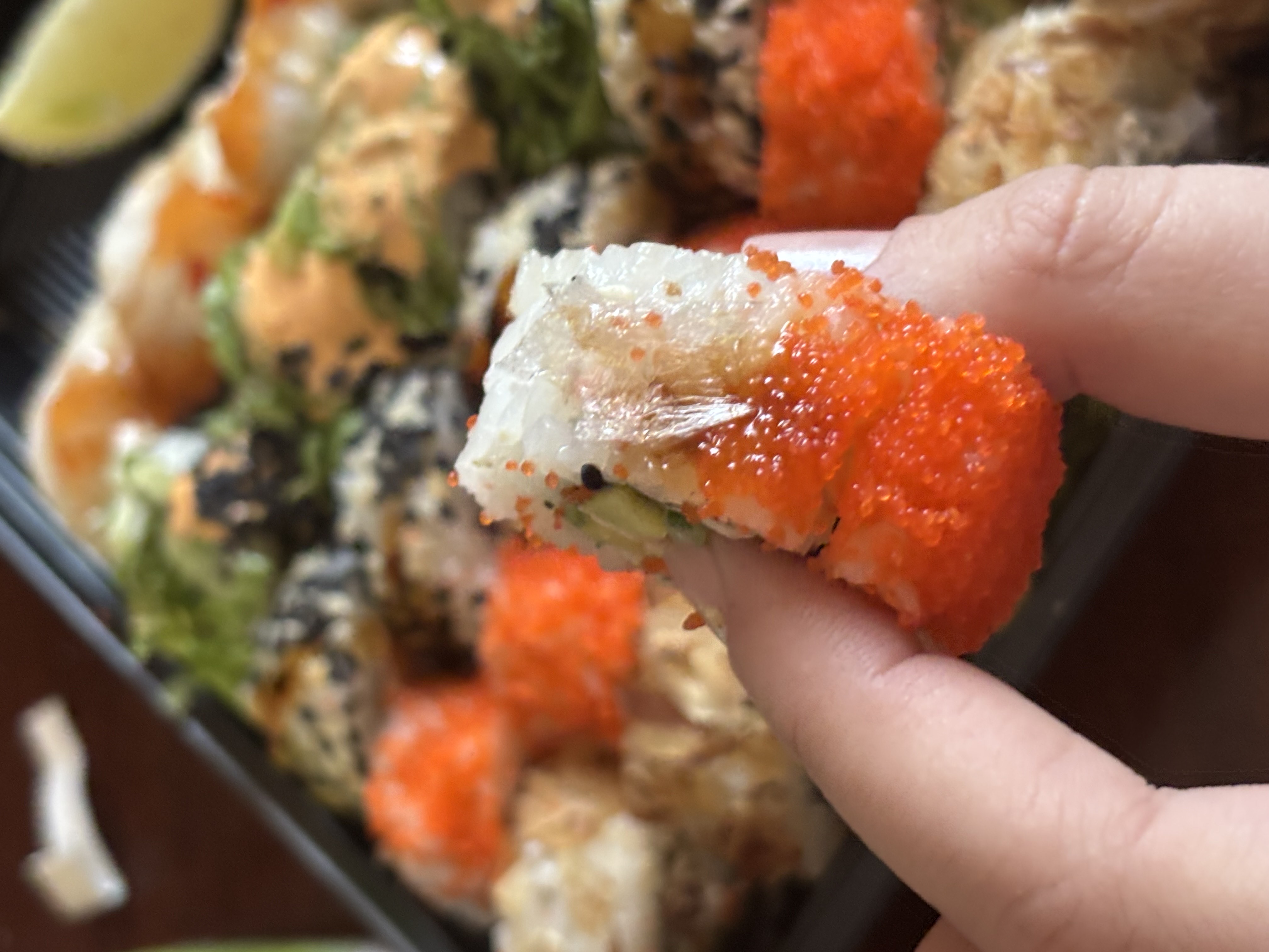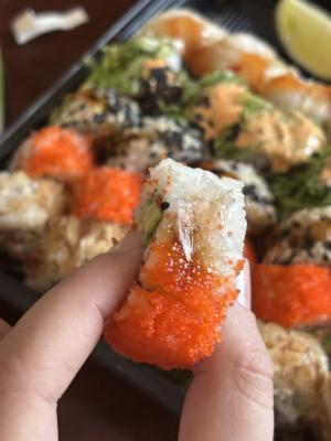 Состав: лосось, огурец, сливочный сыр, соус спайси, кунжут кимчи, соус терияки, кляр, сухари панко
