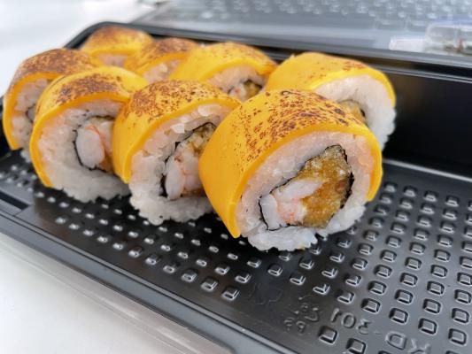 Состав: краб микс, сыр чеддер, огурец, чипс бекона, сливочный сыр, соус терияки, кляр, сухари панко