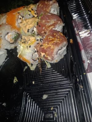 Состав: краб микс, сыр чеддер, огурец, чипс бекона, сливочный сыр, соус терияки, кляр, сухари панко