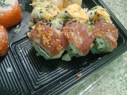 Состав: лосось, огурец, сливочный сыр, соус спайси, кунжут кимчи, соус терияки, кляр, сухари панко