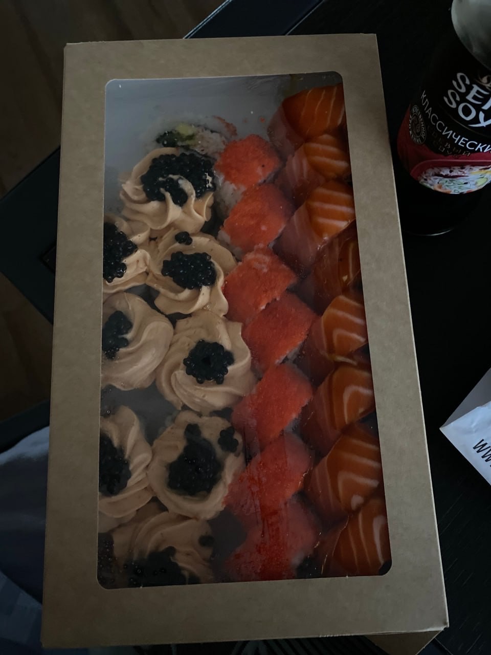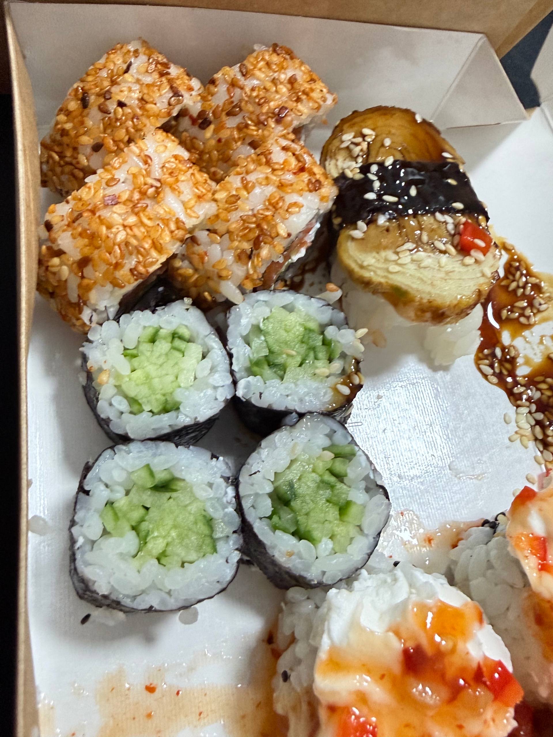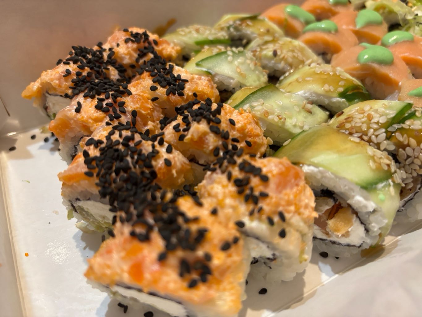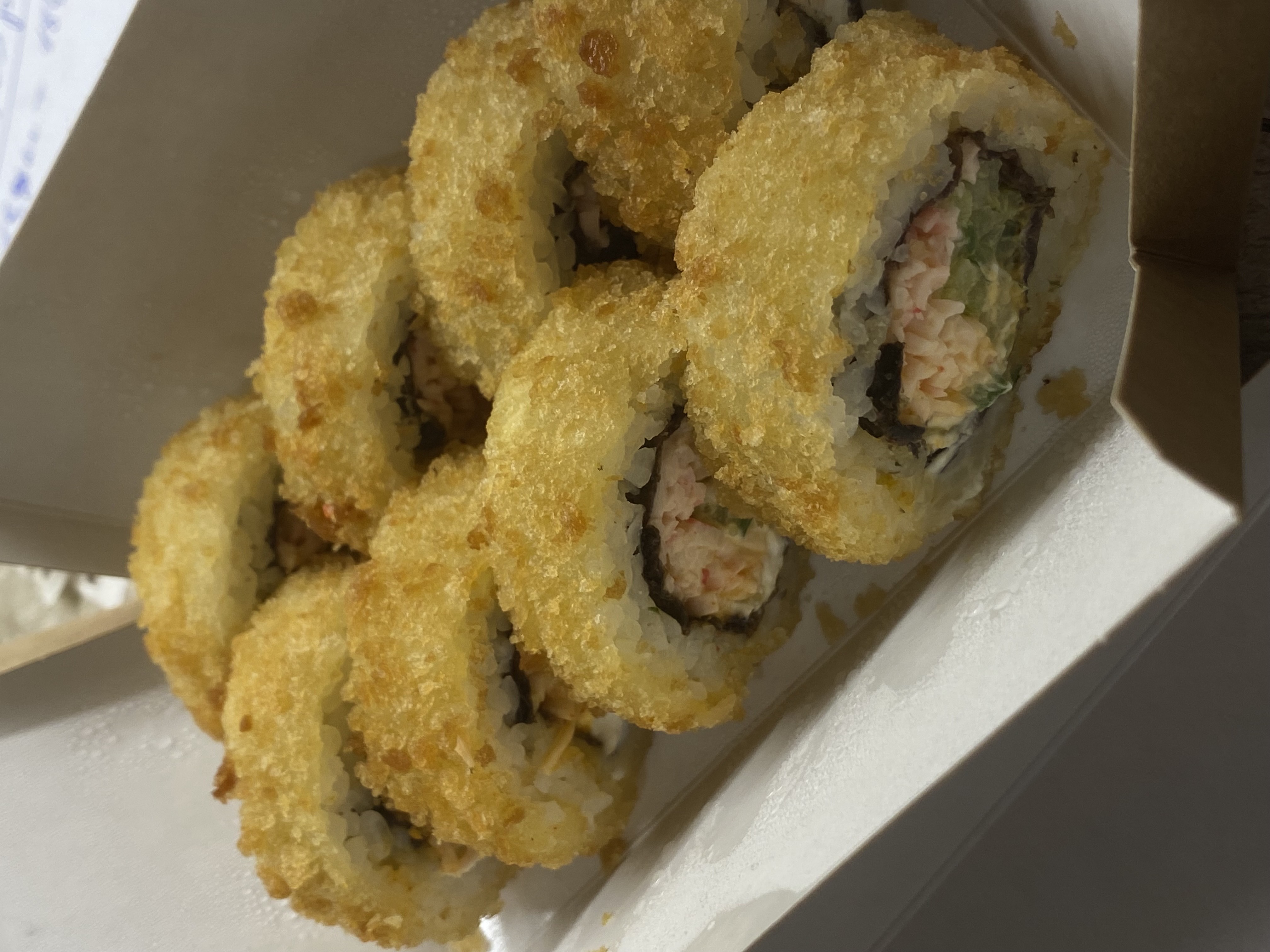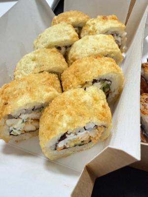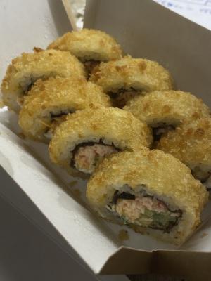 Состав: лосось, огурец, сливочный сыр, соус спайси, кунжут кимчи, соус терияки, кляр, сухари панко