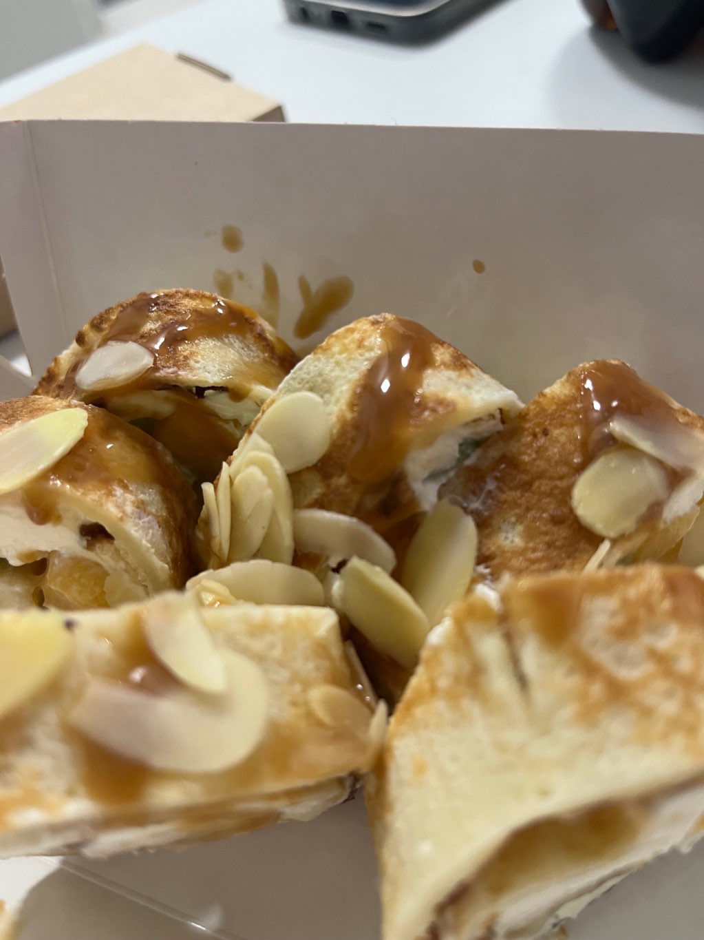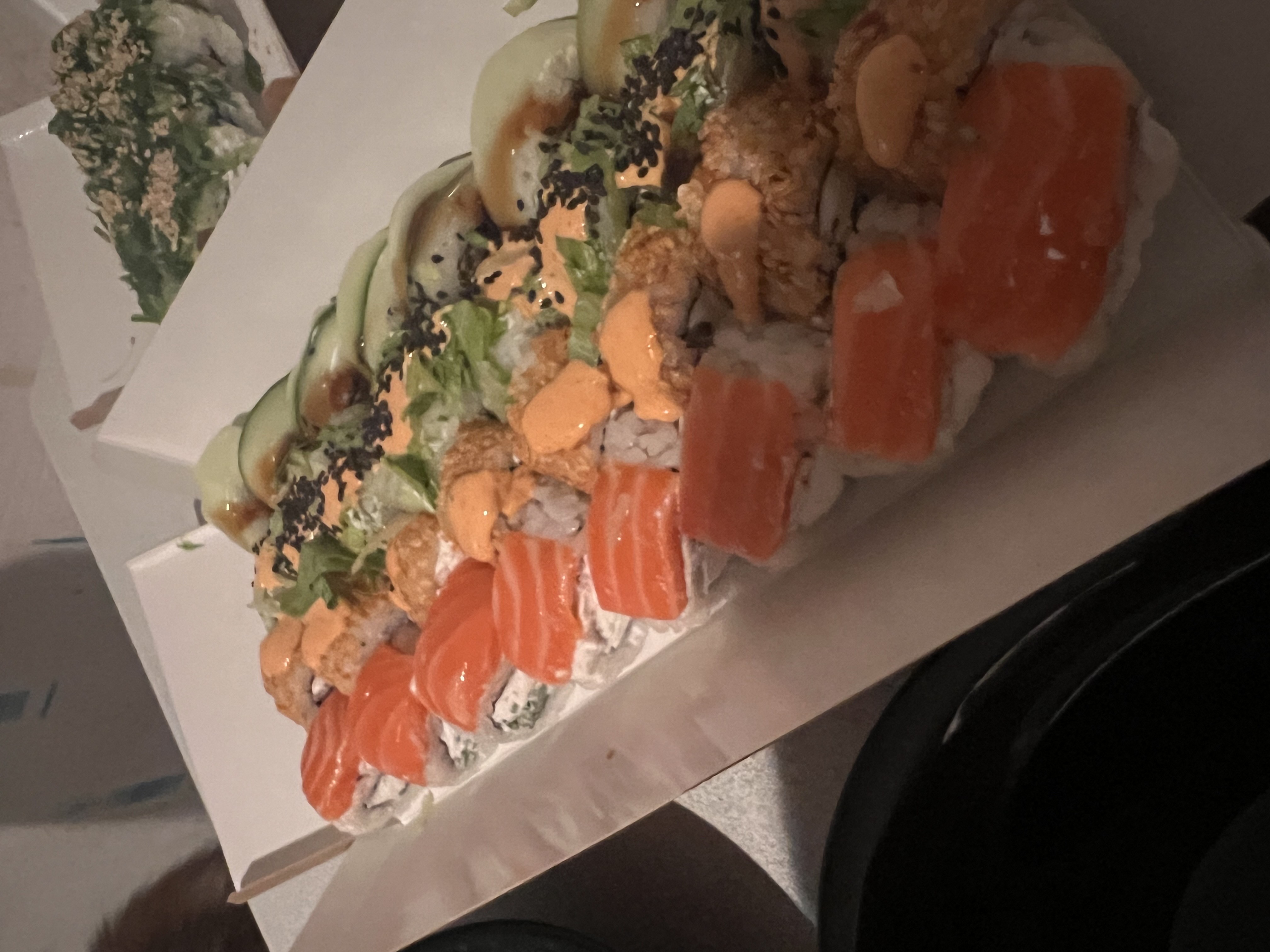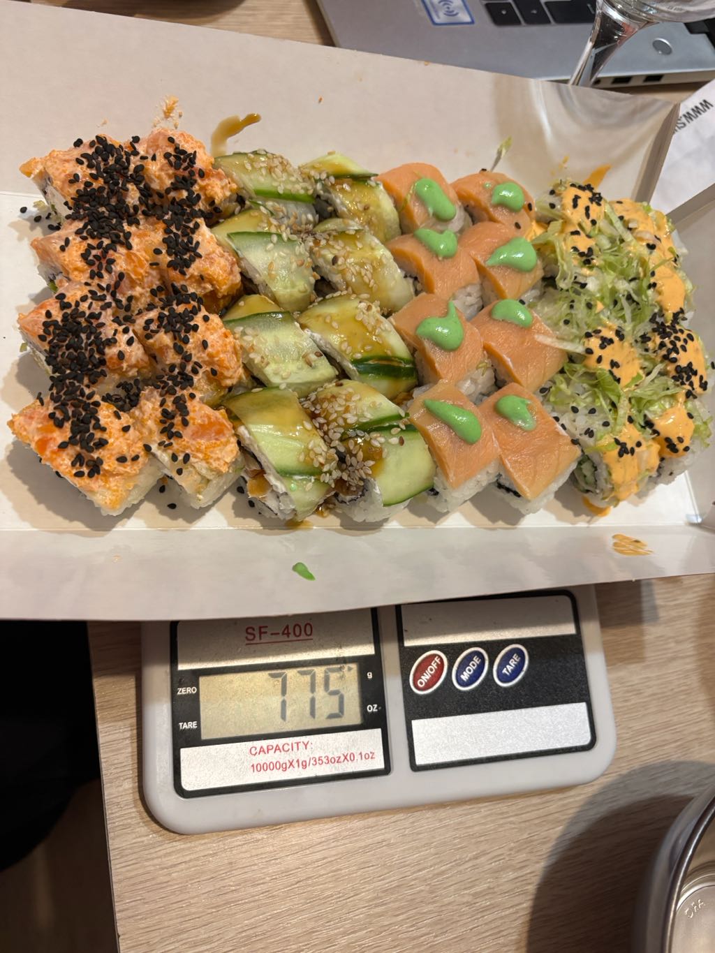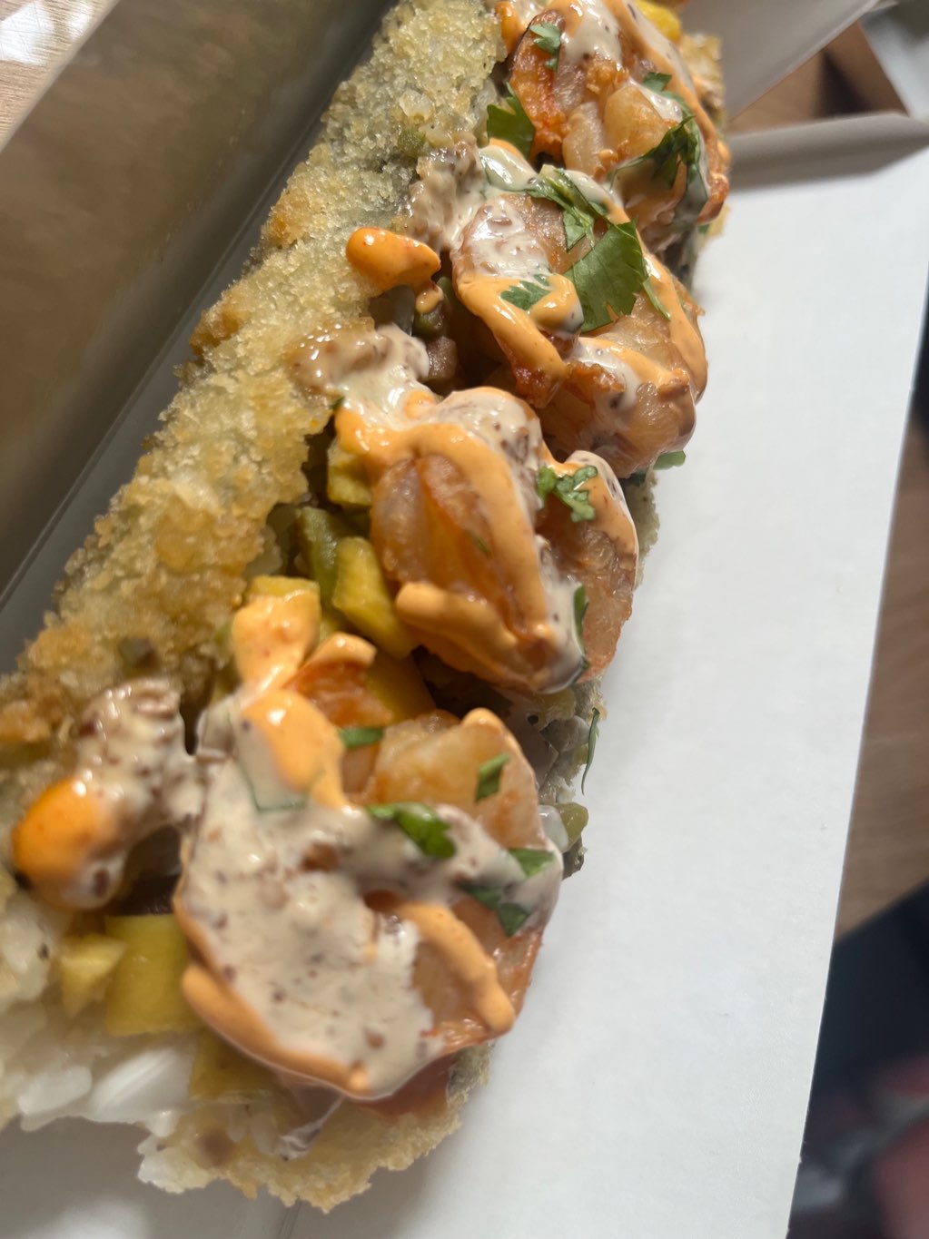 Состав: лосось, огурец, сливочный сыр, соус спайси, кунжут кимчи, соус терияки, кляр, сухари панко