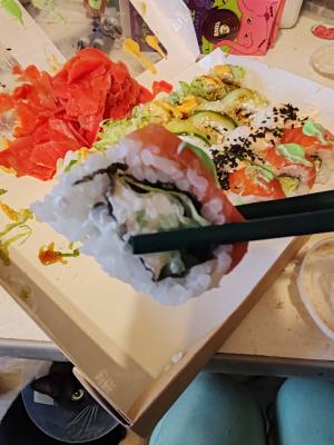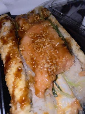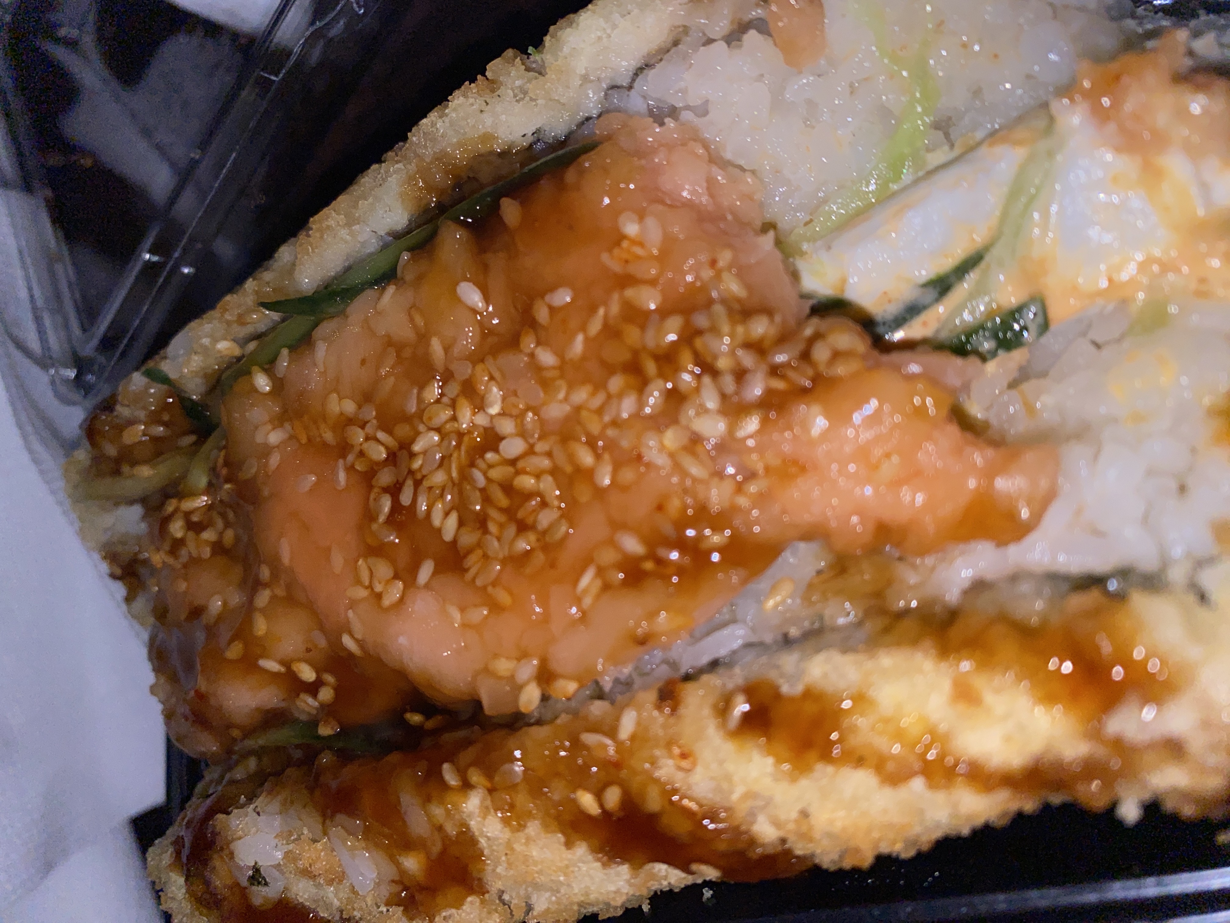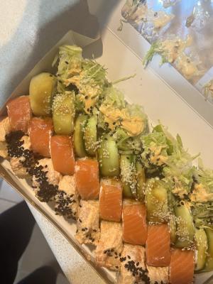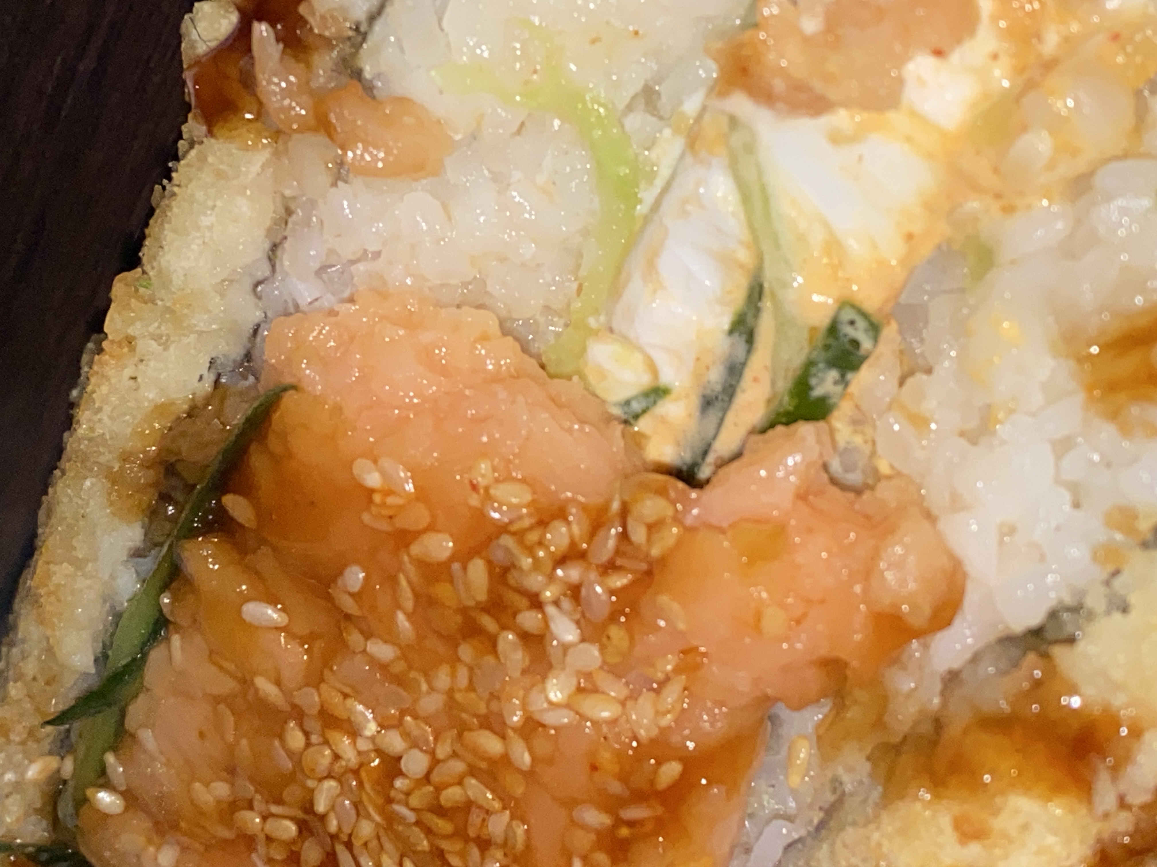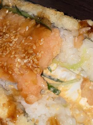 Состав: лосось, огурец, сливочный сыр, соус спайси, кунжут кимчи, соус терияки, кляр, сухари панко