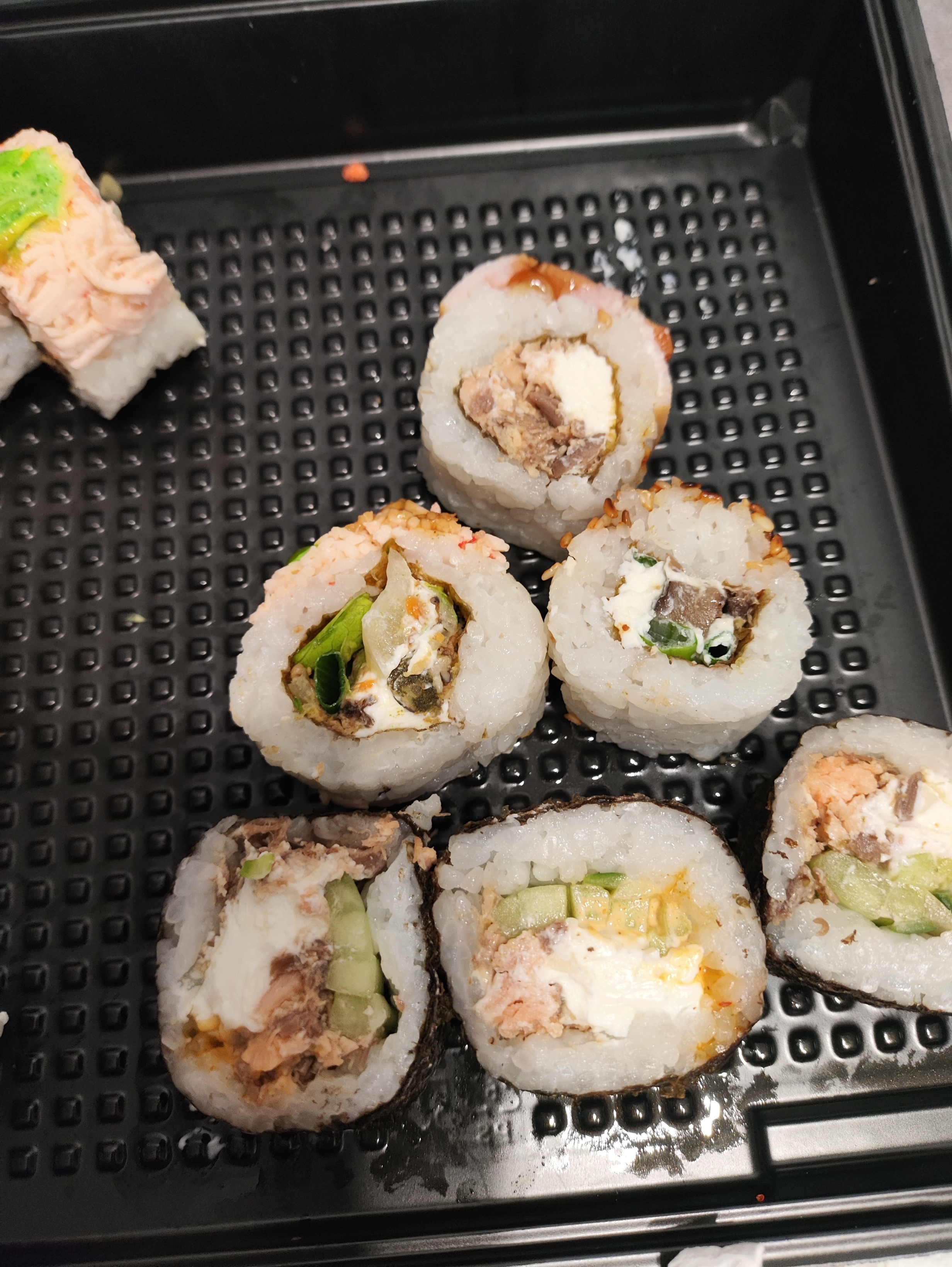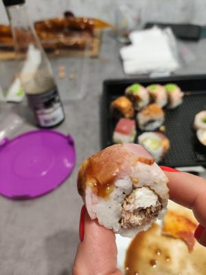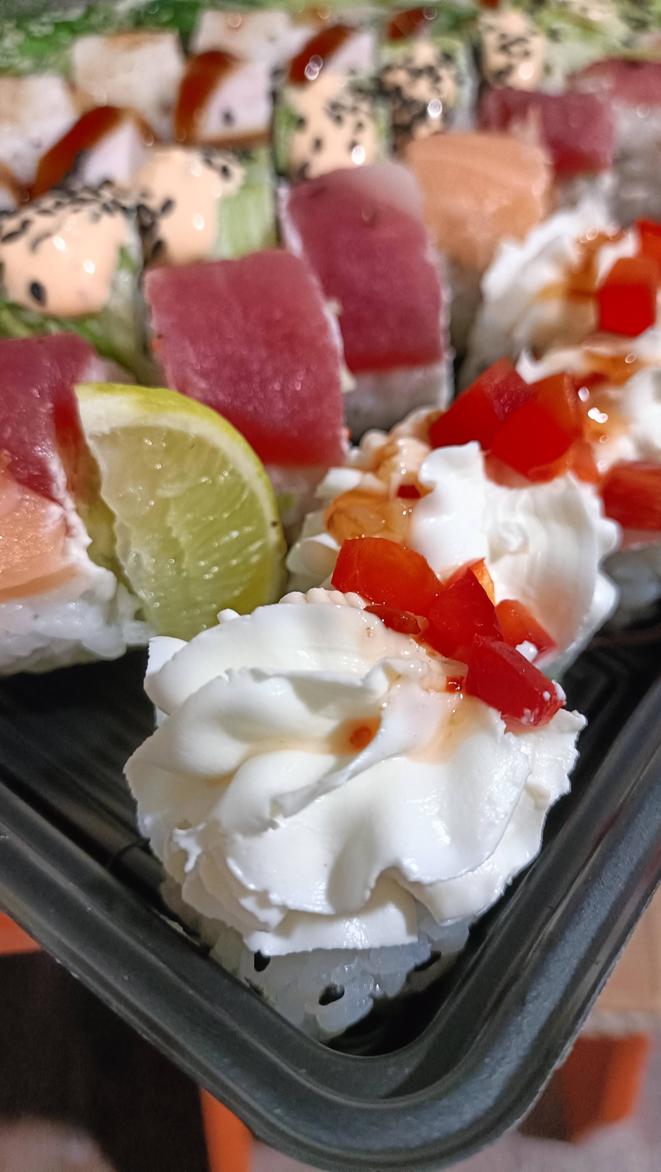 Состав: лосось, огурец, сливочный сыр, соус спайси, кунжут кимчи, соус терияки, кляр, сухари панко