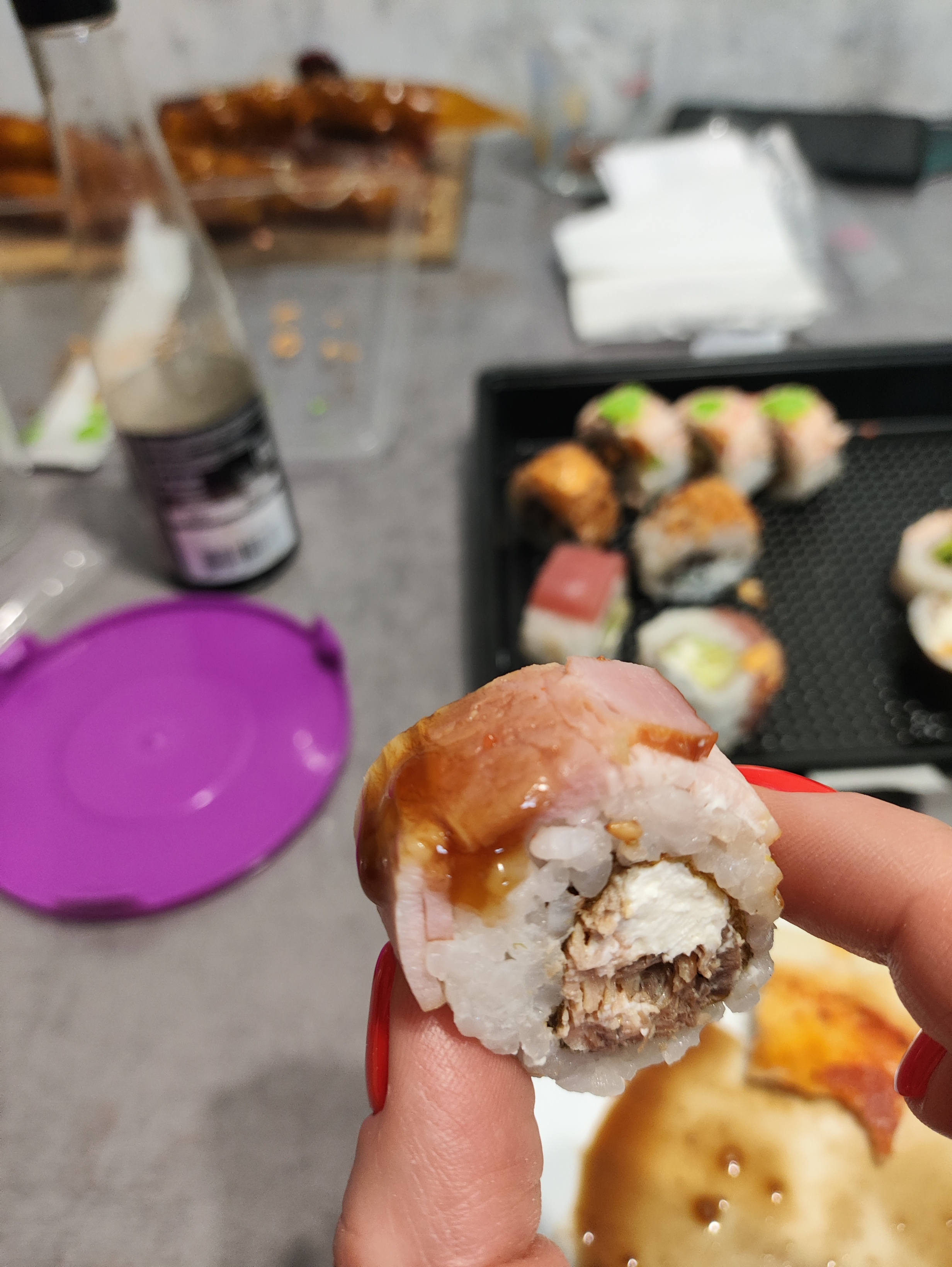 Состав: краб микс, сыр чеддер, огурец, чипс бекона, сливочный сыр, соус терияки, кляр, сухари панко