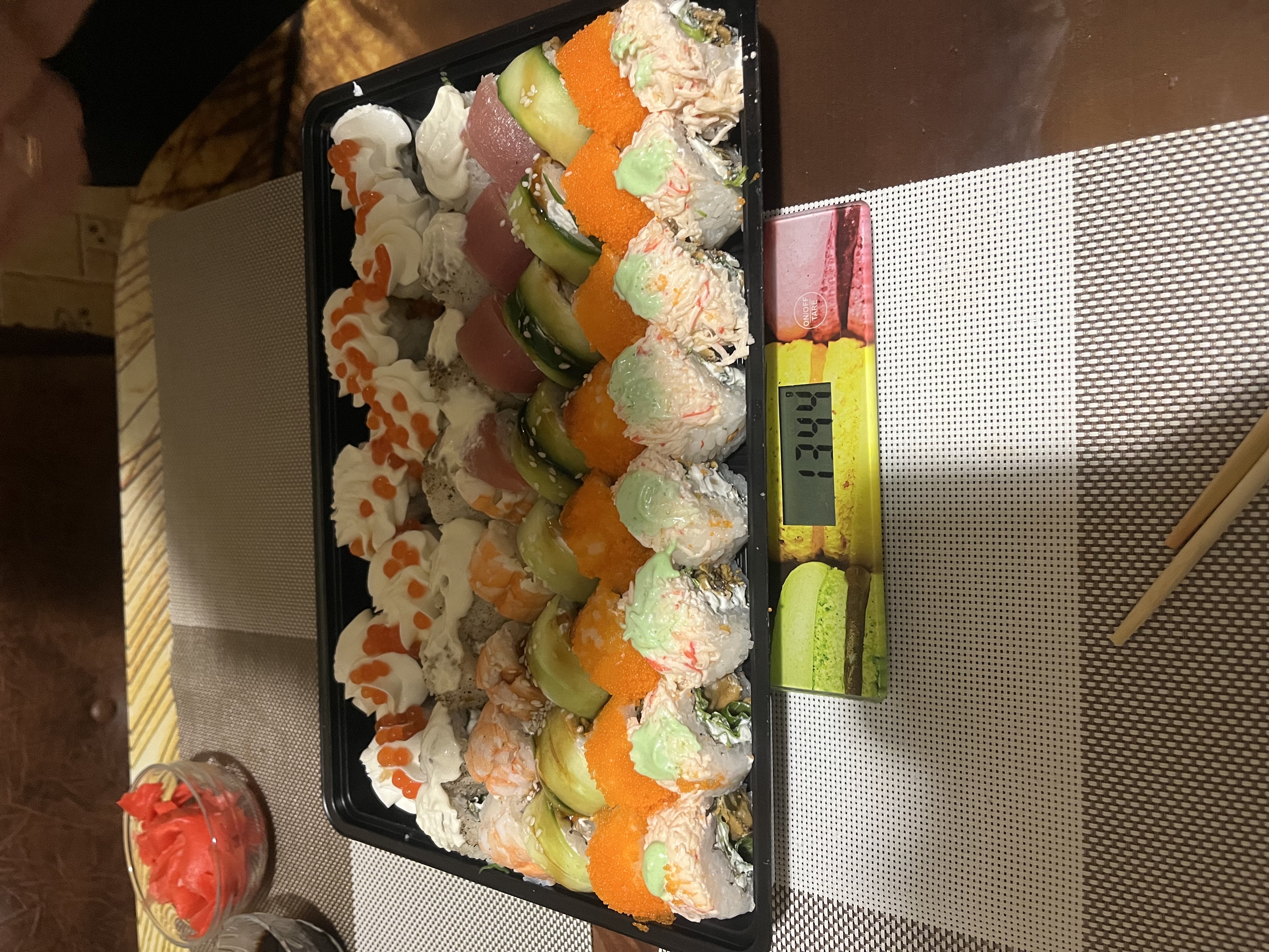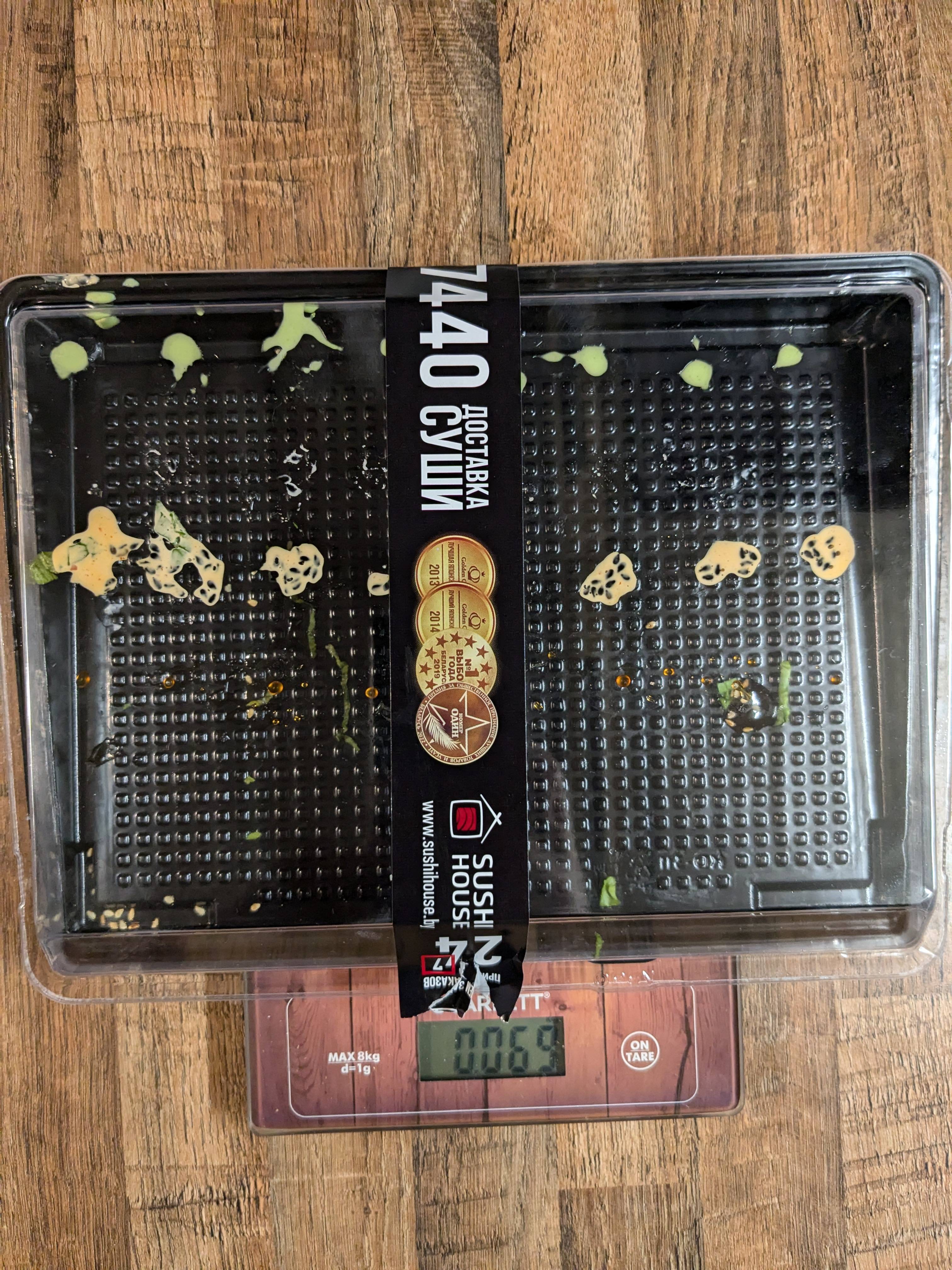 Суши просто размером с ноготок, недовес. Отдельное спасибо за камень в них, муж чуть не сломал зуб.