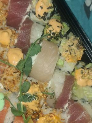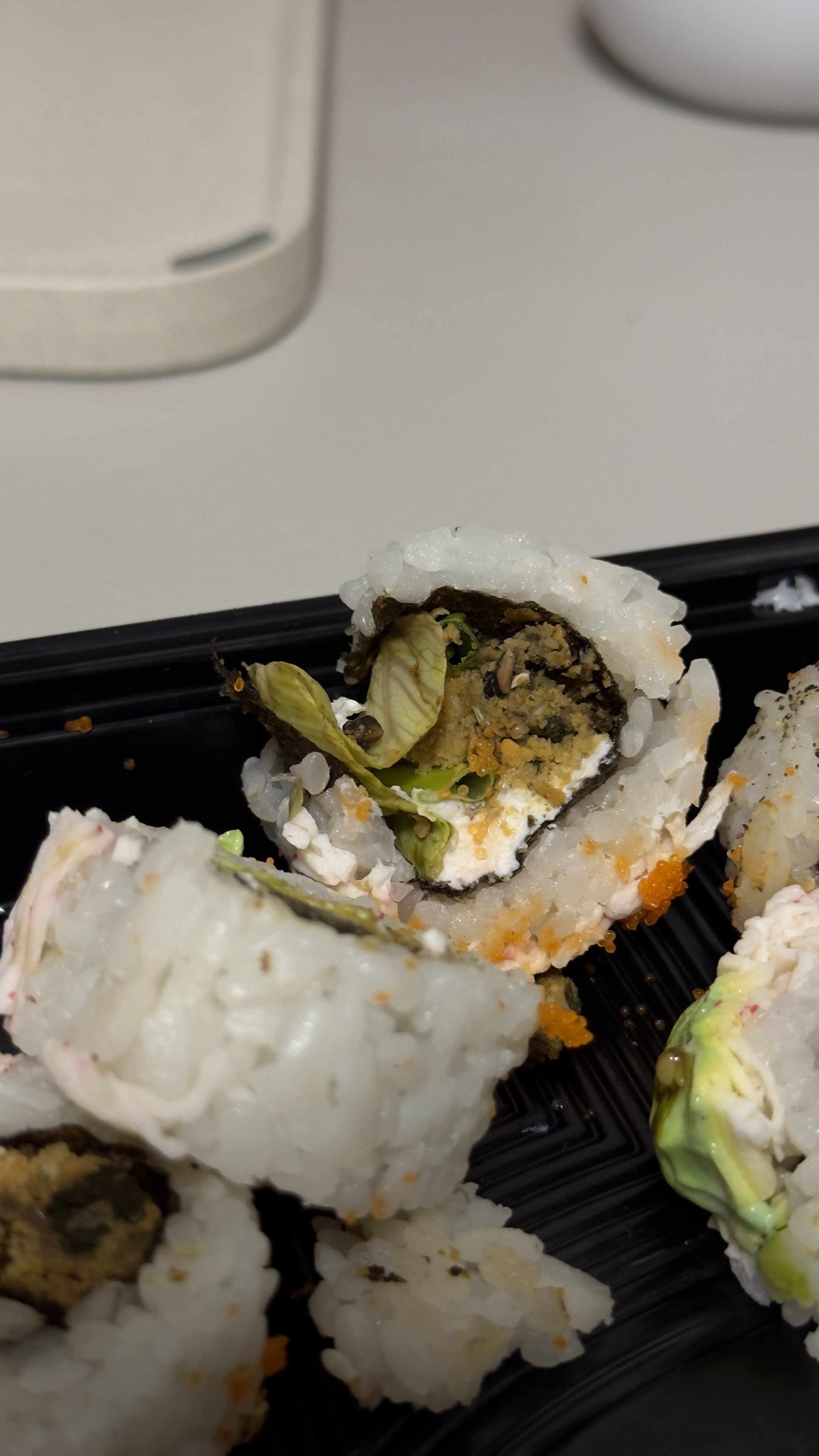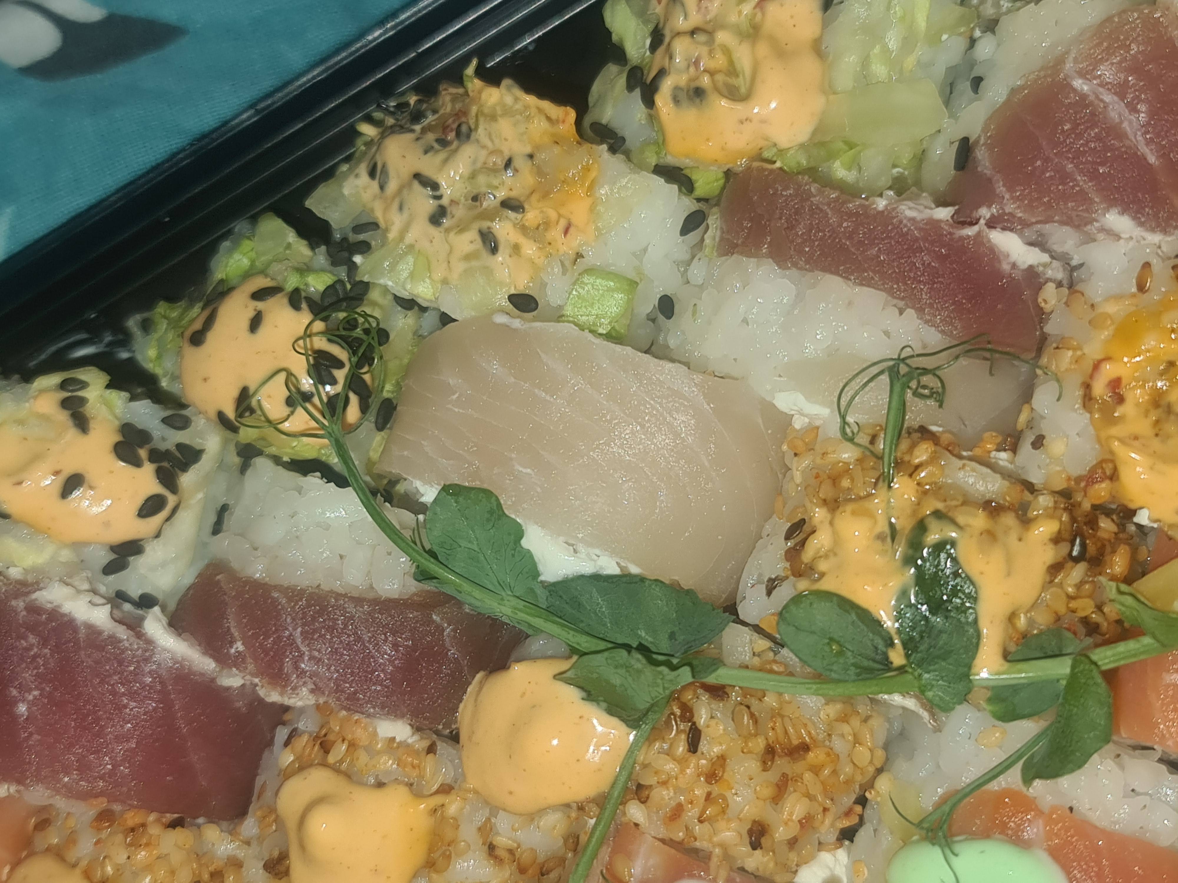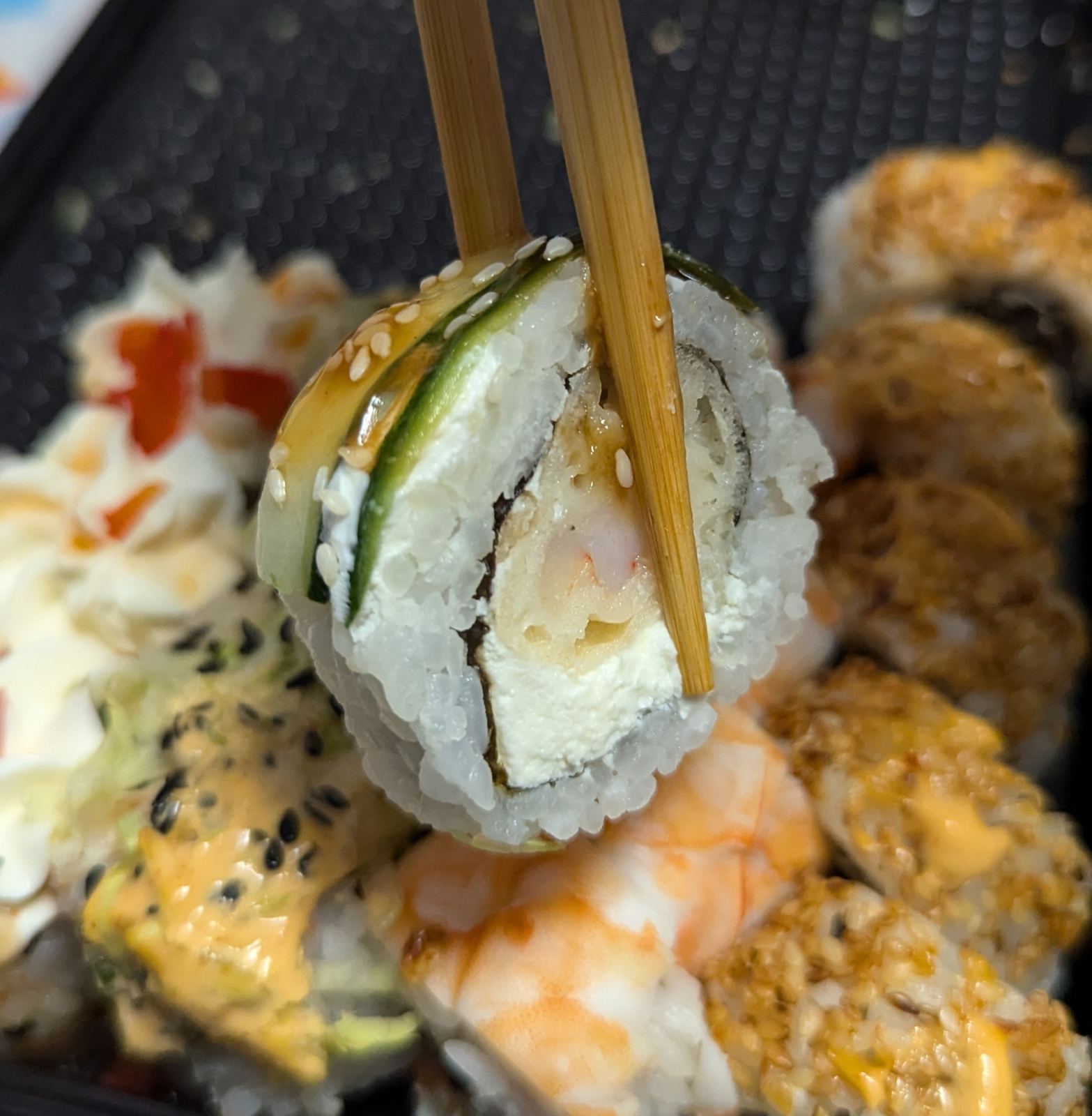 Состав: лосось, огурец, сливочный сыр, соус спайси, кунжут кимчи, соус терияки, кляр, сухари панко