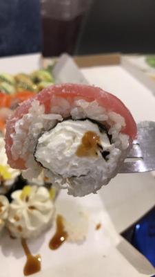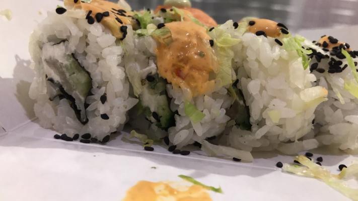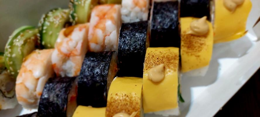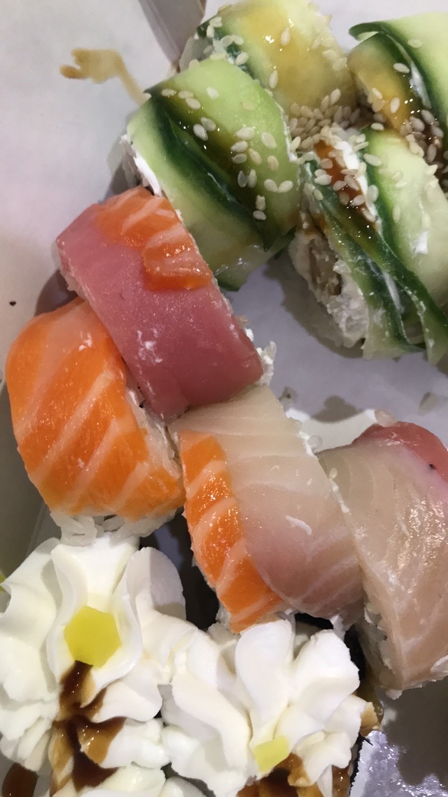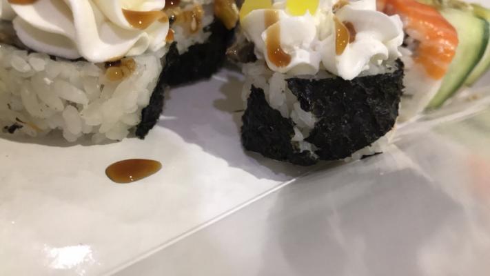 Состав: лосось, огурец, сливочный сыр, соус спайси, кунжут кимчи, соус терияки, кляр, сухари панко